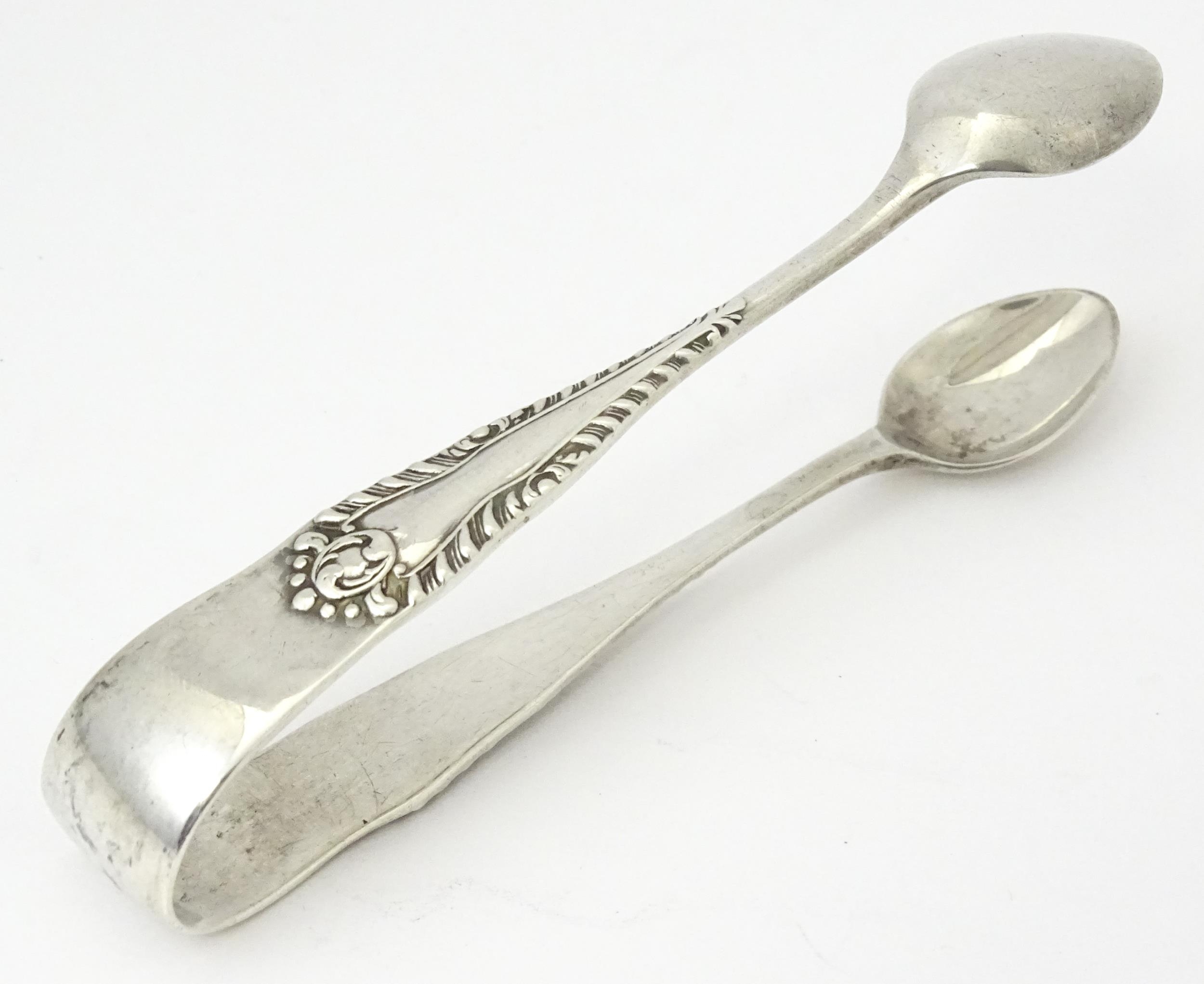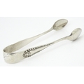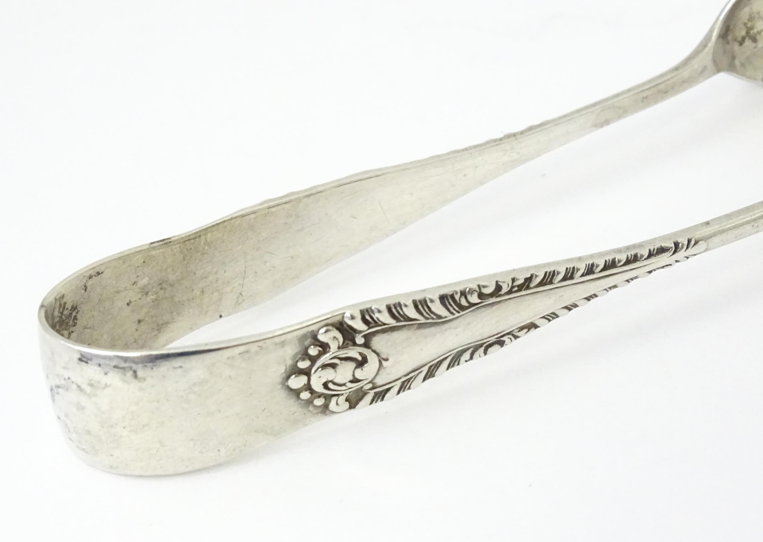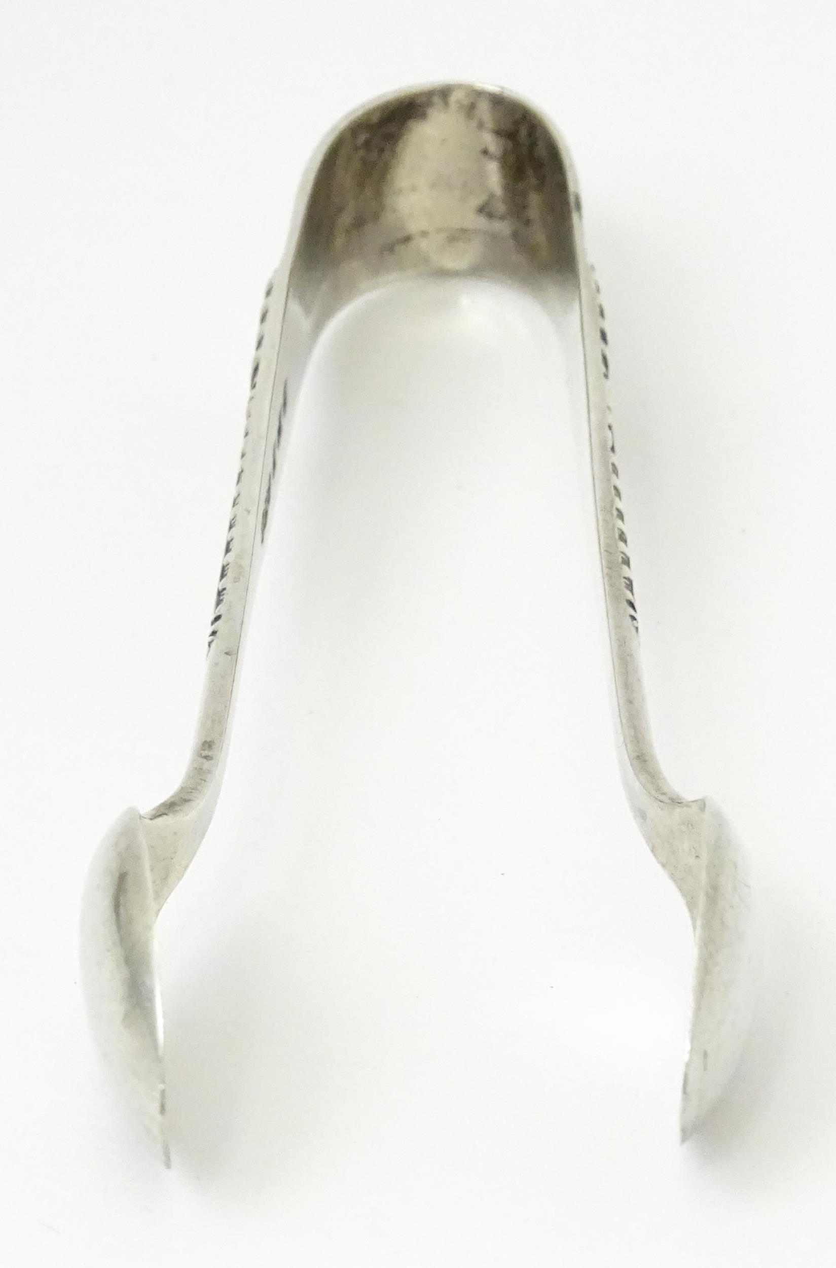 Silver sugar tongs with engraved decoration, hallmarked Birmingham 1929, maker Joseph Gloster Ltd. Approx. 3 3/4" long