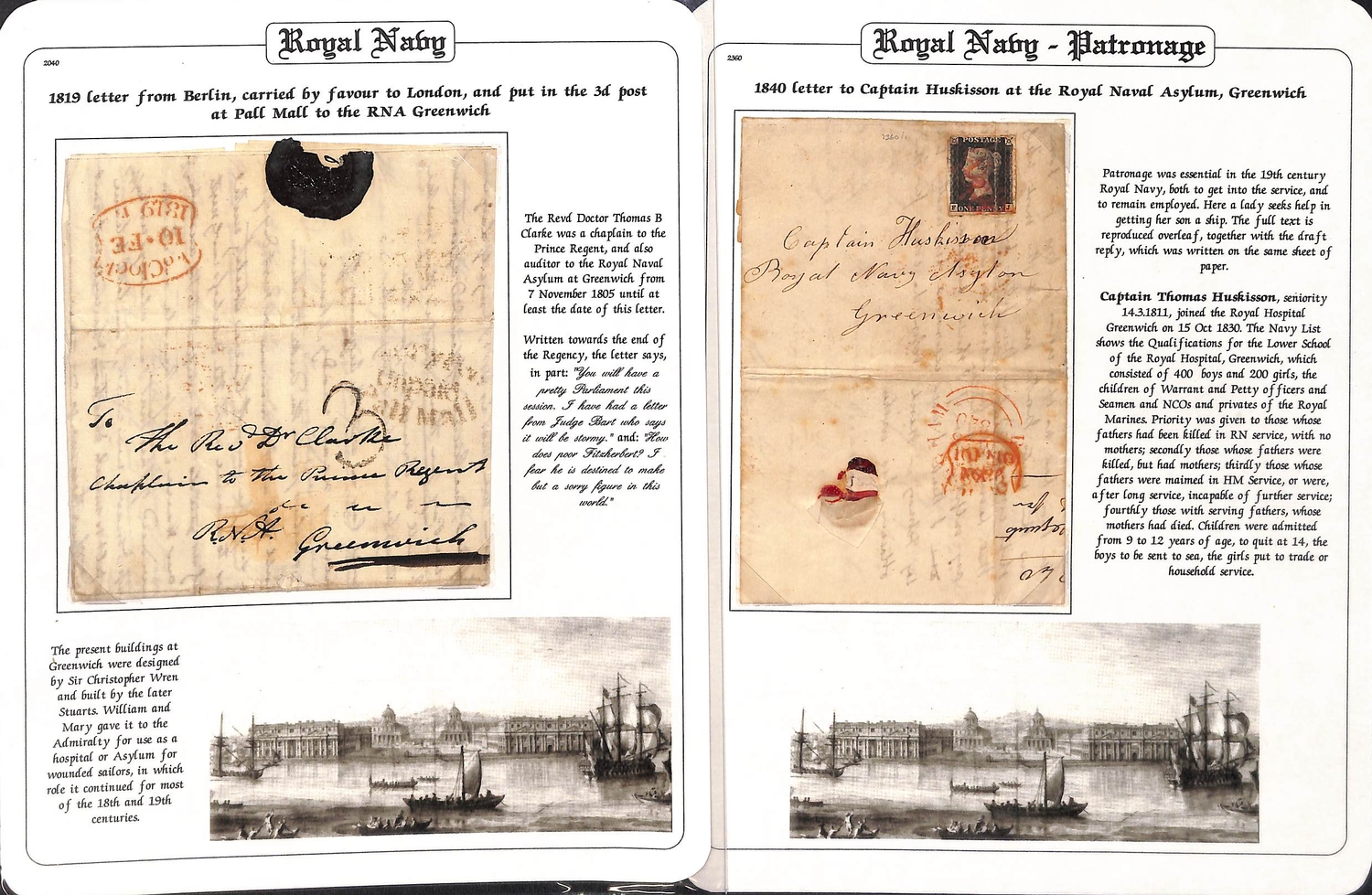 Royal Naval Asylum. 1819 (Feb 10) Entire letter posted in London to "Rev. Dr Clarke, Chaplain to the Prince Regent, R.N.A Greenwich" with interesting comments on the Prince Regent; and 1840 (Nov 24) entire letter about a former pupil seeking employment at sea, posted from Birmingham to "Captain Huskisson, Royal Navy Asylum, Greenwich" bearing a 1d black (four margins, crossed by a heavy file fold). (2).