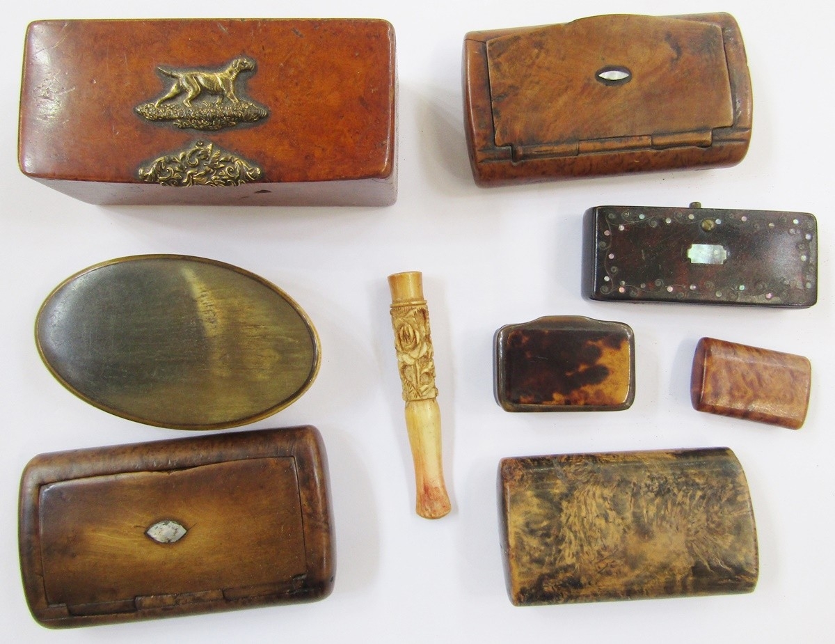 Various snuff boxes to include a small tortoiseshell example, burrwood, horn and others of various shapes and sizes, and some seed pods in brass mounted burrwood box