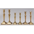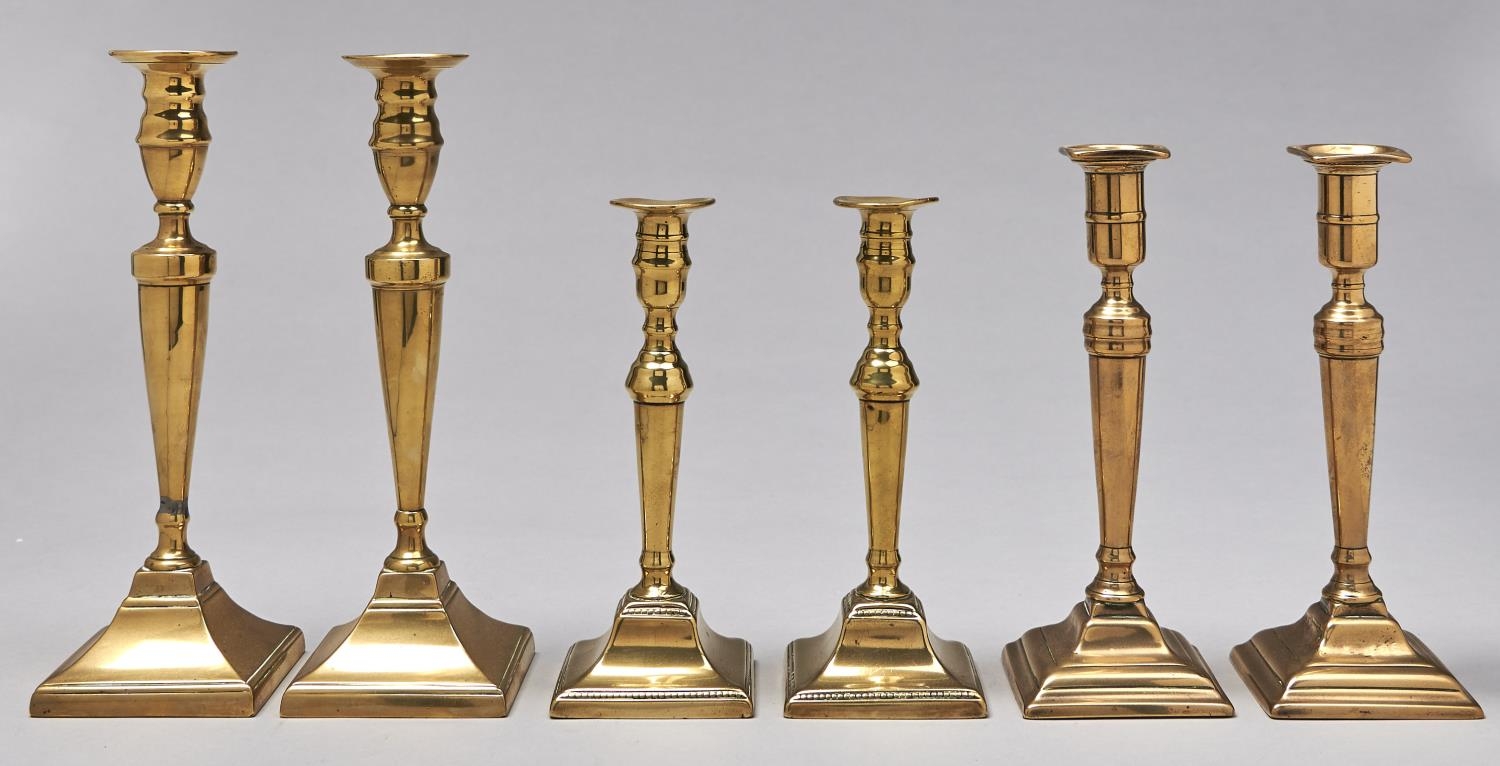 Three pairs of English brass candlesticks, two early 19th c, the largest pair later, one with nozzles, 22,5-29cm h