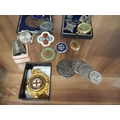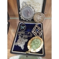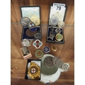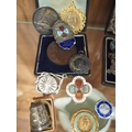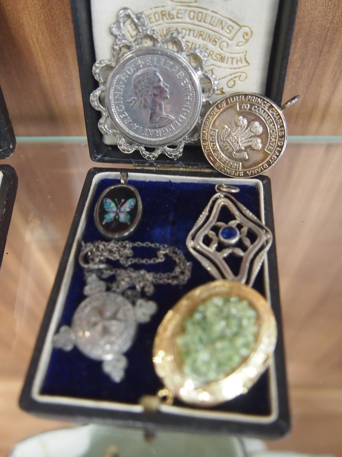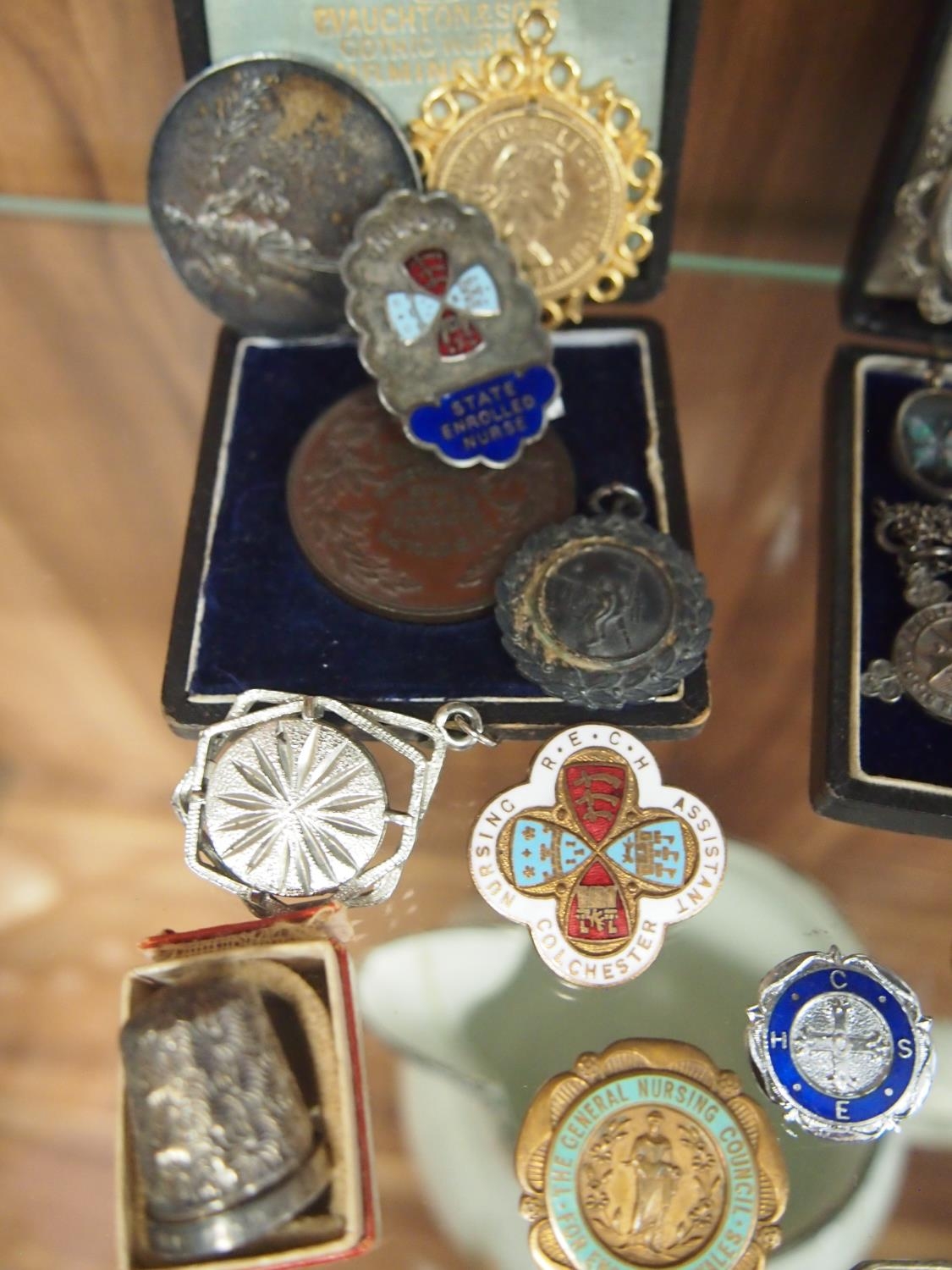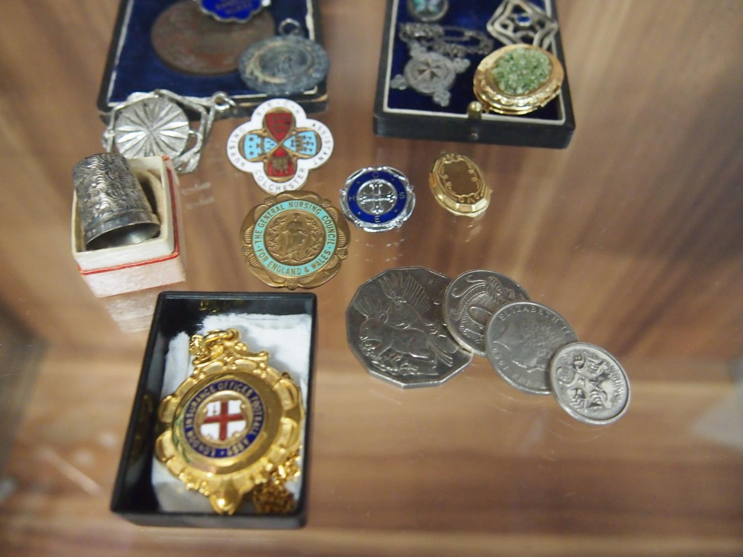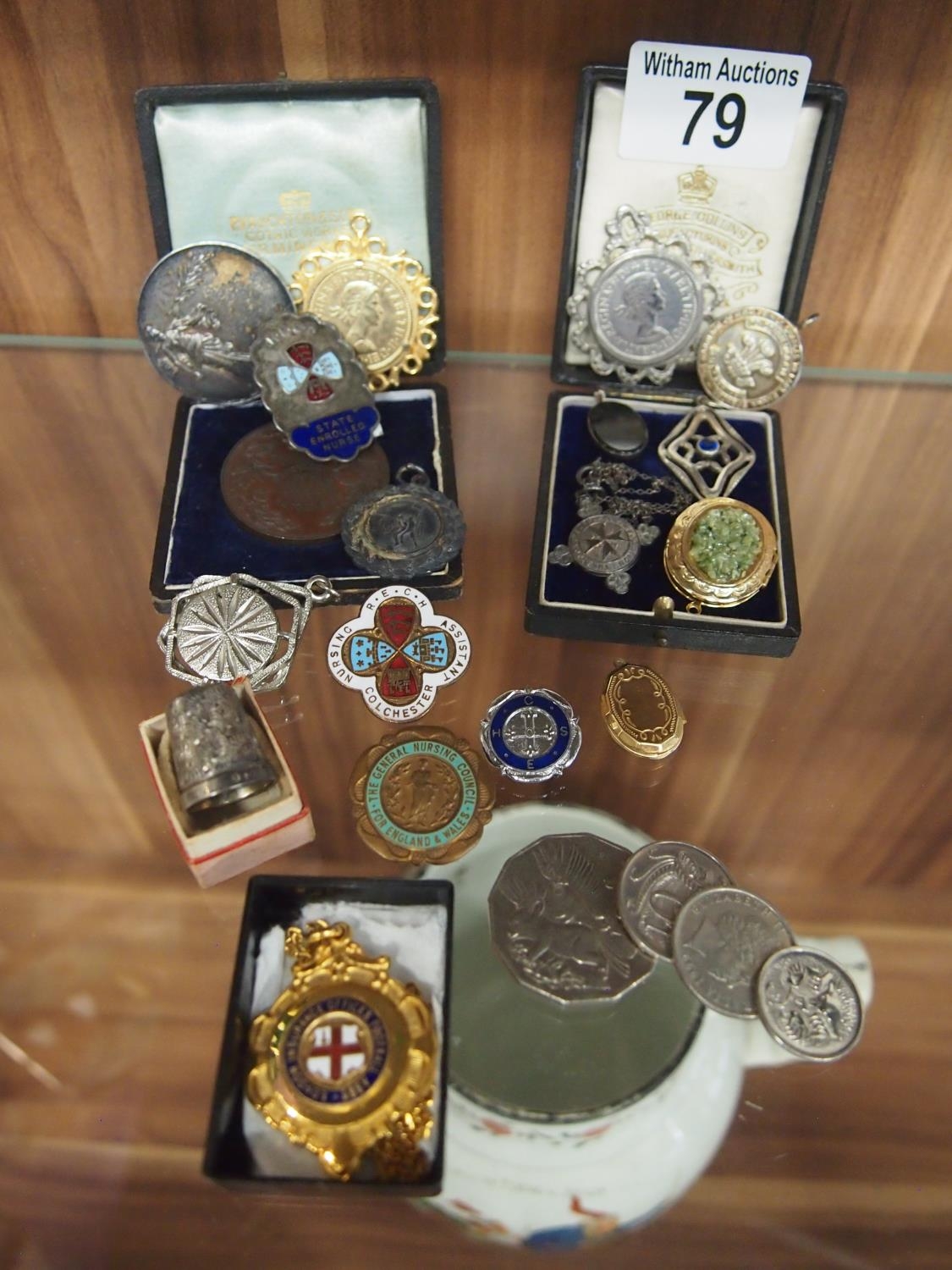 A silver thimble hallmarked Birmingham 1908 stamped 7, maker JS, St Johns Ambulance Association silver pendant engraved 218810 Alice Wheatley registered at St Johns Gate Clerkenwell, maker WD&S Birmingham 1917, London Insurance Offices Football Association medallion pendant engraved Junior Cup Winners 1966-67, St Botolph Aldgate School 1902 regular attendance medal in original Vaughton Birmingham box together with a commemorative medallion hallmarked Birmingham 1981. Three enamel nursing badges and a collection of pendants and coins