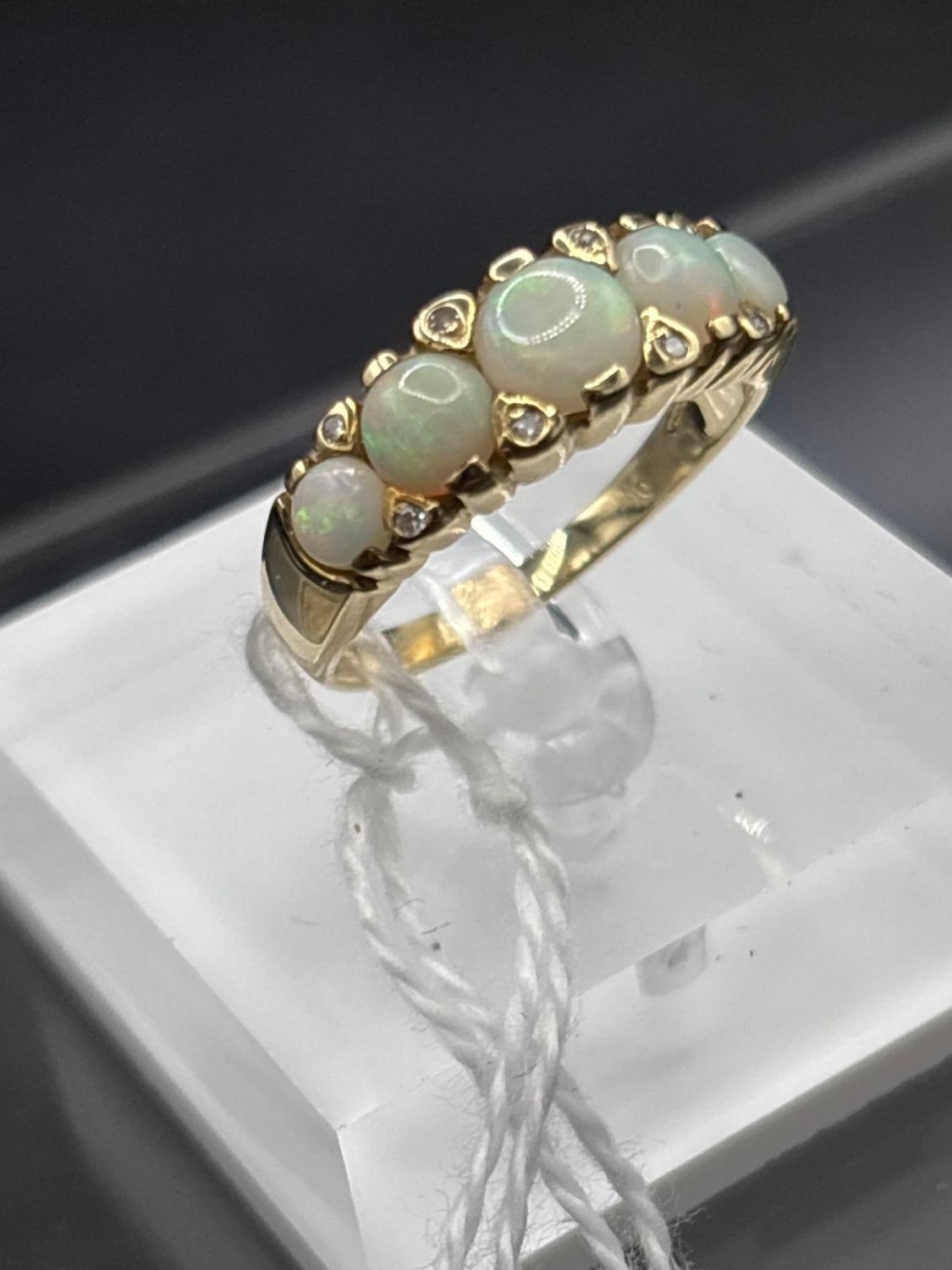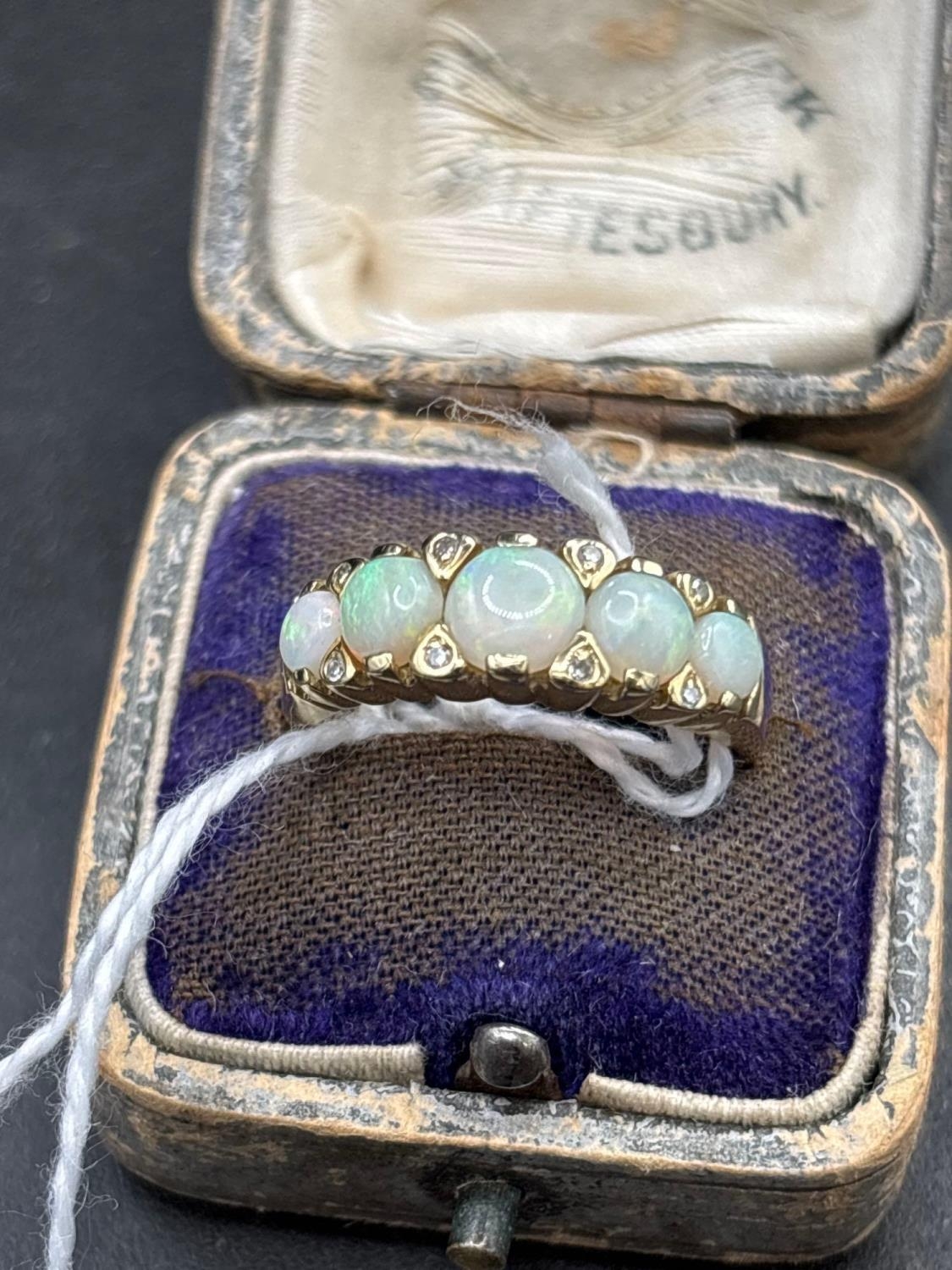 A attractive five stone opal and diamond ring 9ct size R 3.2 gms in early ring box
