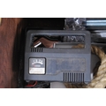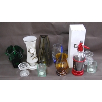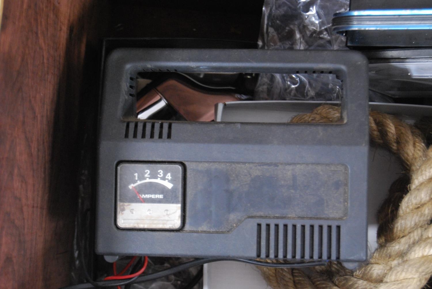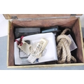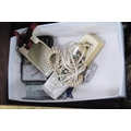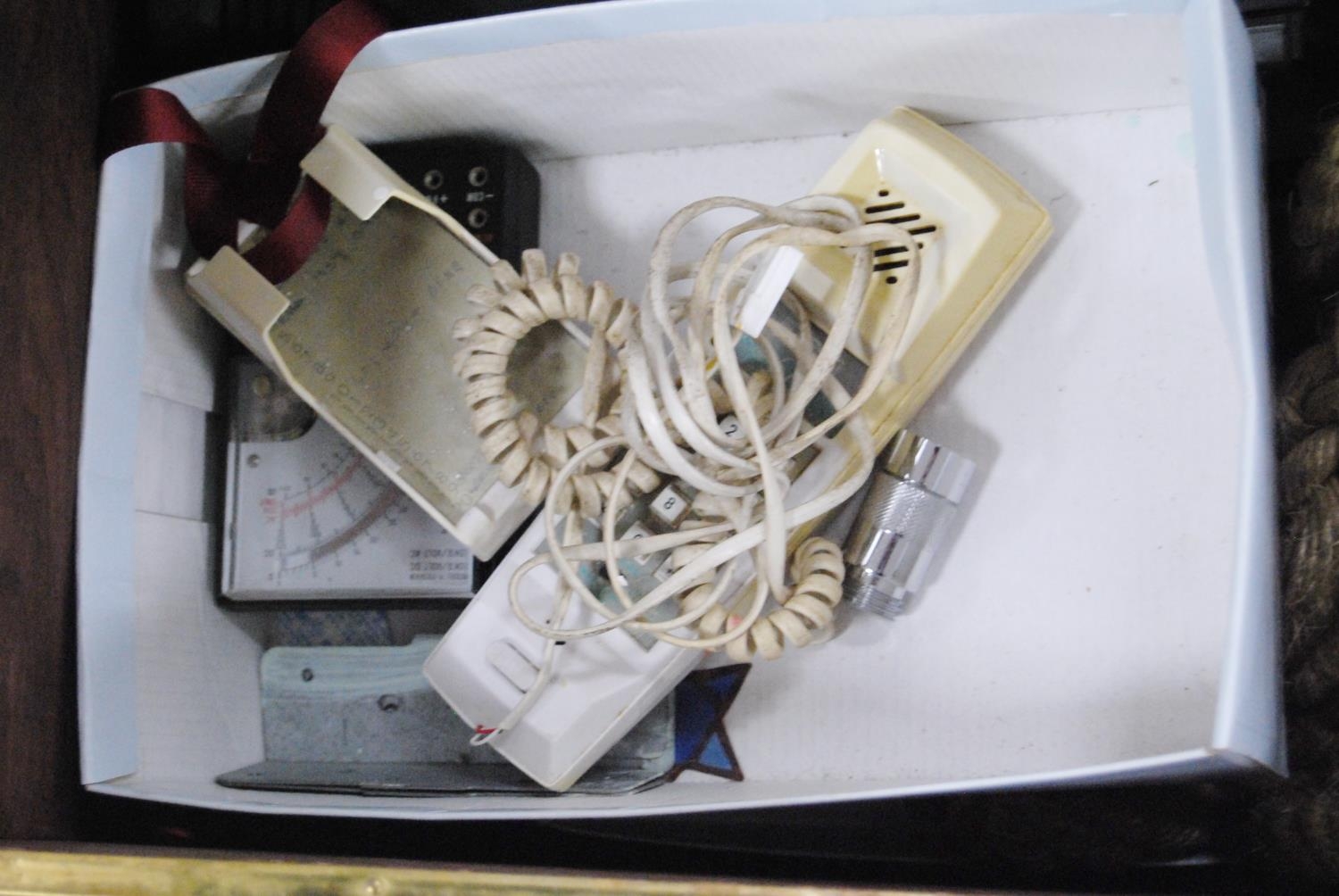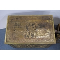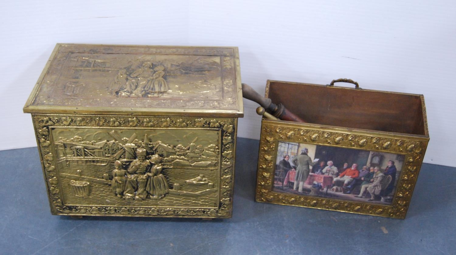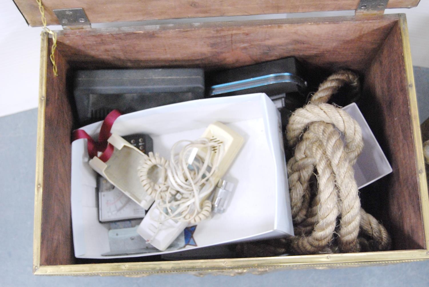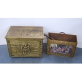 Brass log box containing vintage telephones, accessories and a brass magazine rack, antique water pump and fire irons.
