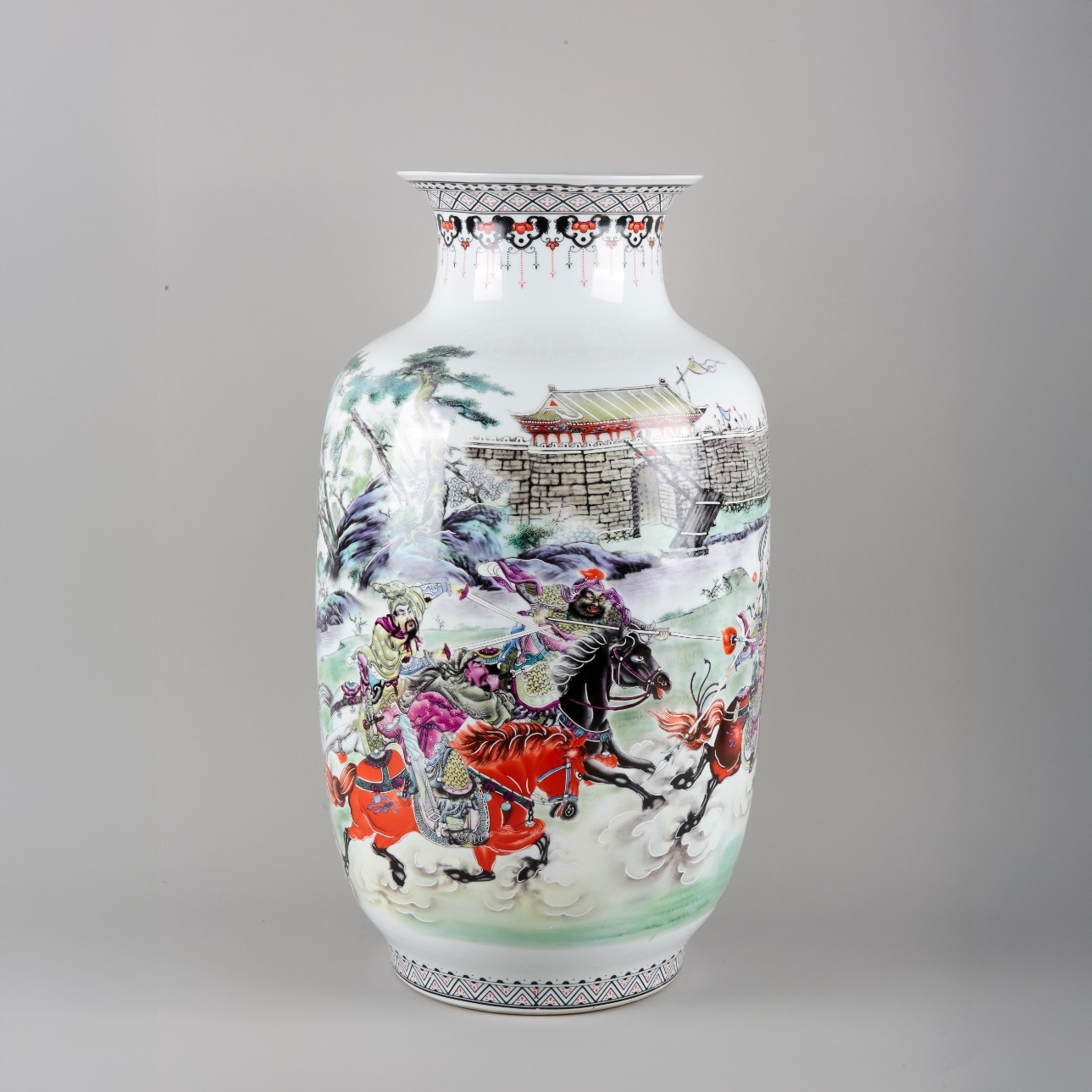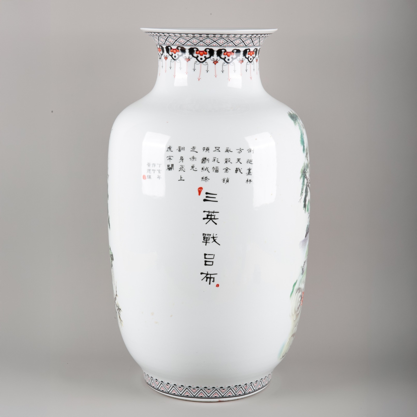 bearing a four character mark to the base, 20th century, inscribed with a passage from the Romance of the Three Kingdoms, and decorated with three heroes fighting Lu Bu, 63cm high