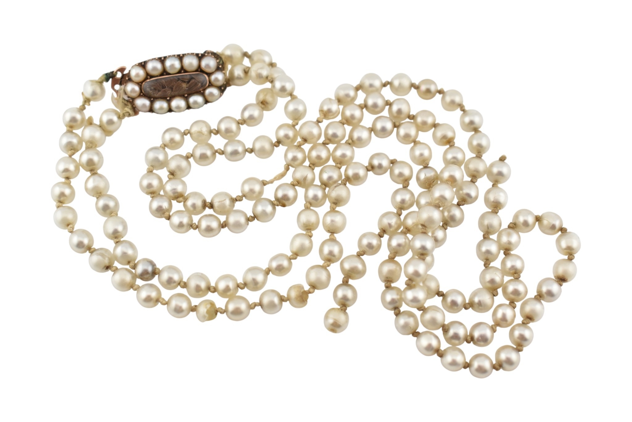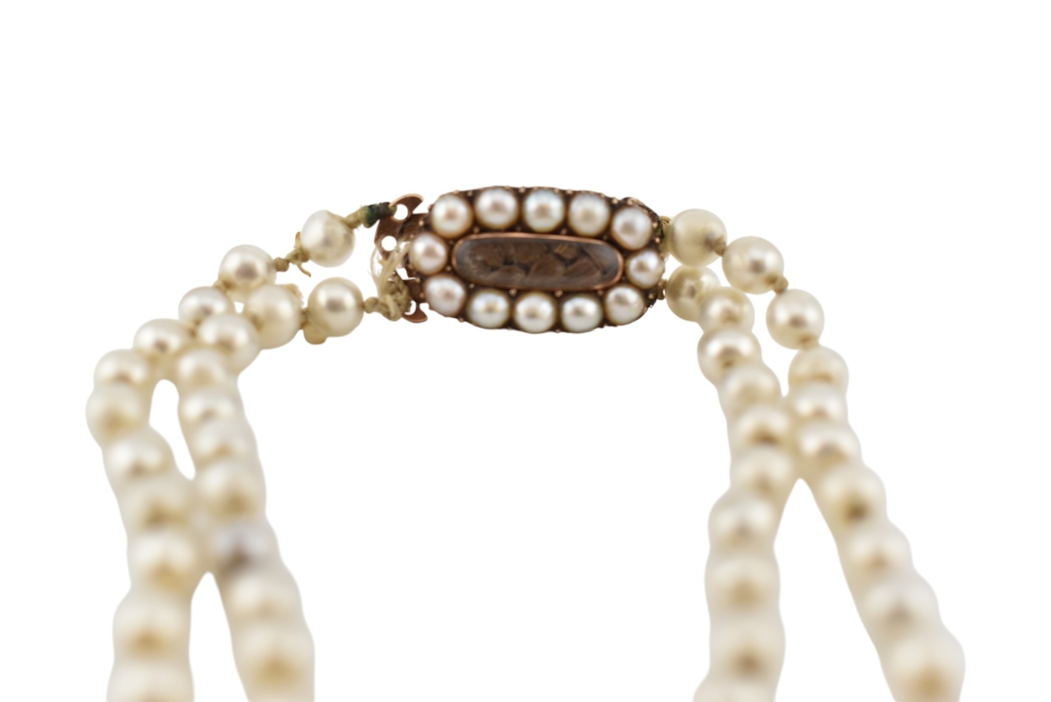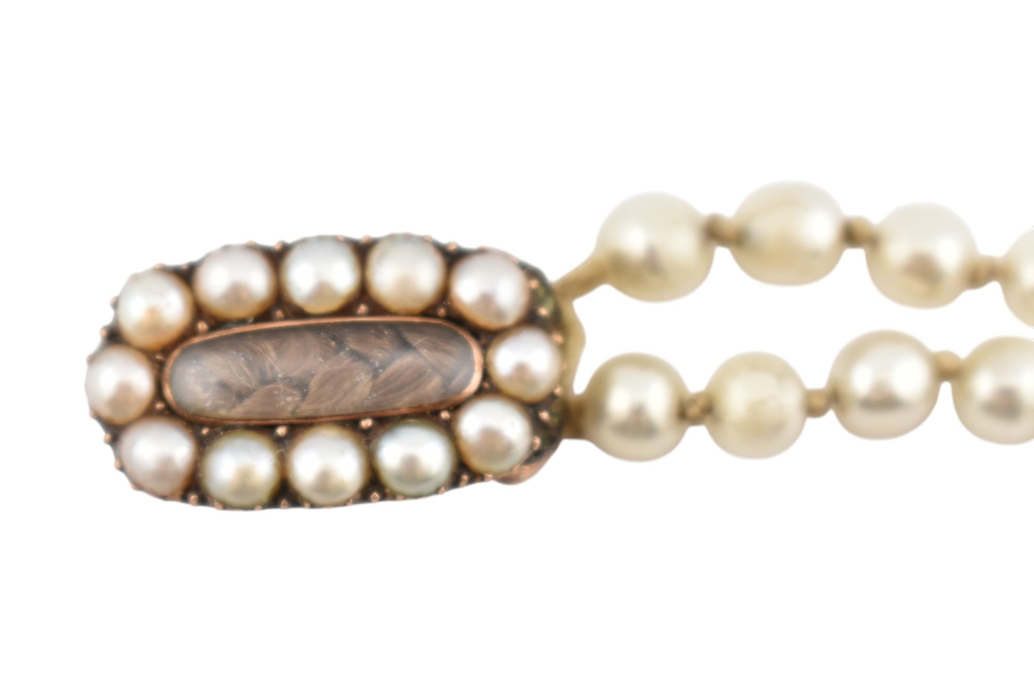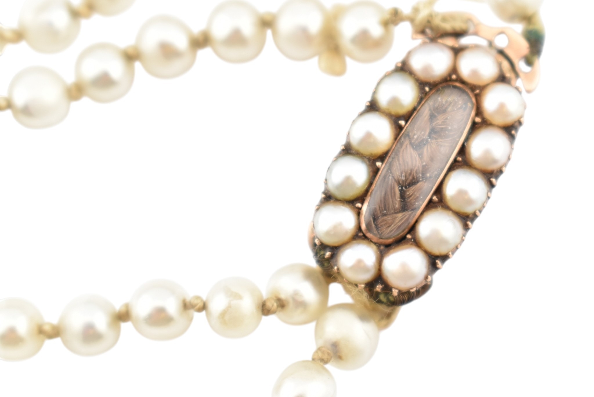 A 19th century simulated glass pearl necklace with a mourning hair locket clasp. The clasp having a central locket compartment with woven hair framed by pearls. The necklace, consisting of knotted glass simulated pearls - one string broken.
