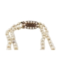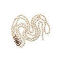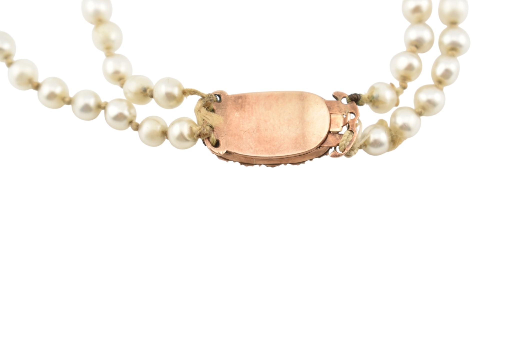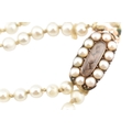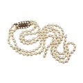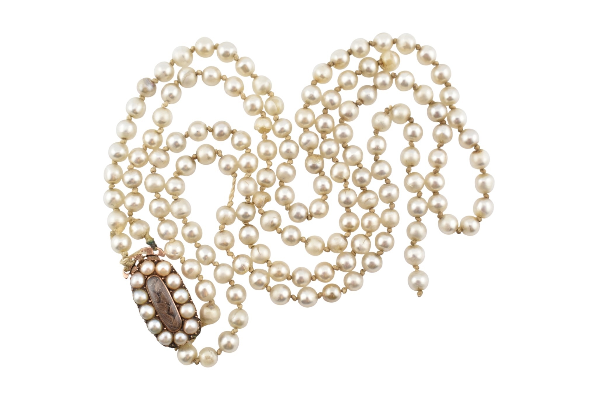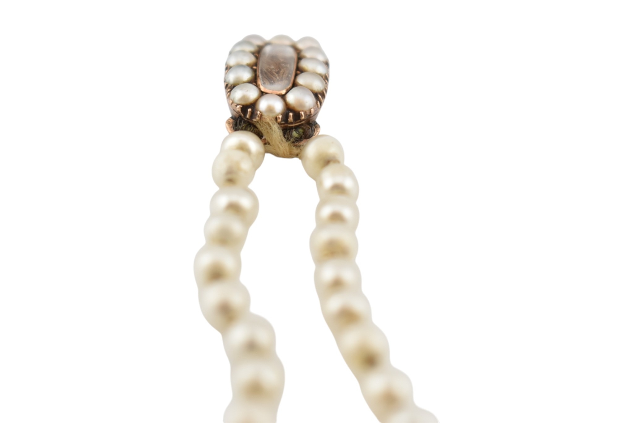 A 19th century simulated glass pearl necklace with a mourning hair locket clasp. The clasp having a central locket compartment with woven hair framed by pearls. The necklace, consisting of knotted glass simulated pearls - one string broken.