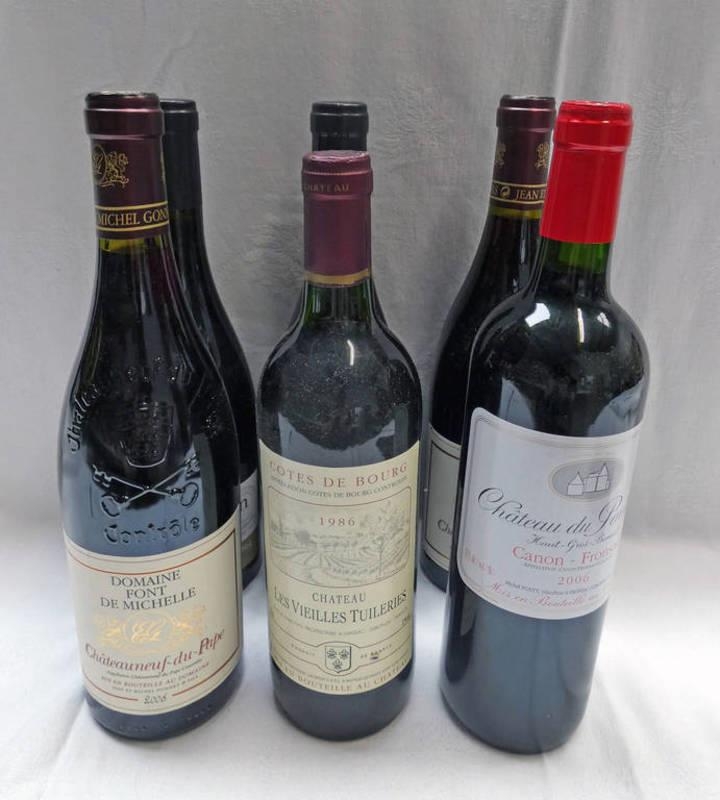 6 BOTTLES WINE TO INCLUDE CHATEAU DE PAVILLON CANON - FRONSAC 2006 , CHATEAUNEUF DU PAPE 2006, CHATEAU LES VIELLES TUILERIES 1986 ETC