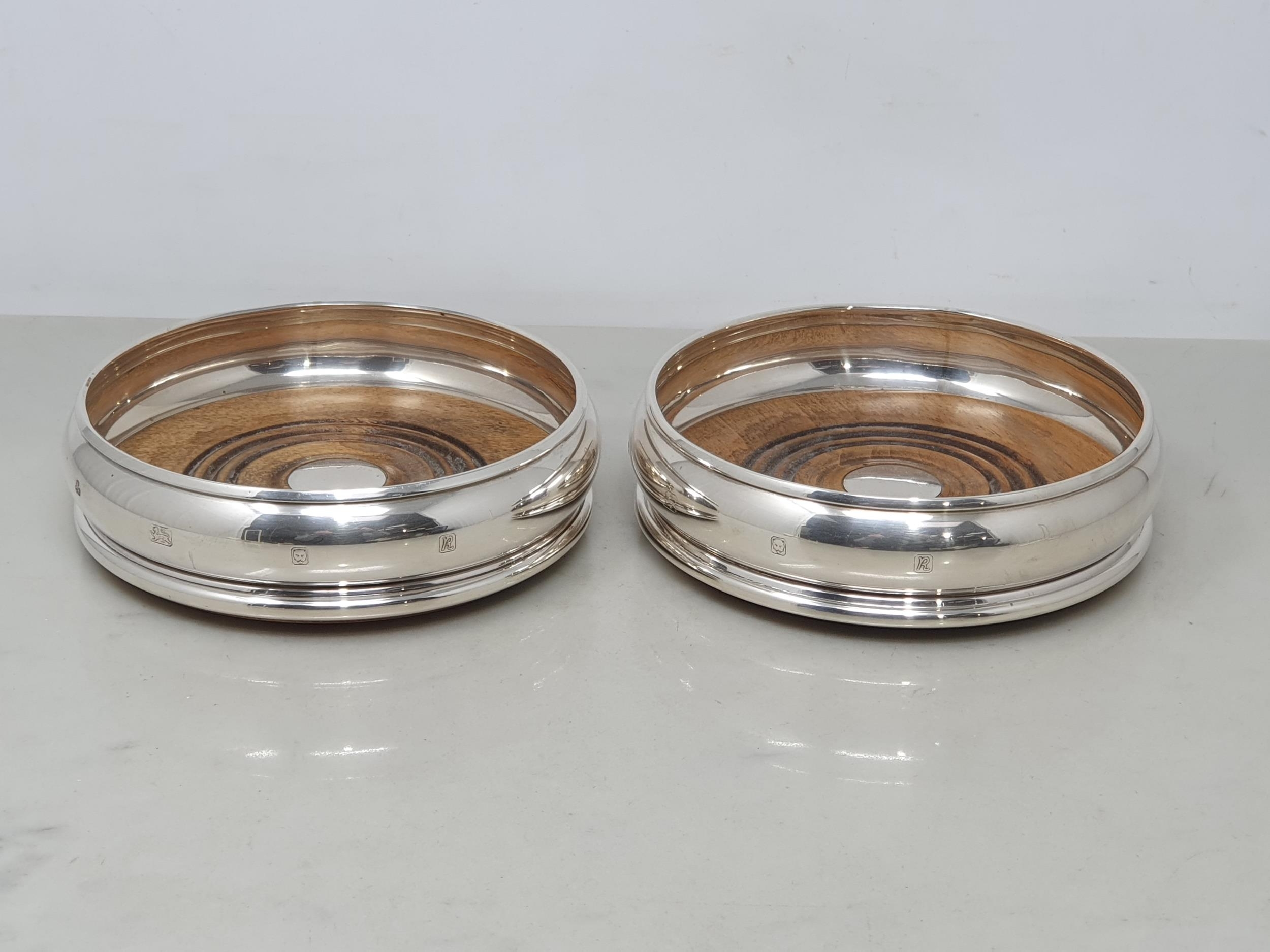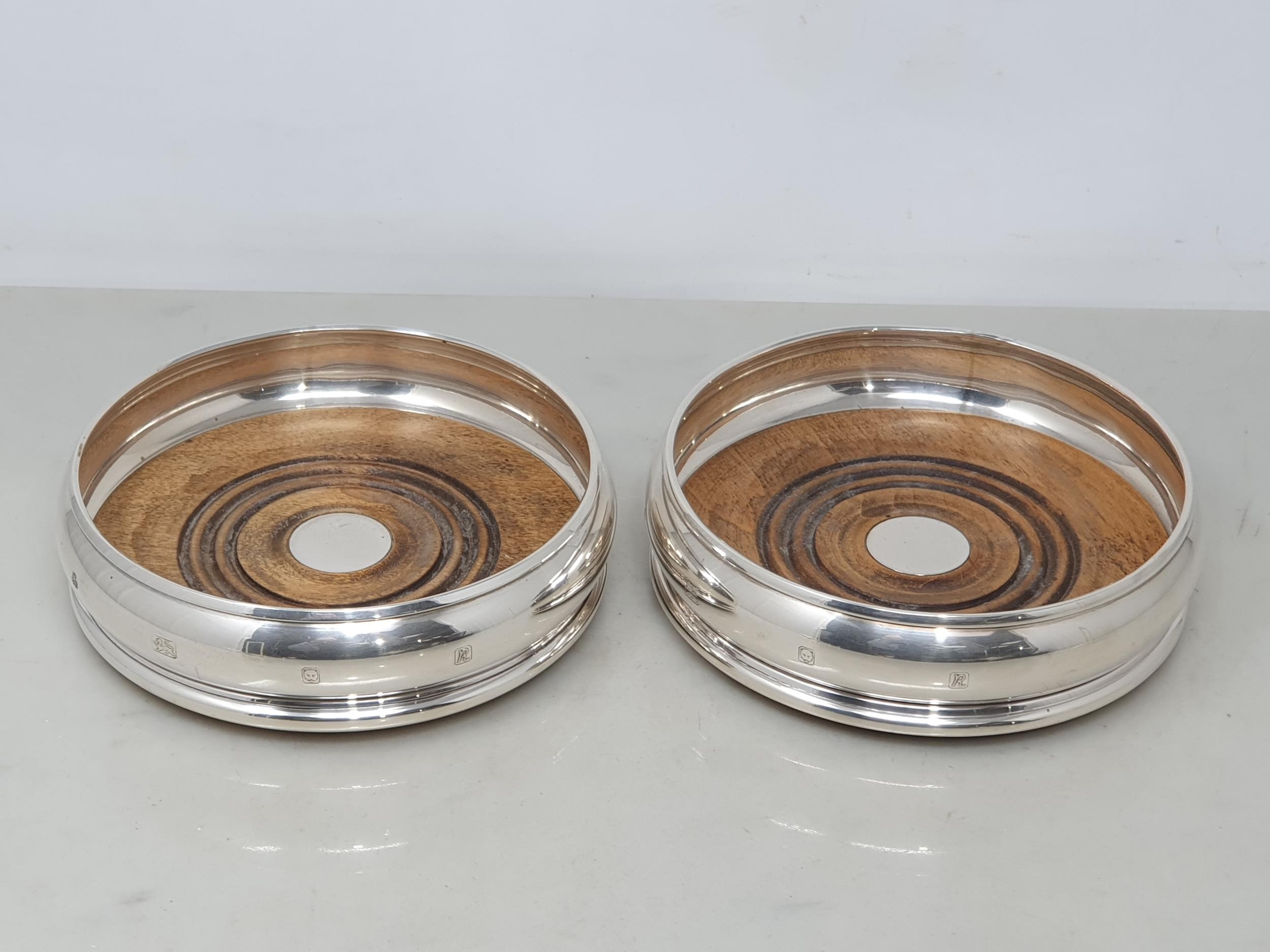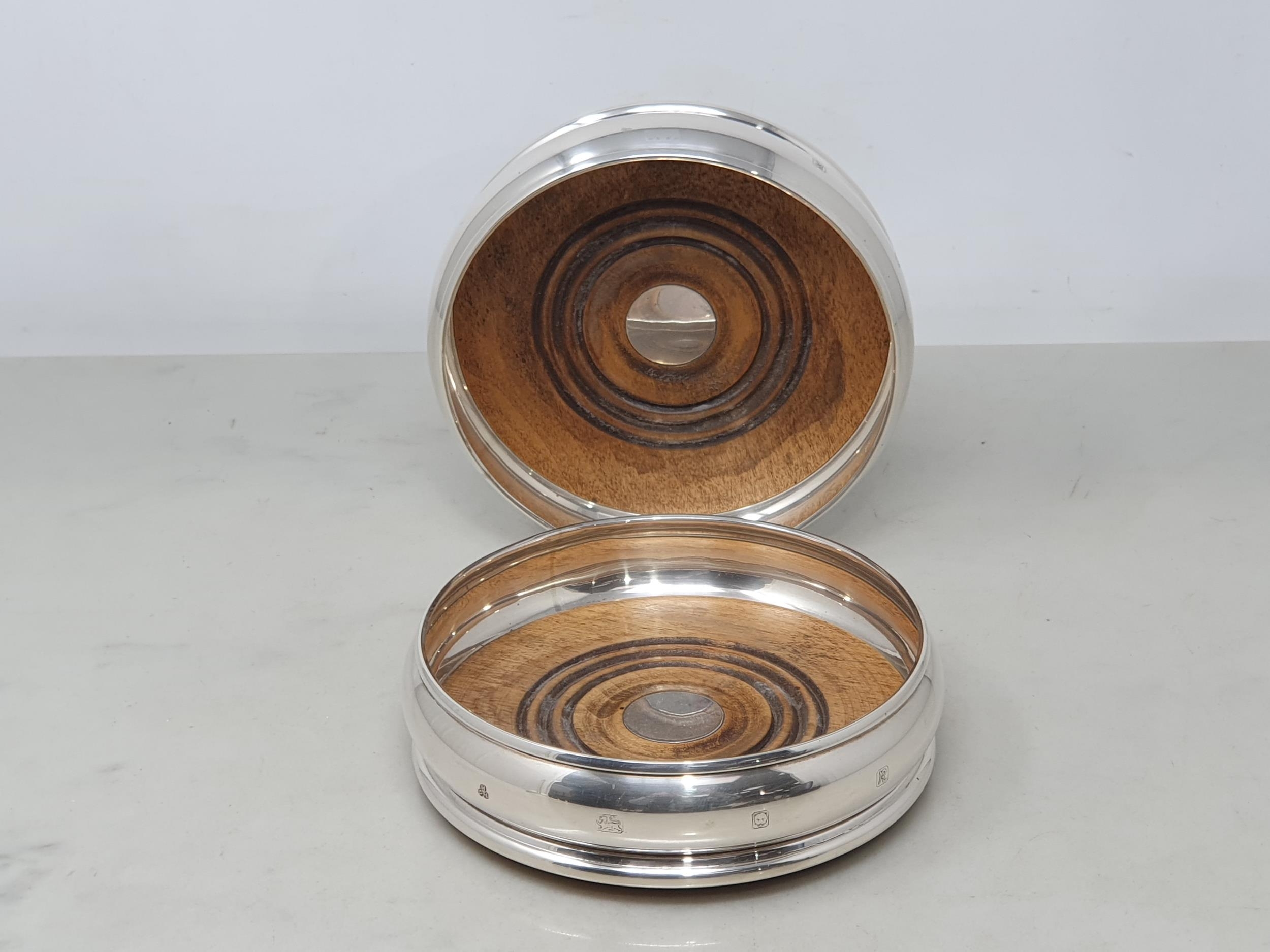 A pair of modern silver circular Coasters with turned wooden bases, London 1991