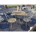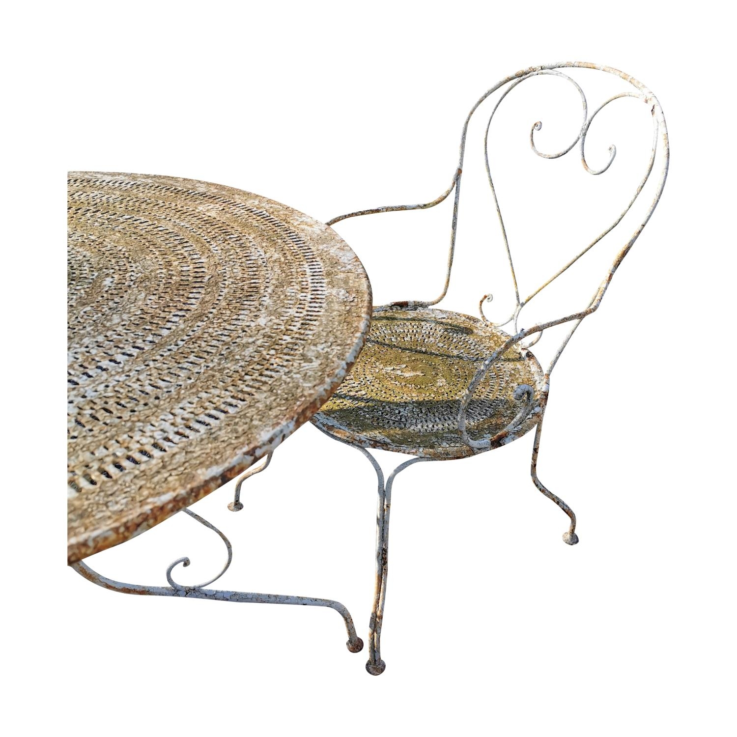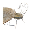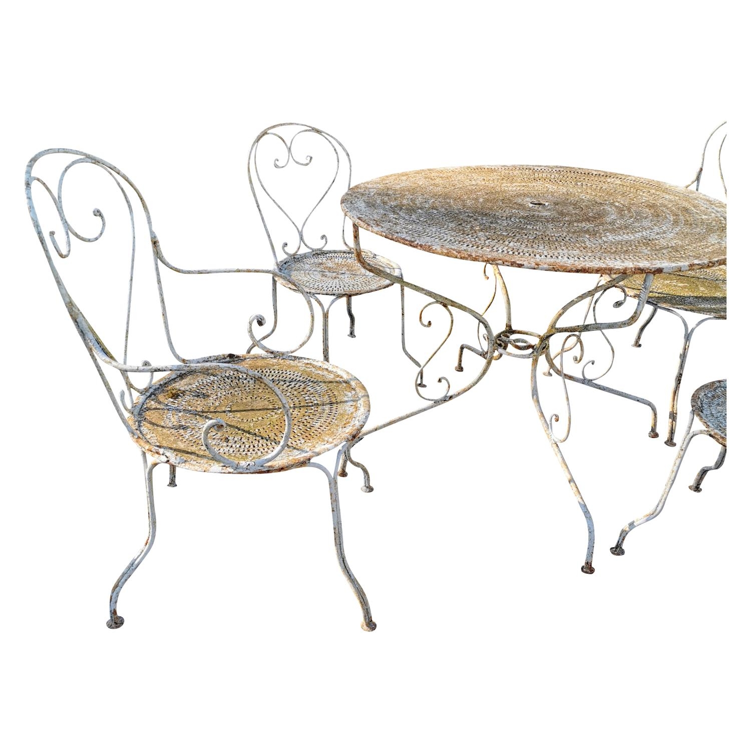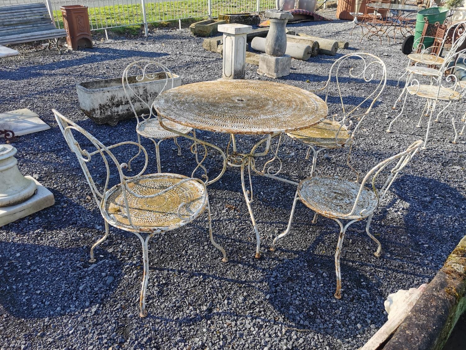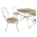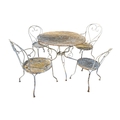 Early 20th C. wrought iron garden table and four matching chairs {table is 71 cm H x 97 cm Dia and chairs are 89 cm H}.
