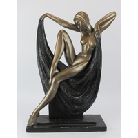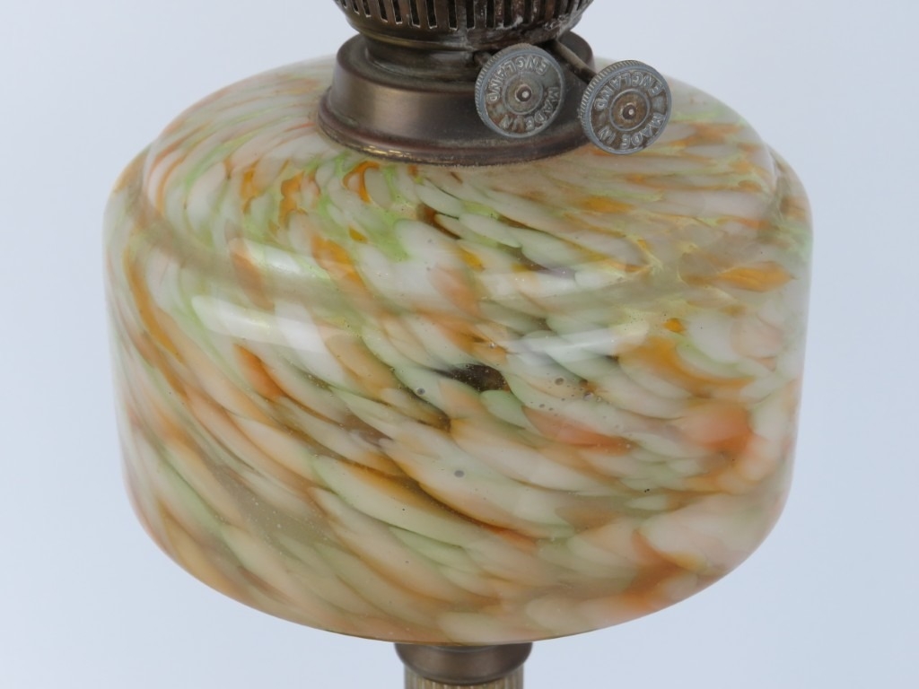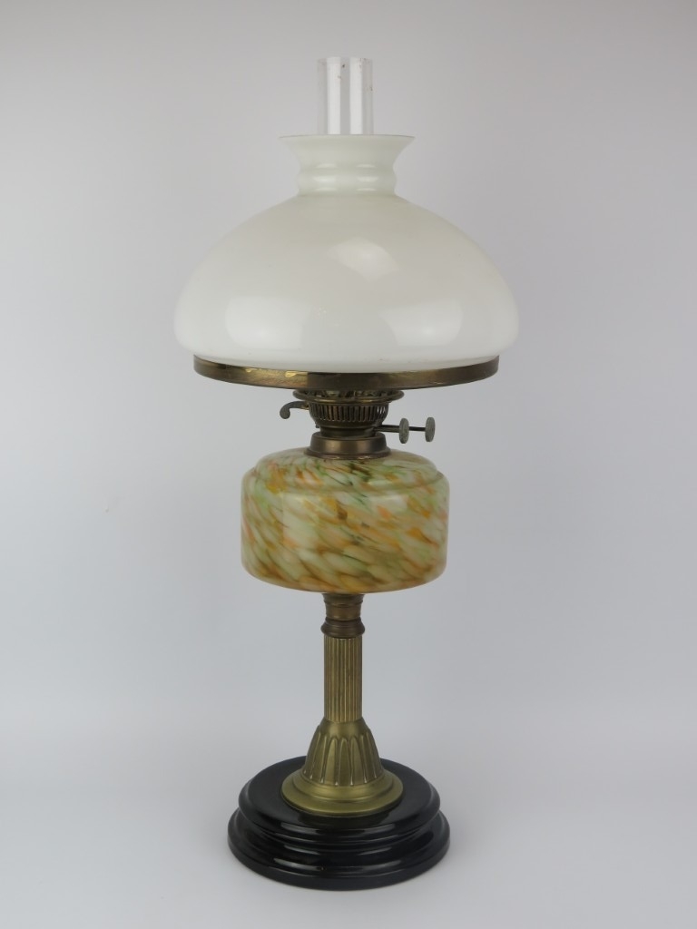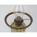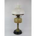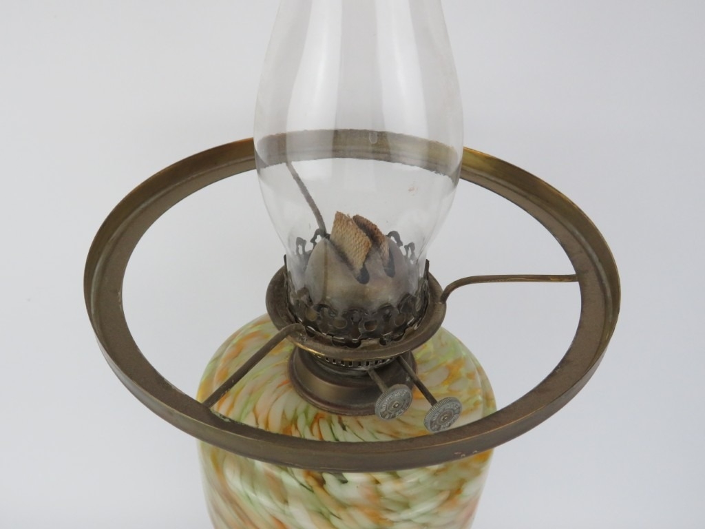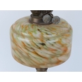 An antique gilt brass and glass oil lamp. With a mottled glass well and opaque white shade. 63 cm height.
