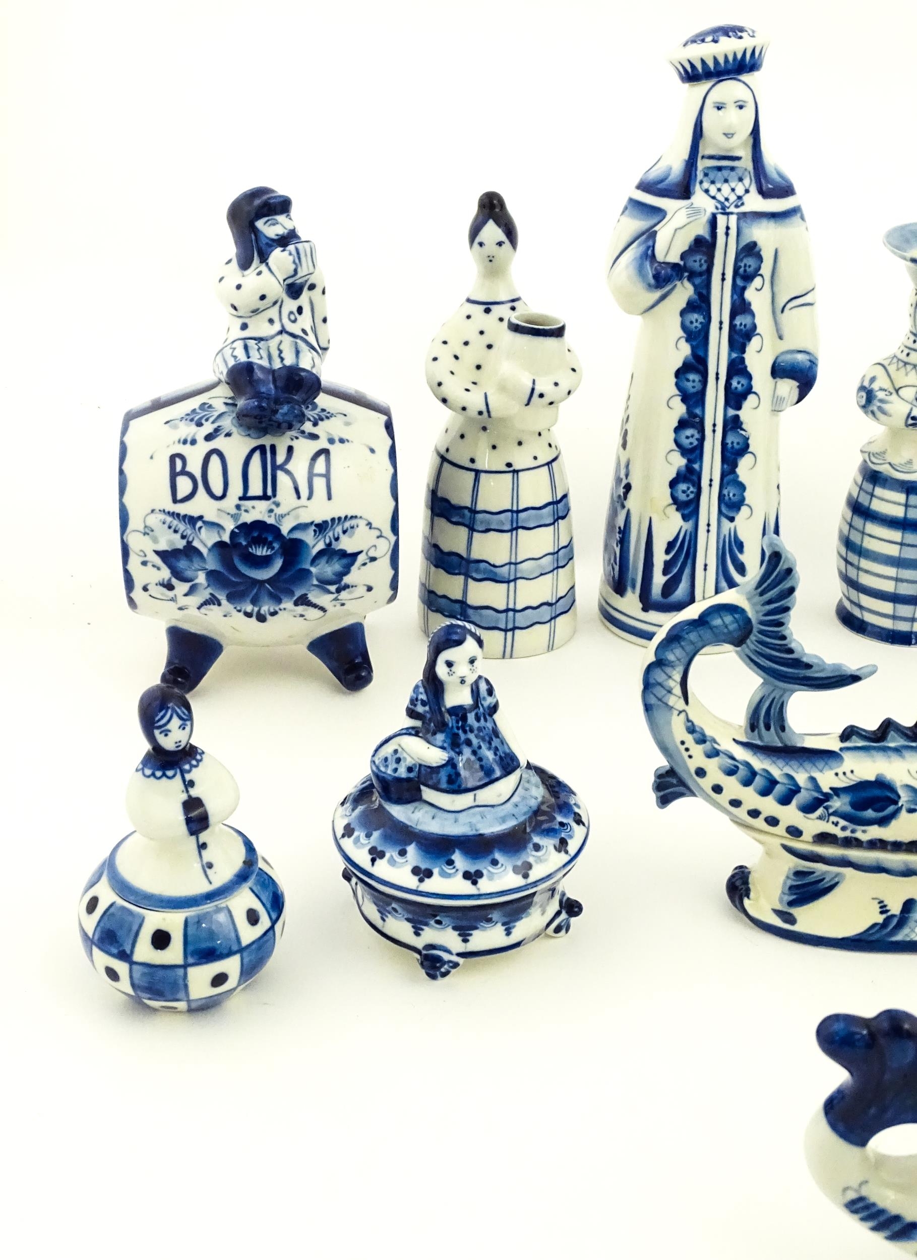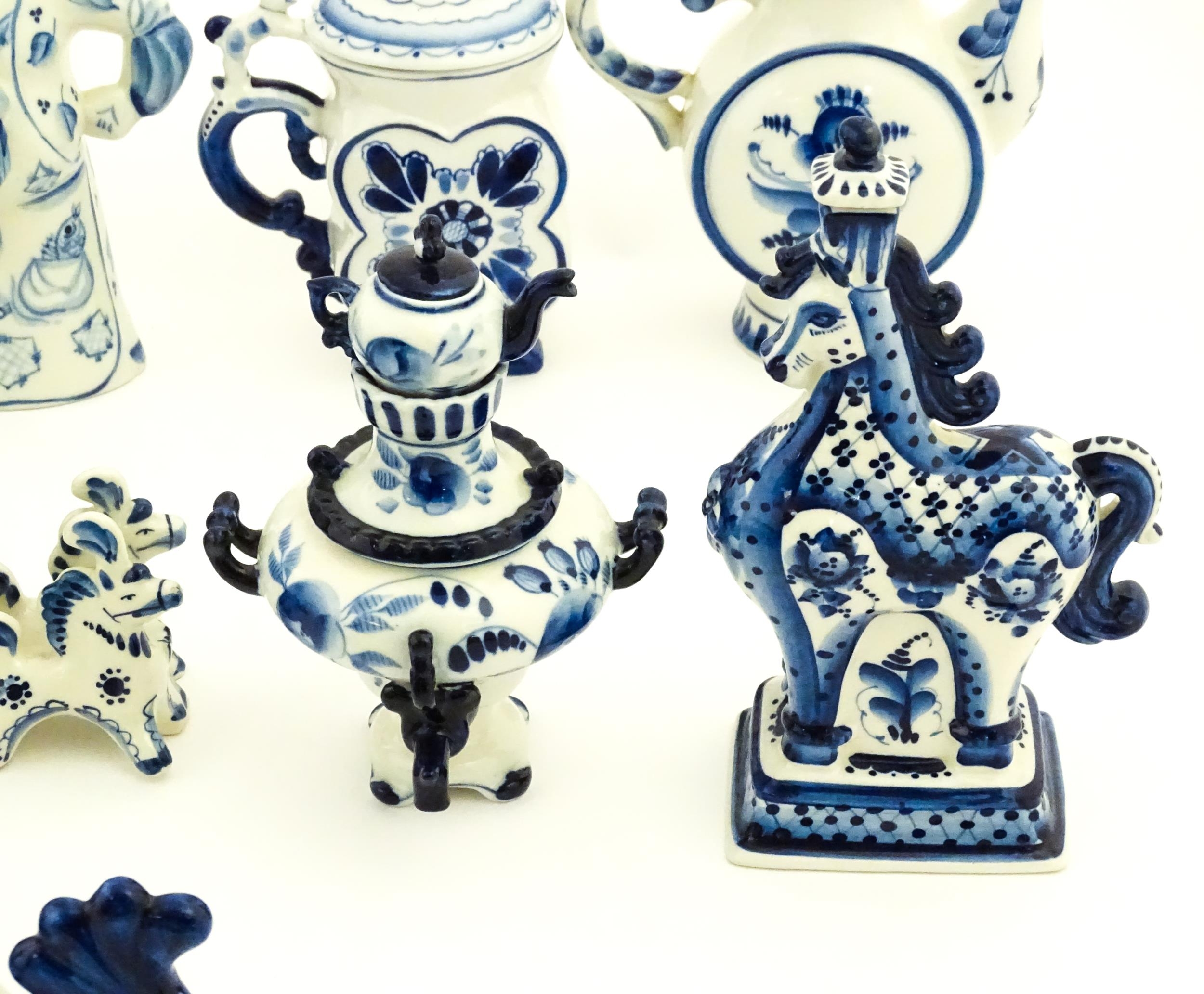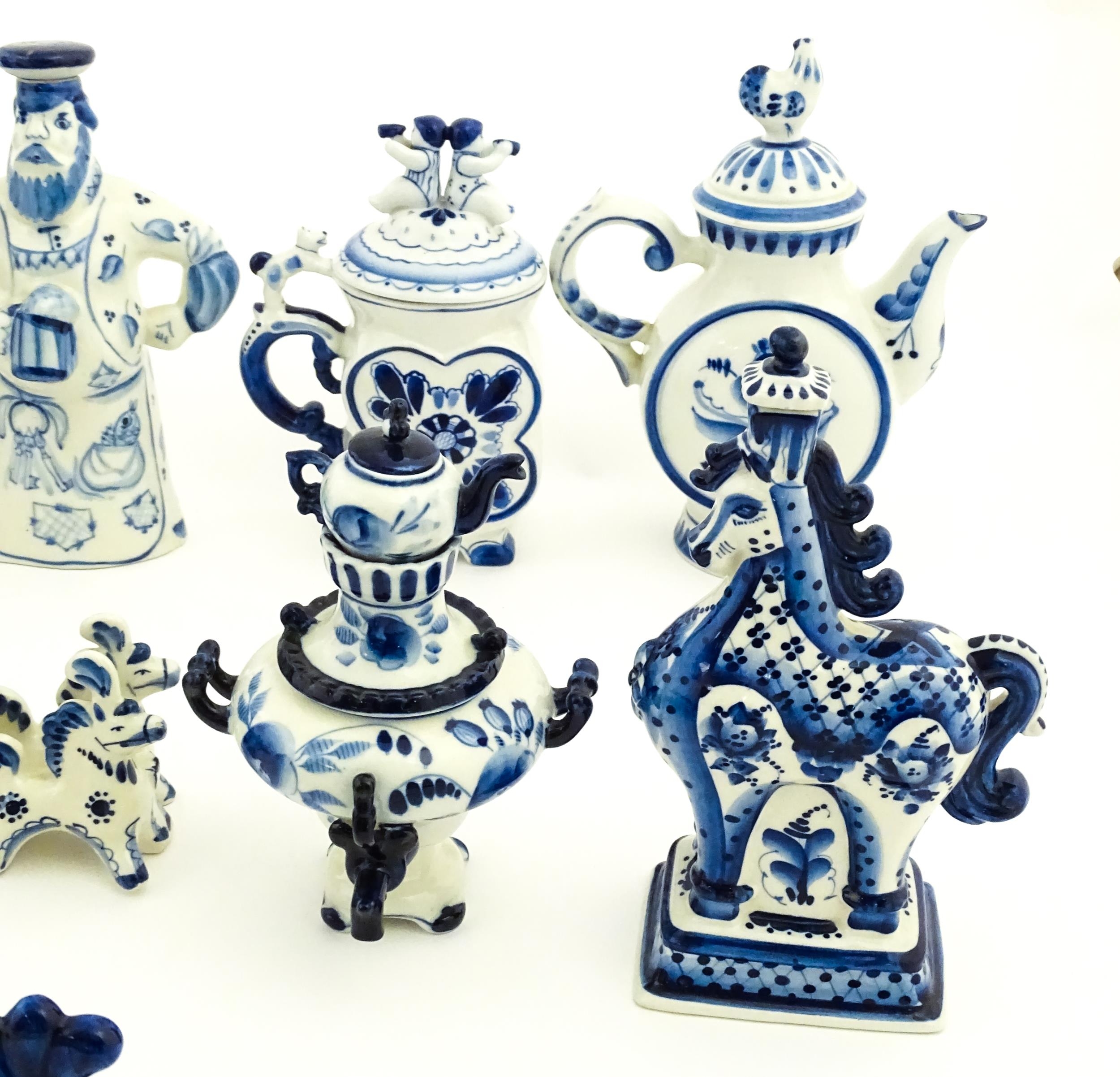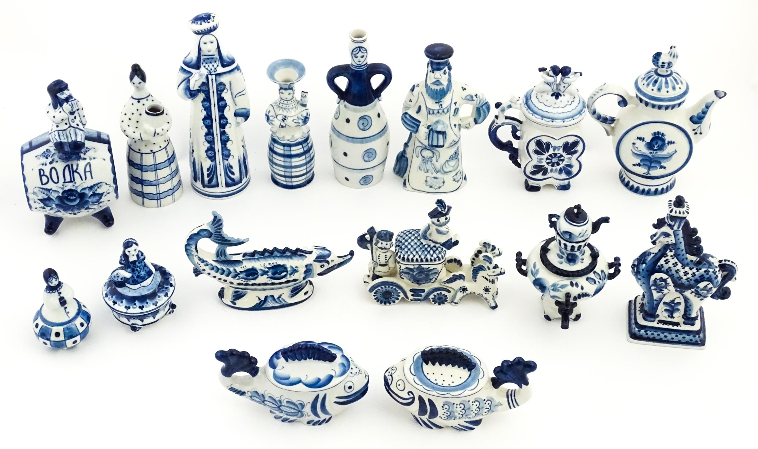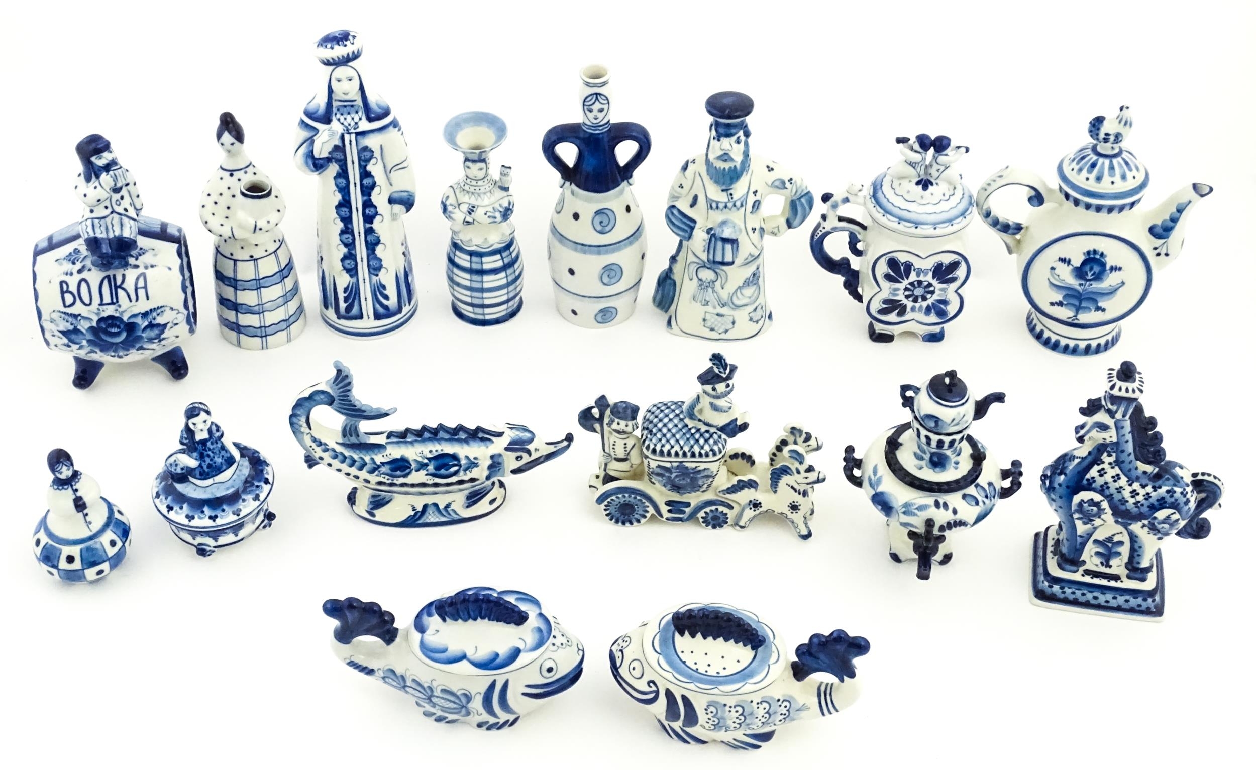 A quantity of Russian / USSR blue and white wares to include bottles / flask of figural form, teapots with floral detail, pot and covers of stylised fish form, etc. Makers to include Gzhel, etc. Largest approx. 11 1/4" high
