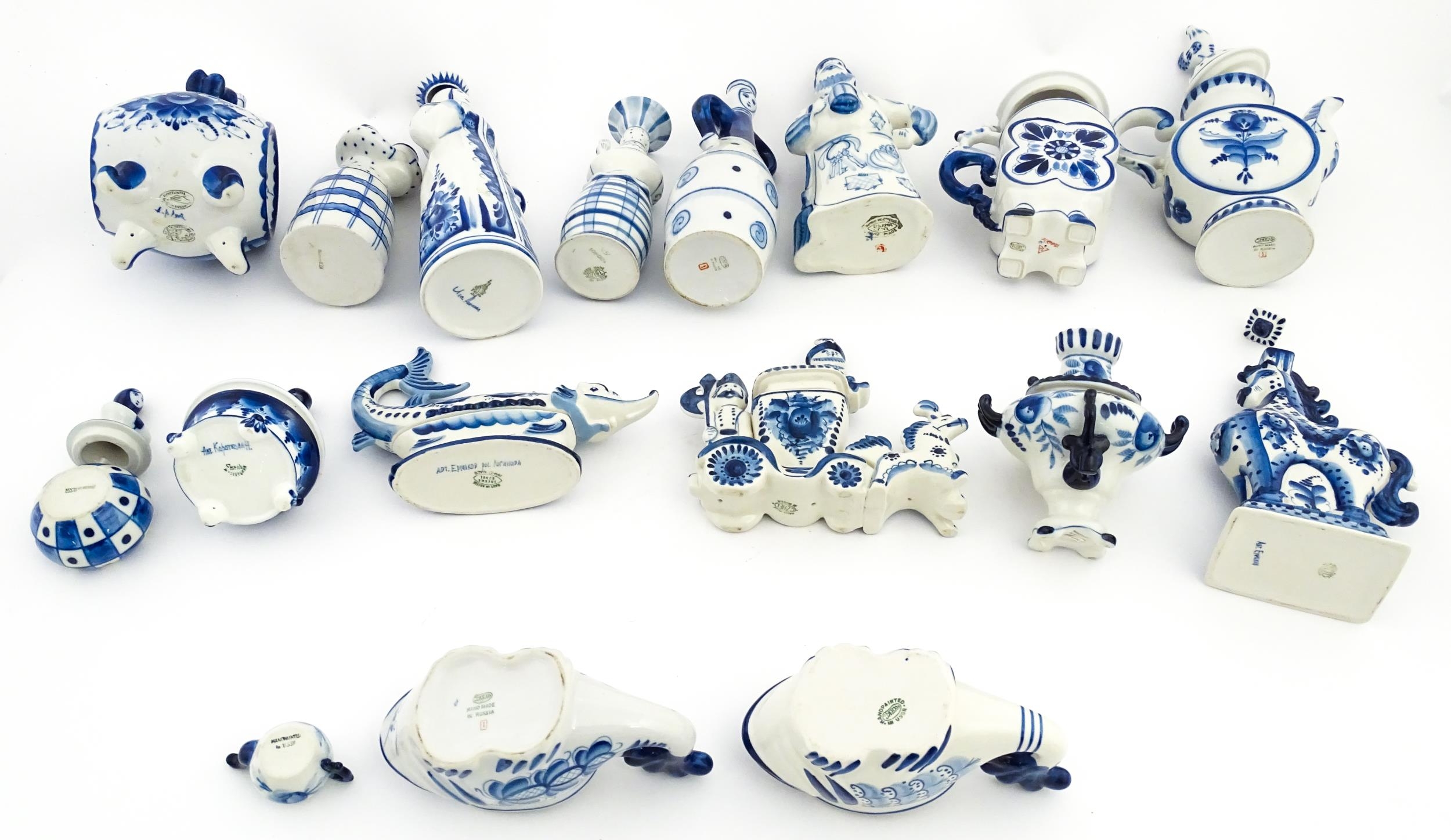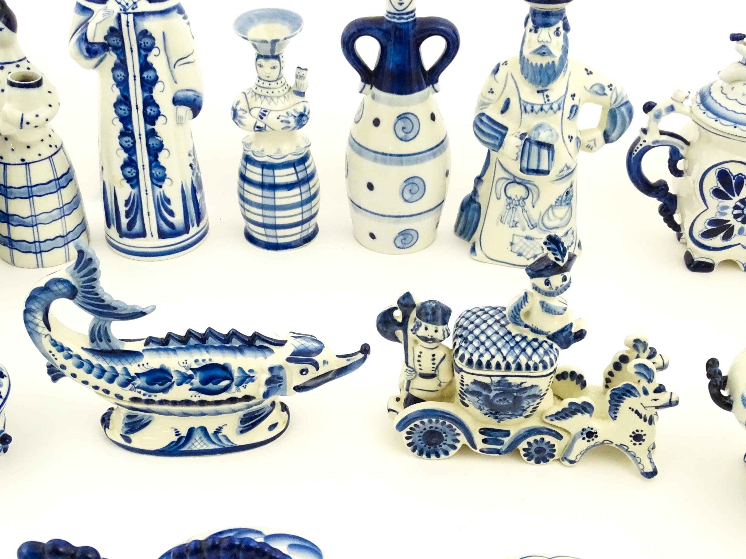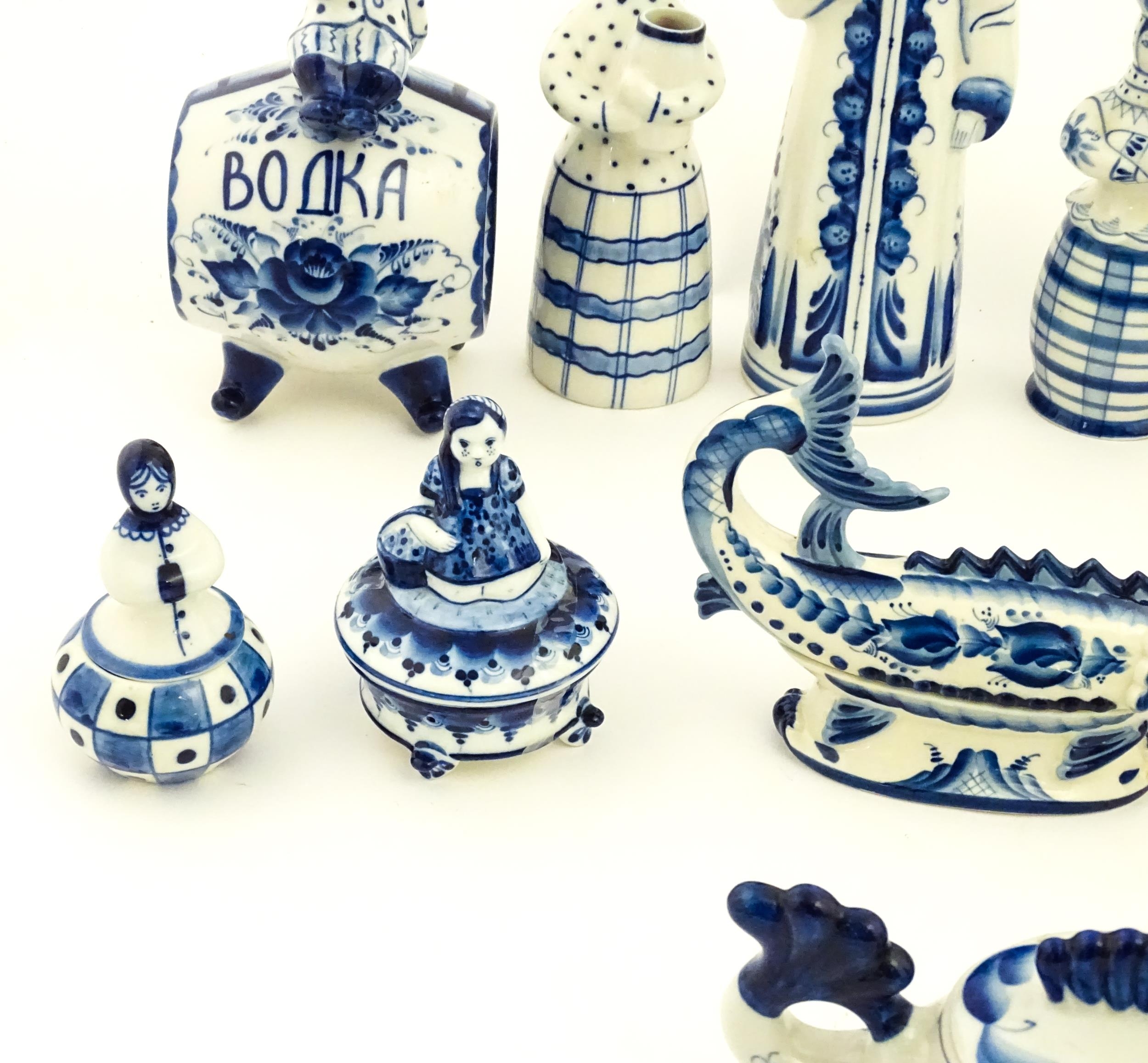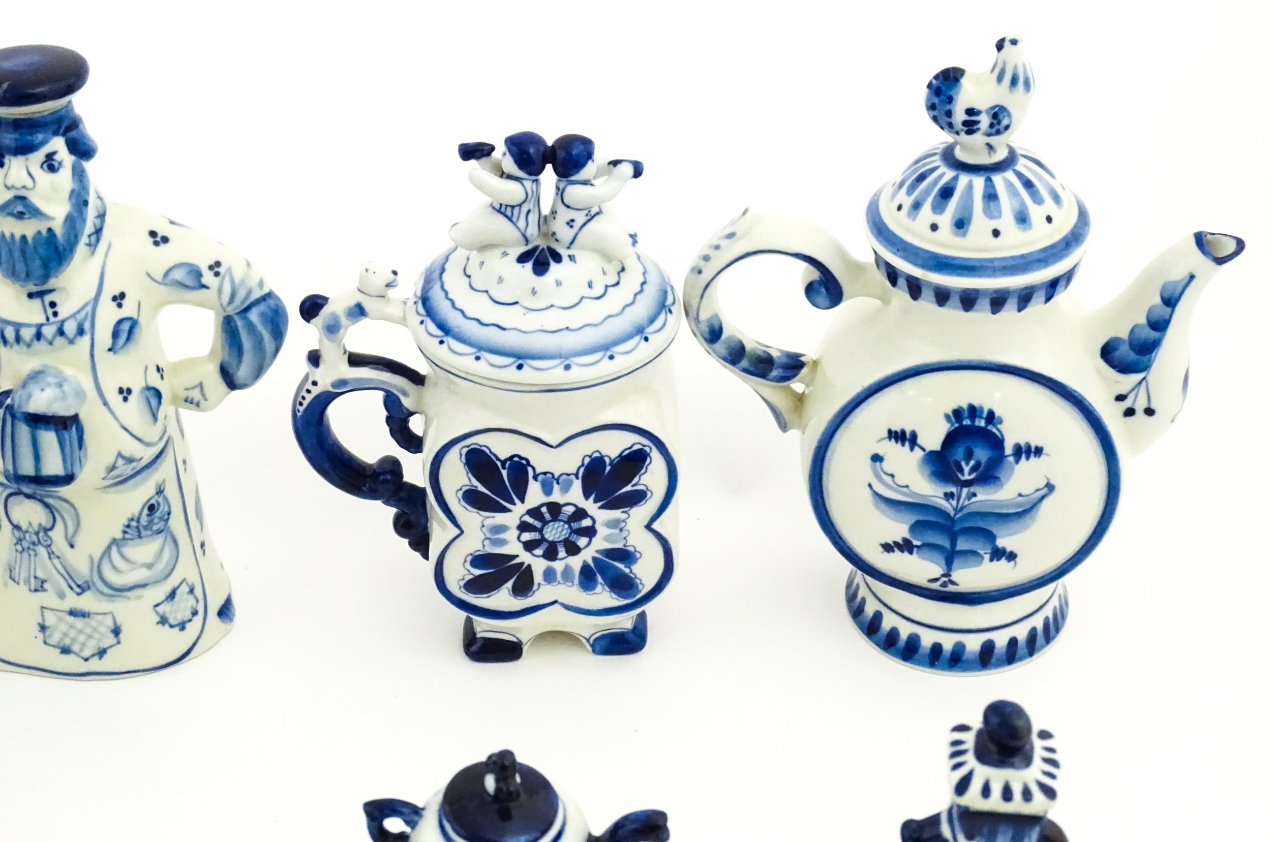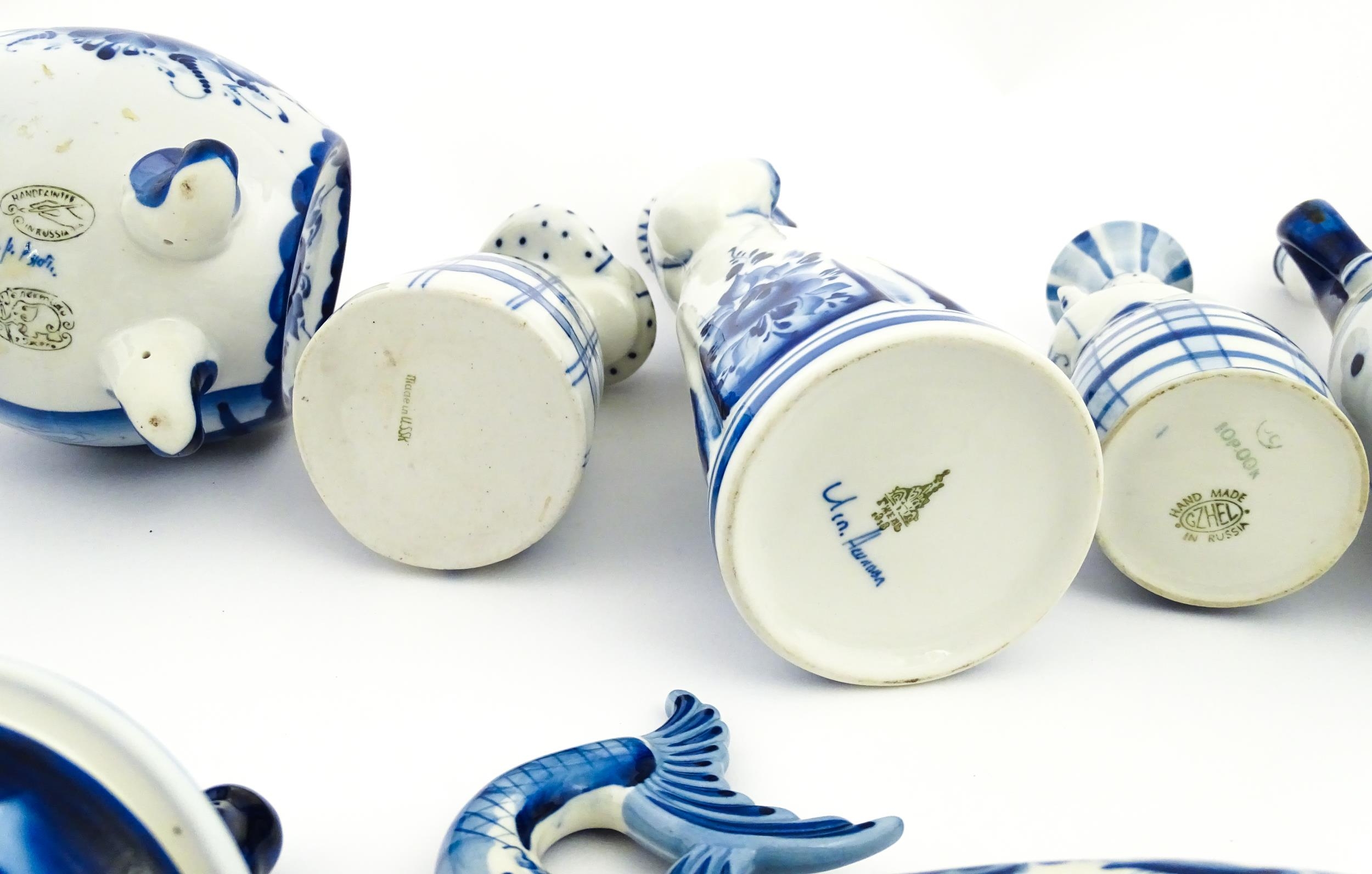 A quantity of Russian / USSR blue and white wares to include bottles / flask of figural form, teapots with floral detail, pot and covers of stylised fish form, etc. Makers to include Gzhel, etc. Largest approx. 11 1/4" high