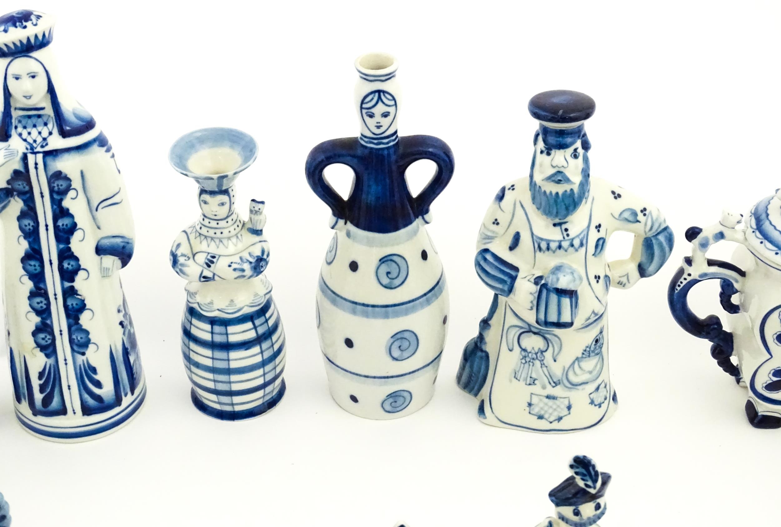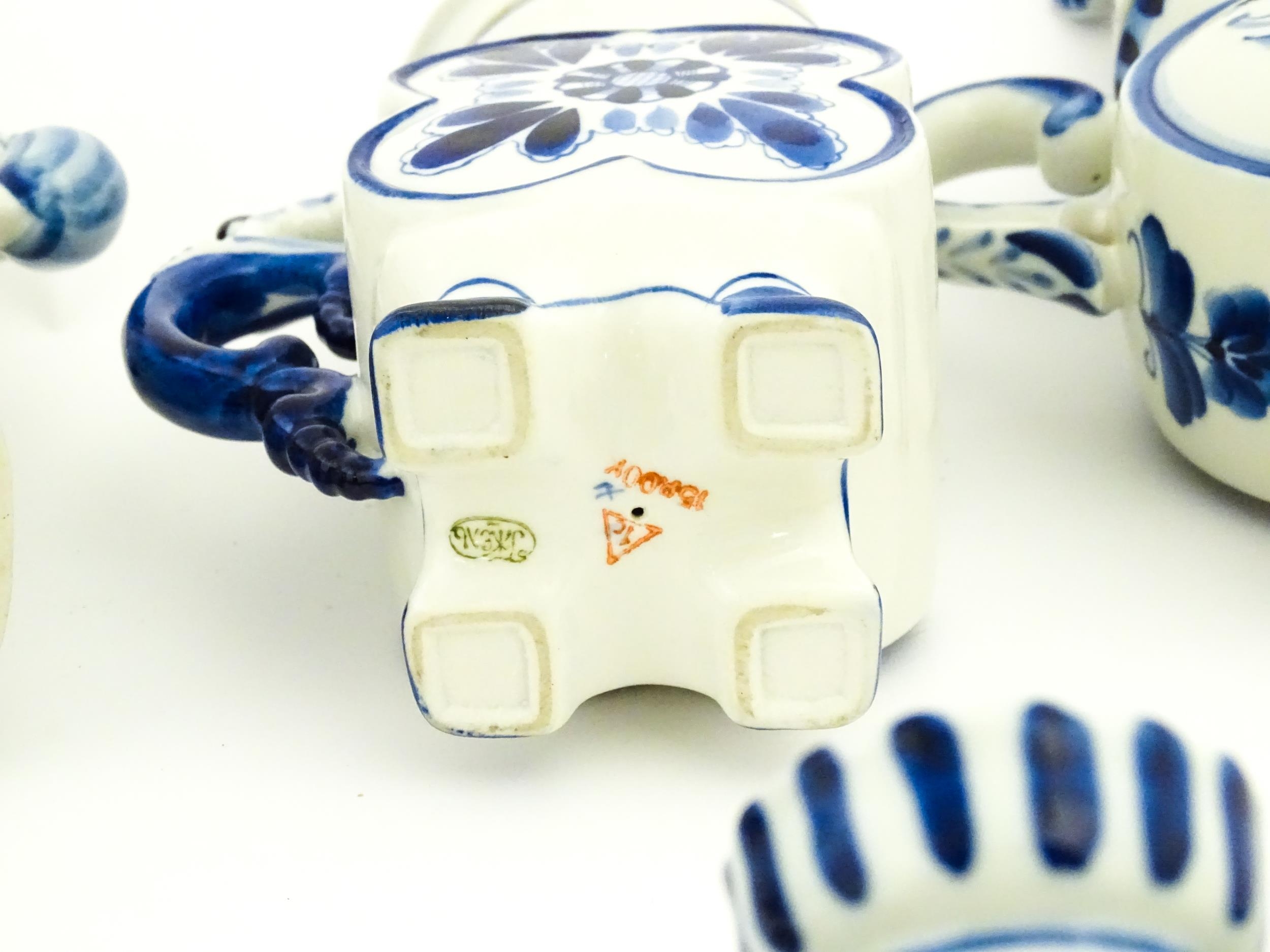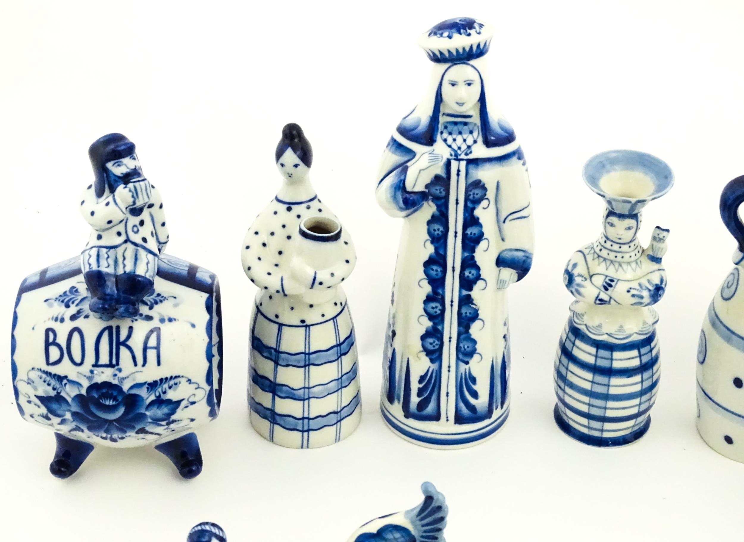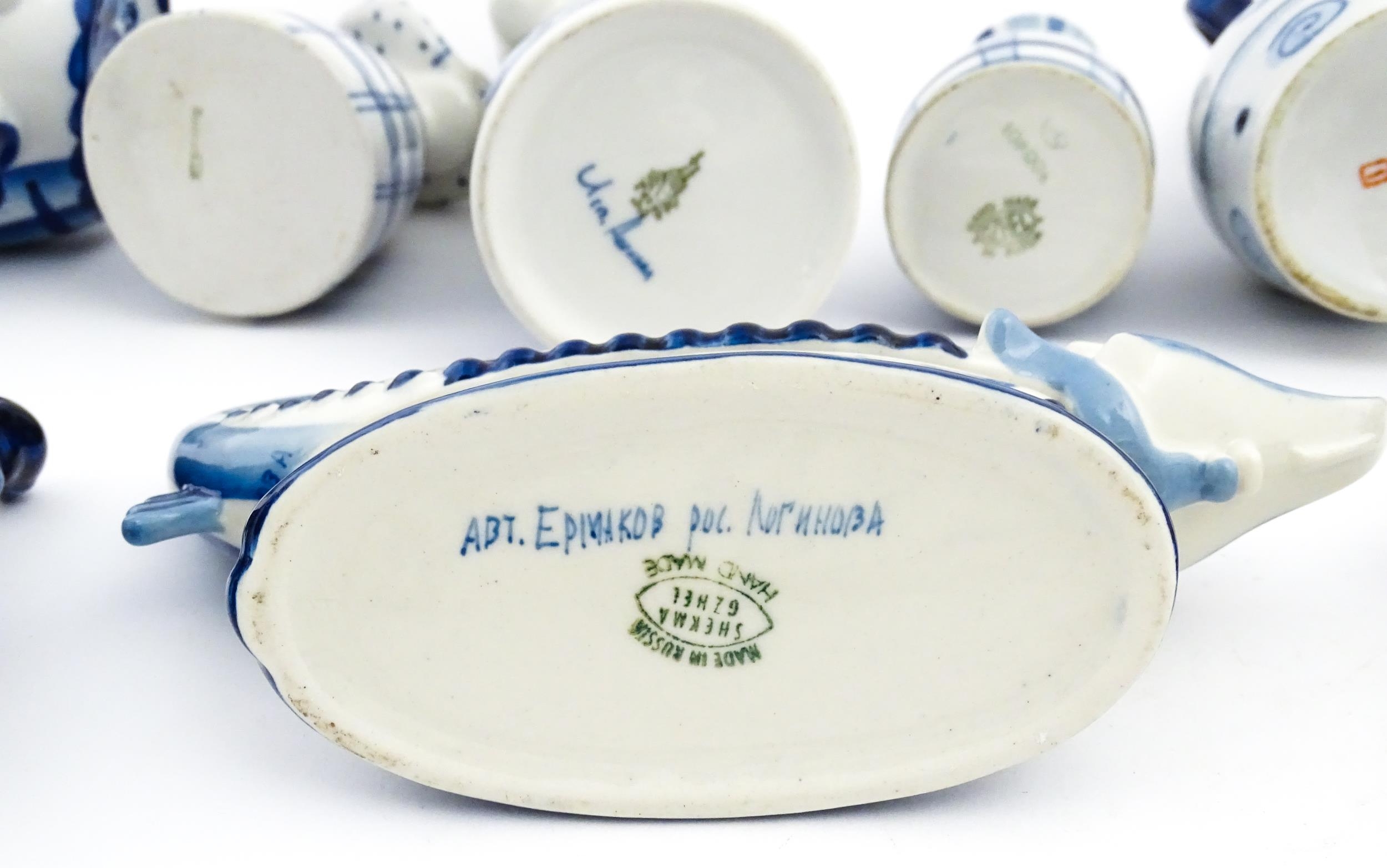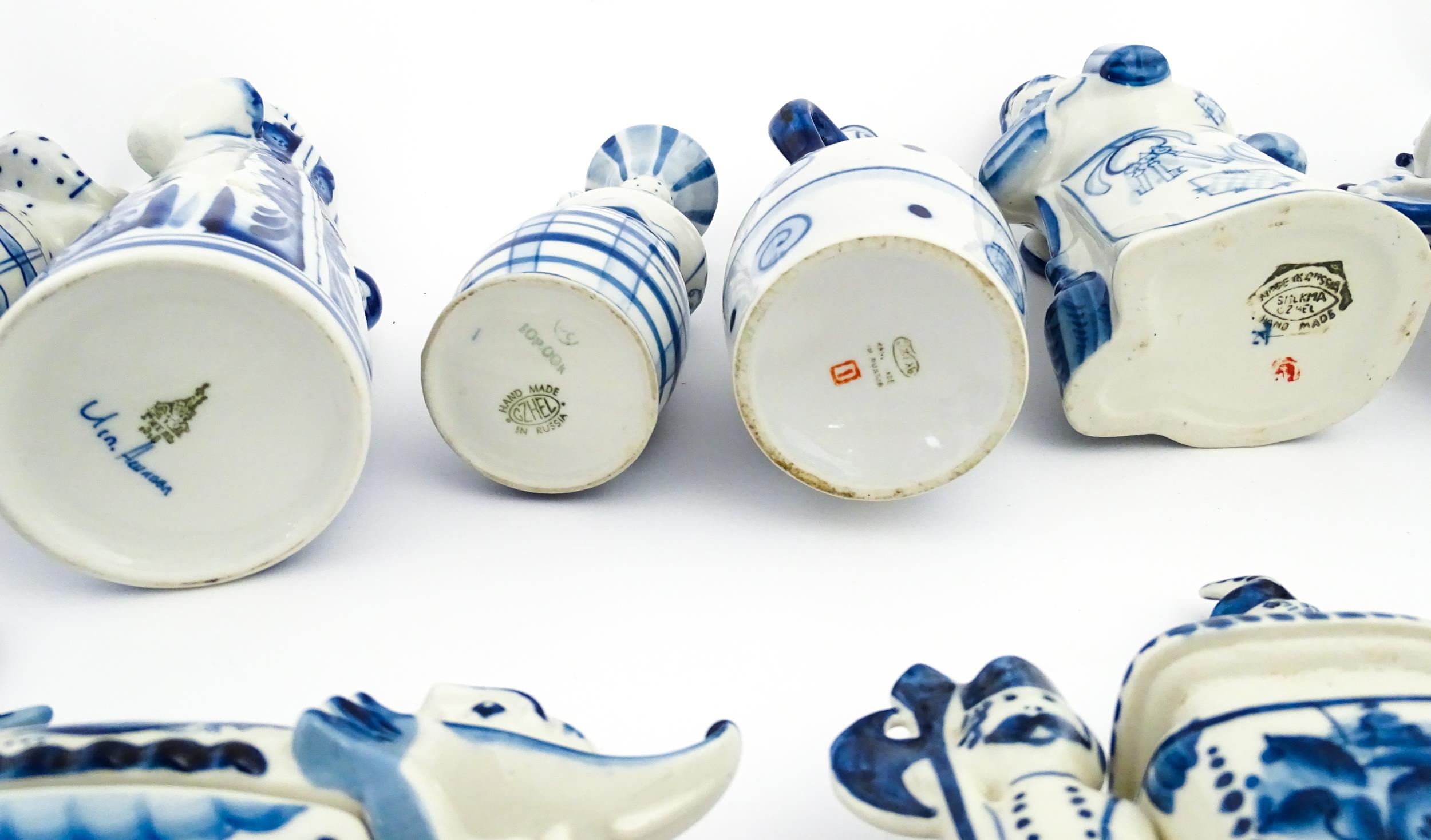 A quantity of Russian / USSR blue and white wares to include bottles / flask of figural form, teapots with floral detail, pot and covers of stylised fish form, etc. Makers to include Gzhel, etc. Largest approx. 11 1/4" high