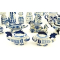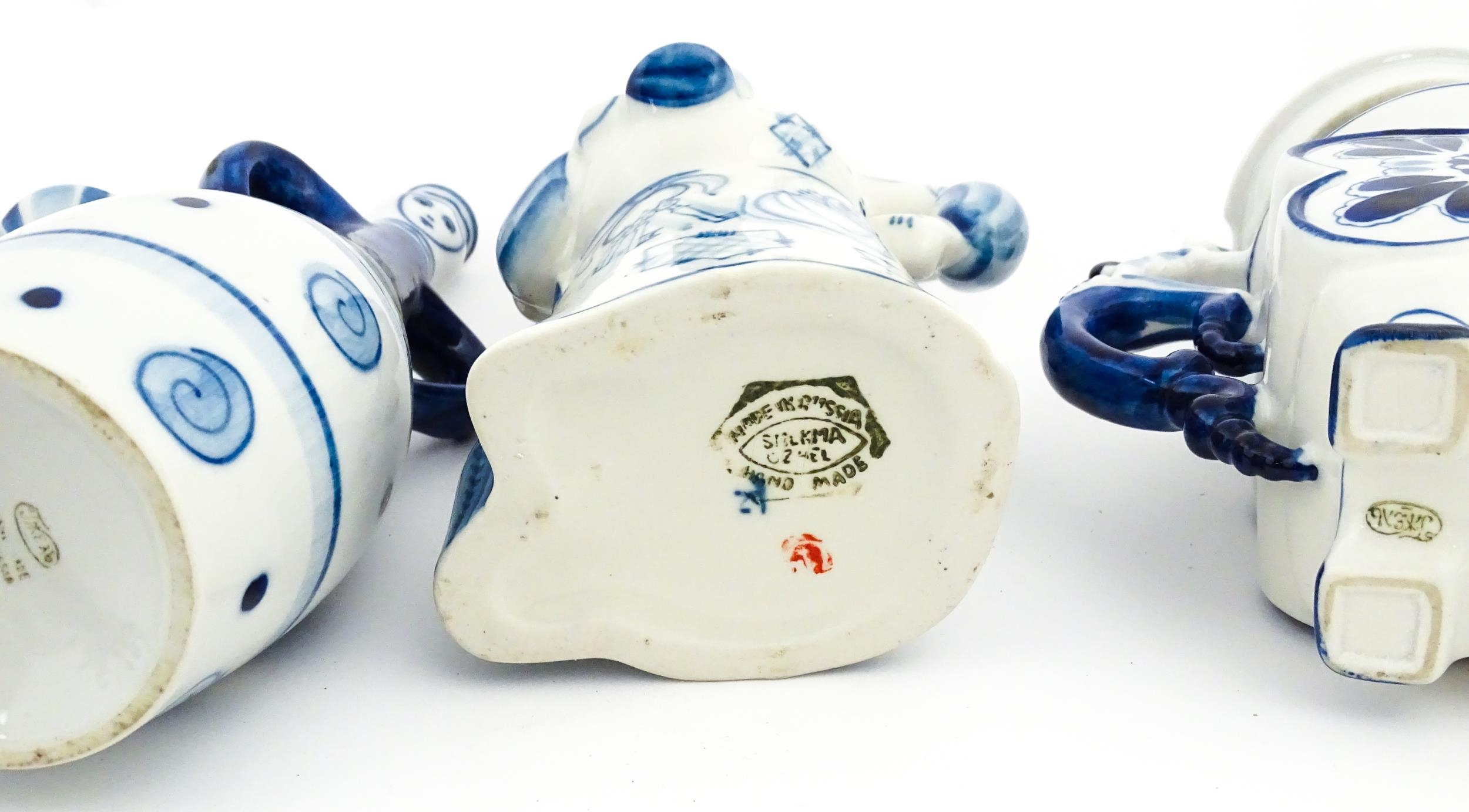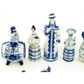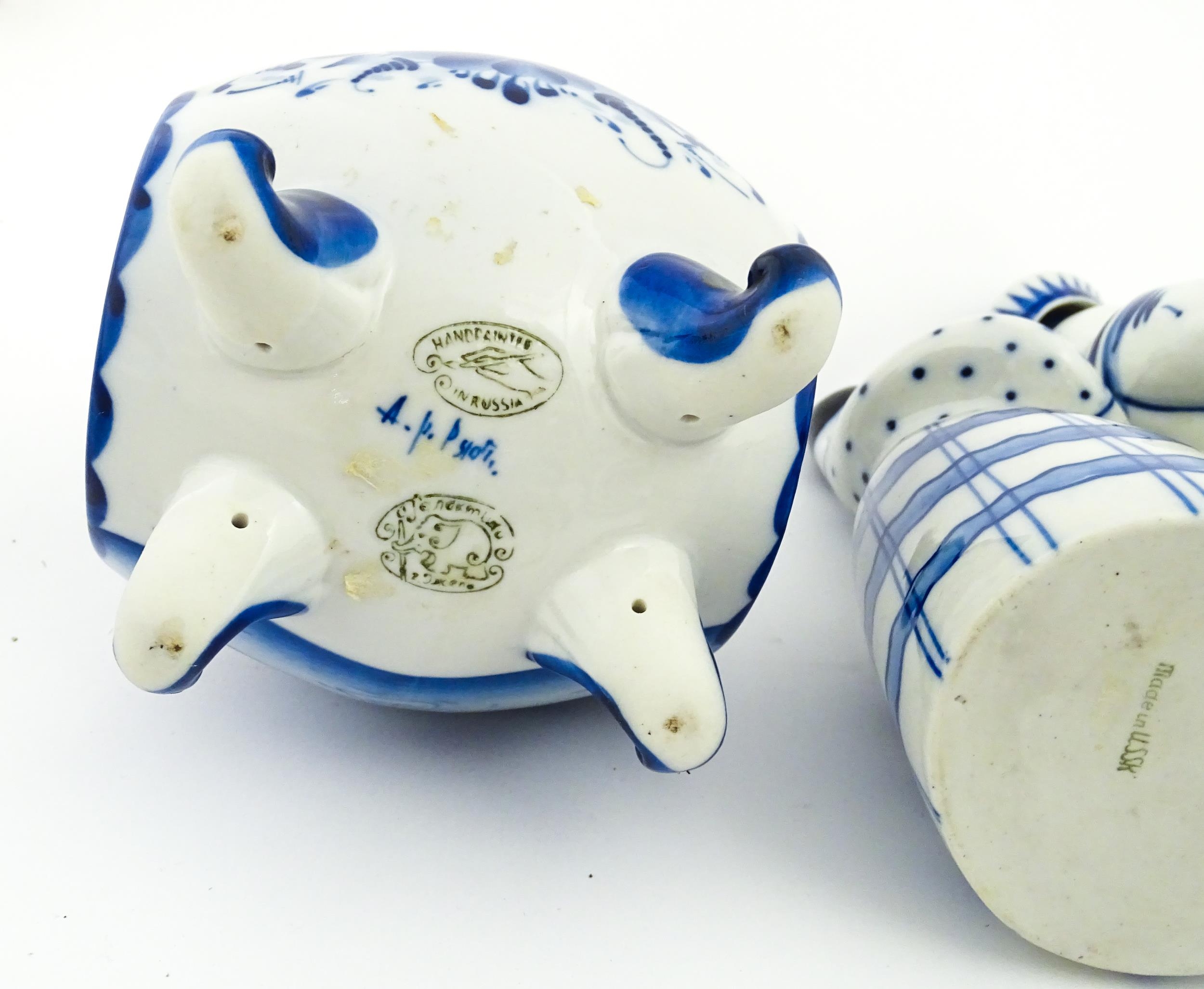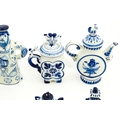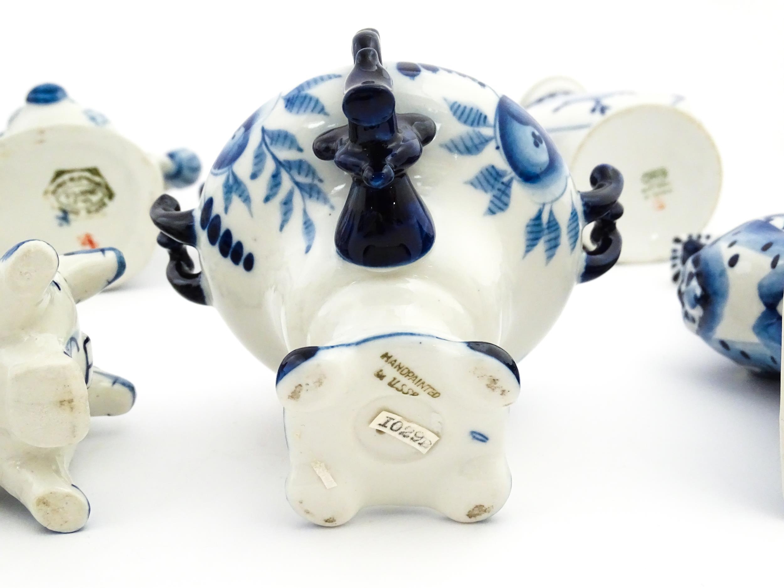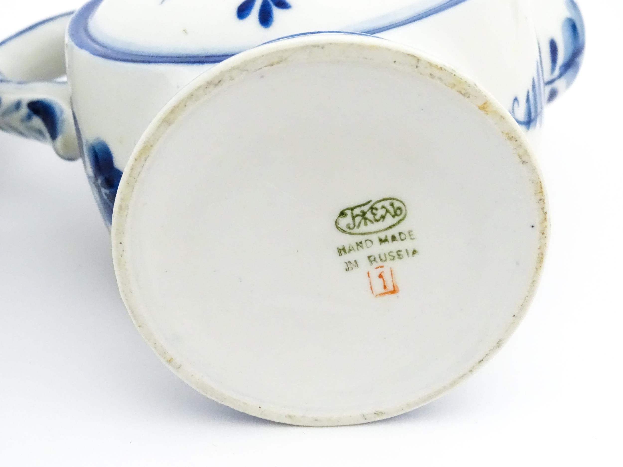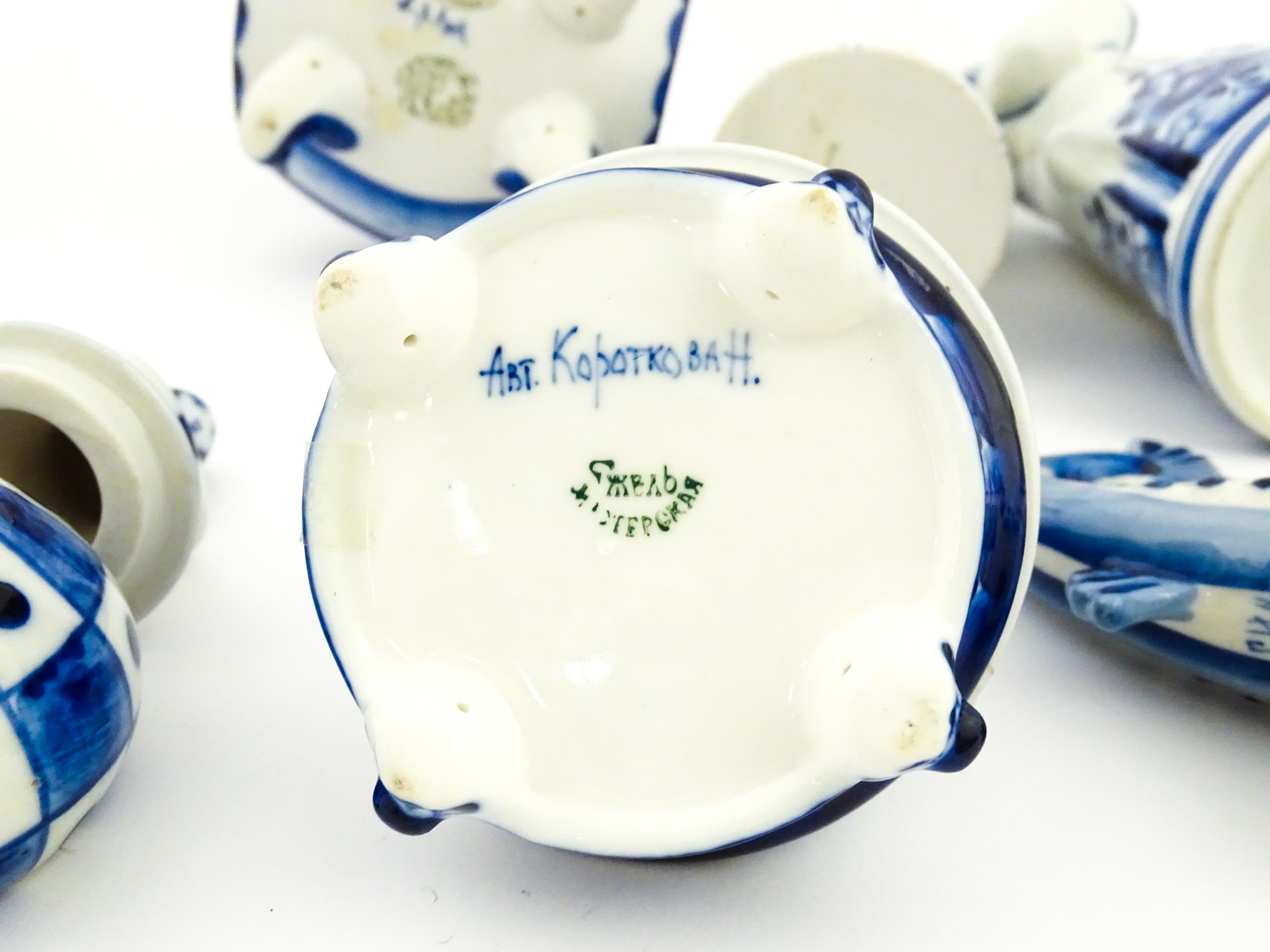 A quantity of Russian / USSR blue and white wares to include bottles / flask of figural form, teapots with floral detail, pot and covers of stylised fish form, etc. Makers to include Gzhel, etc. Largest approx. 11 1/4" high