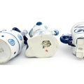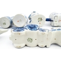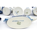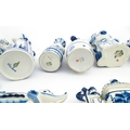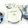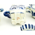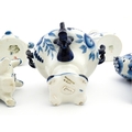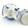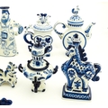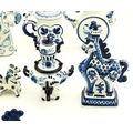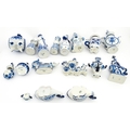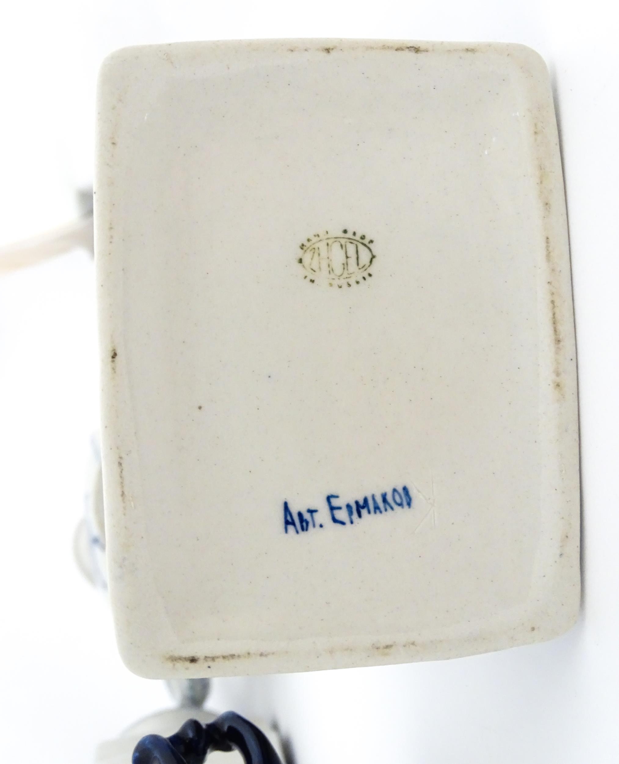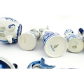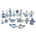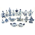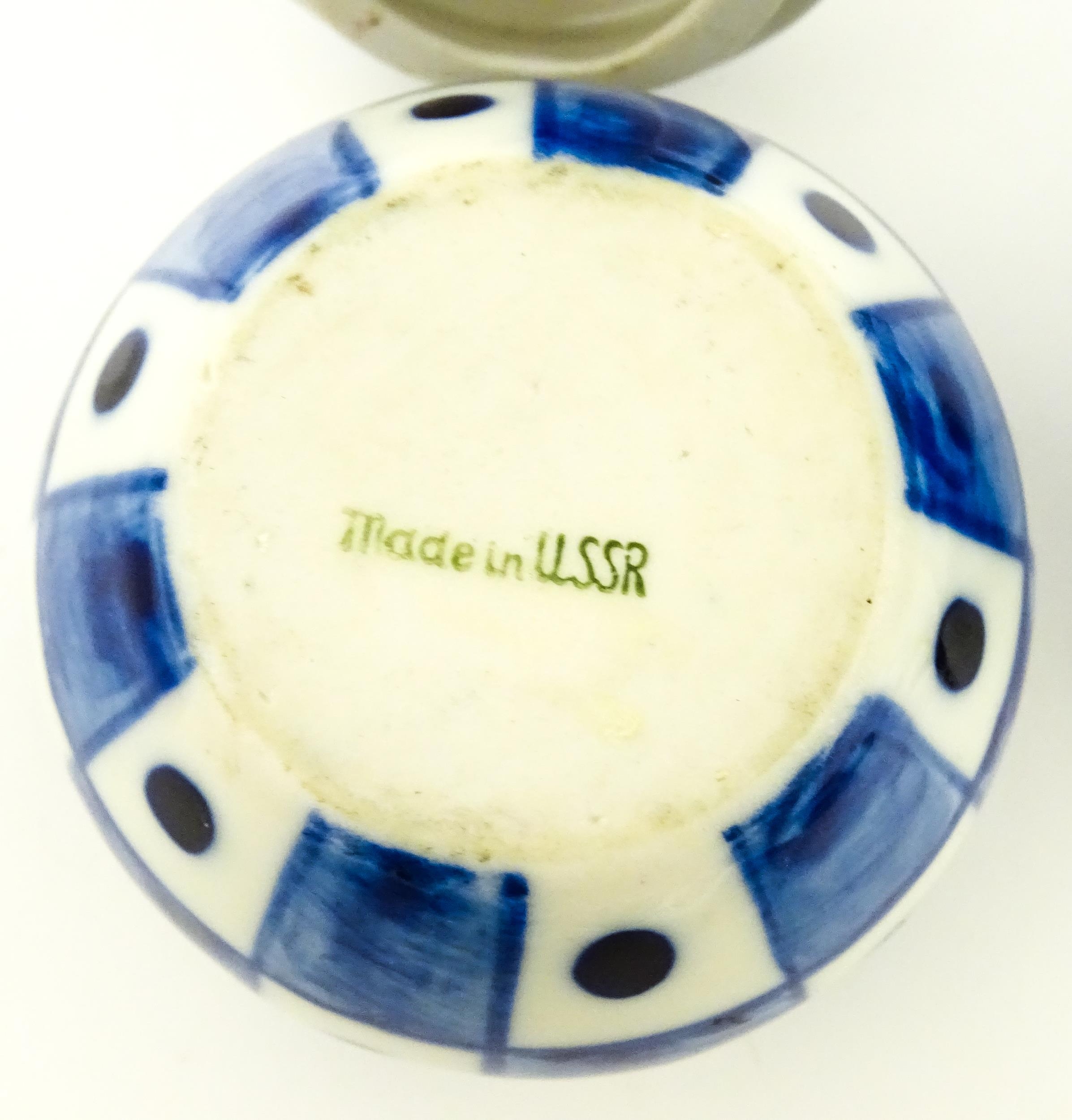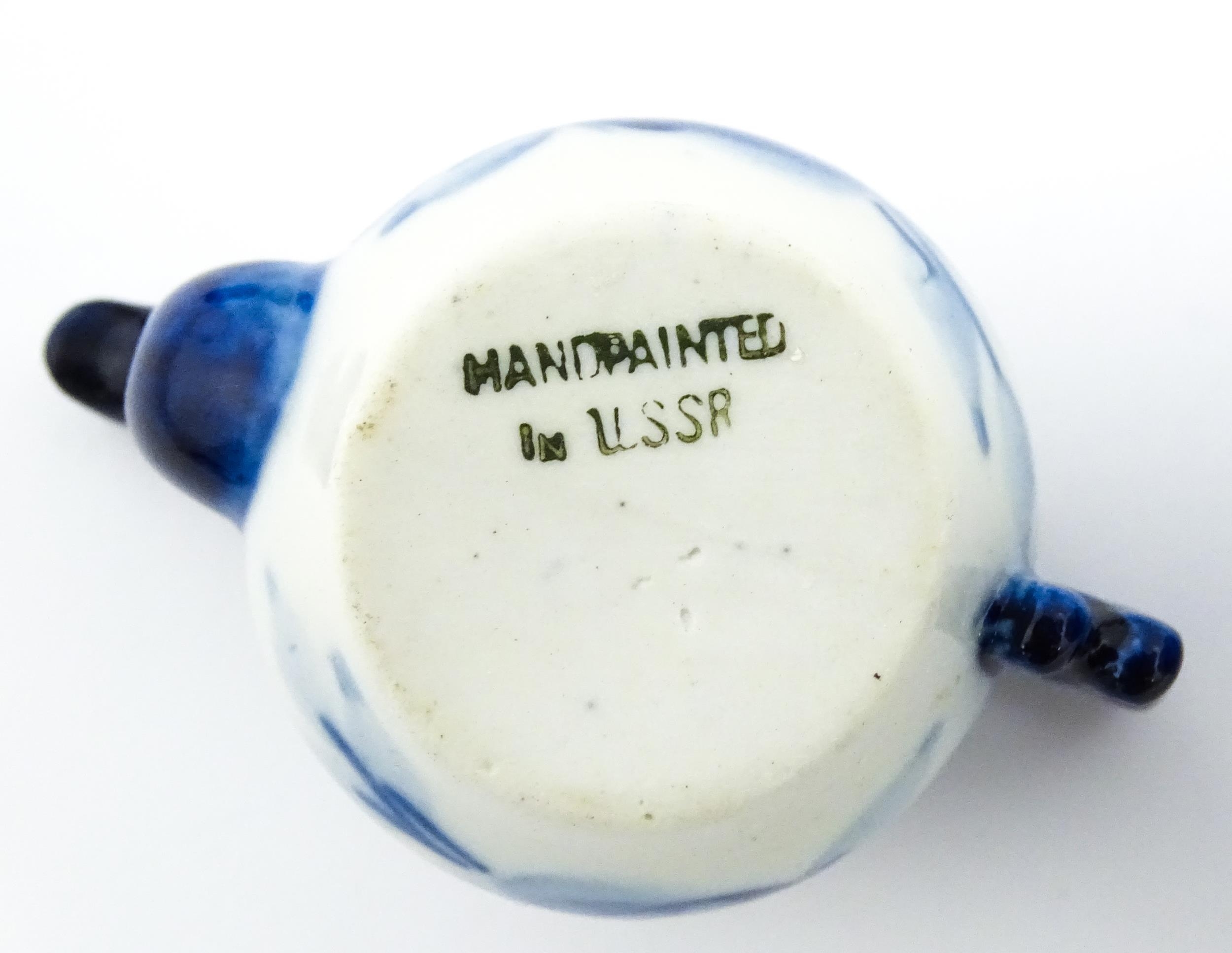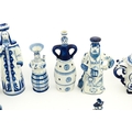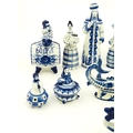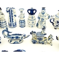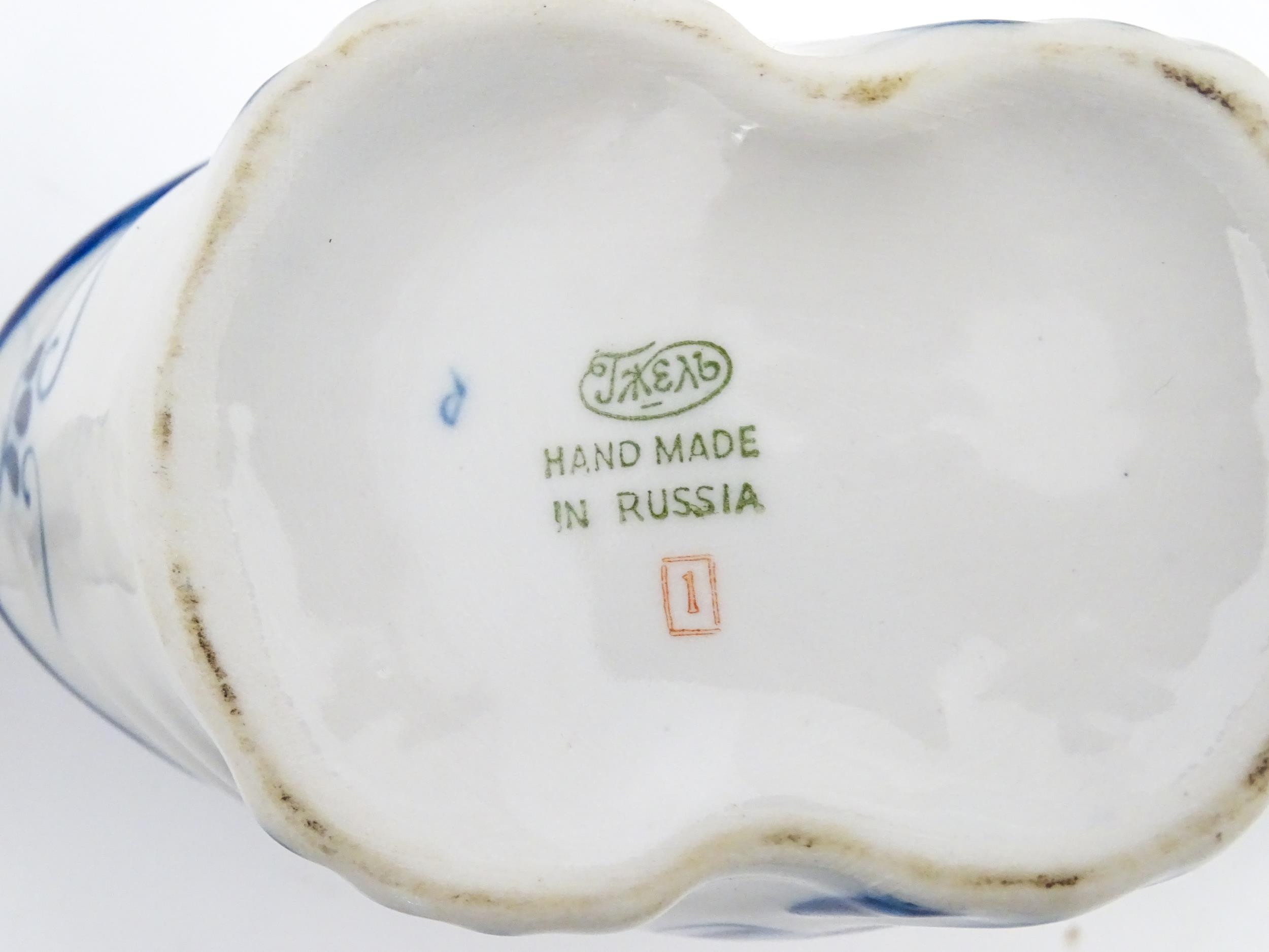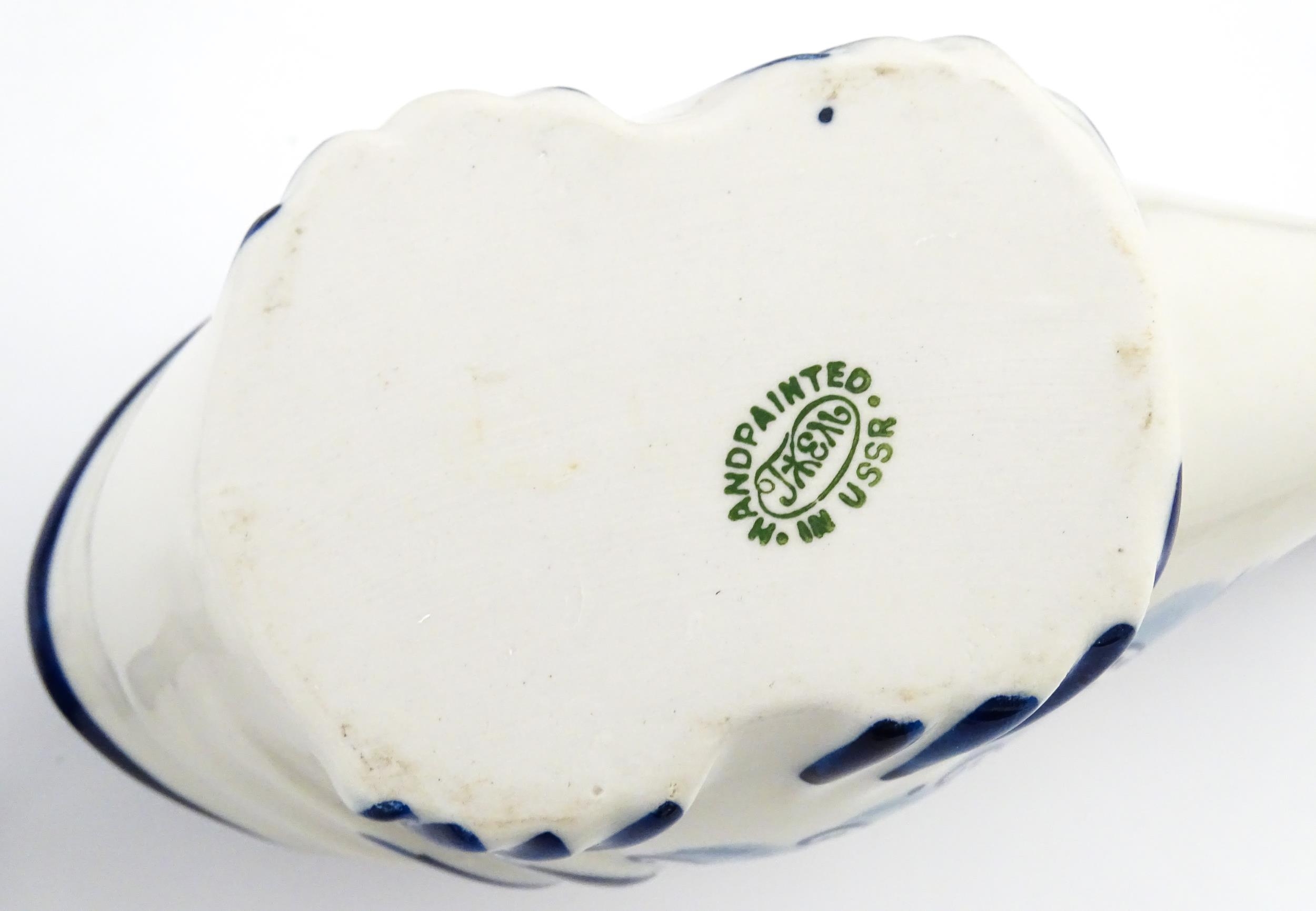 A quantity of Russian / USSR blue and white wares to include bottles / flask of figural form, teapots with floral detail, pot and covers of stylised fish form, etc. Makers to include Gzhel, etc. Largest approx. 11 1/4" high