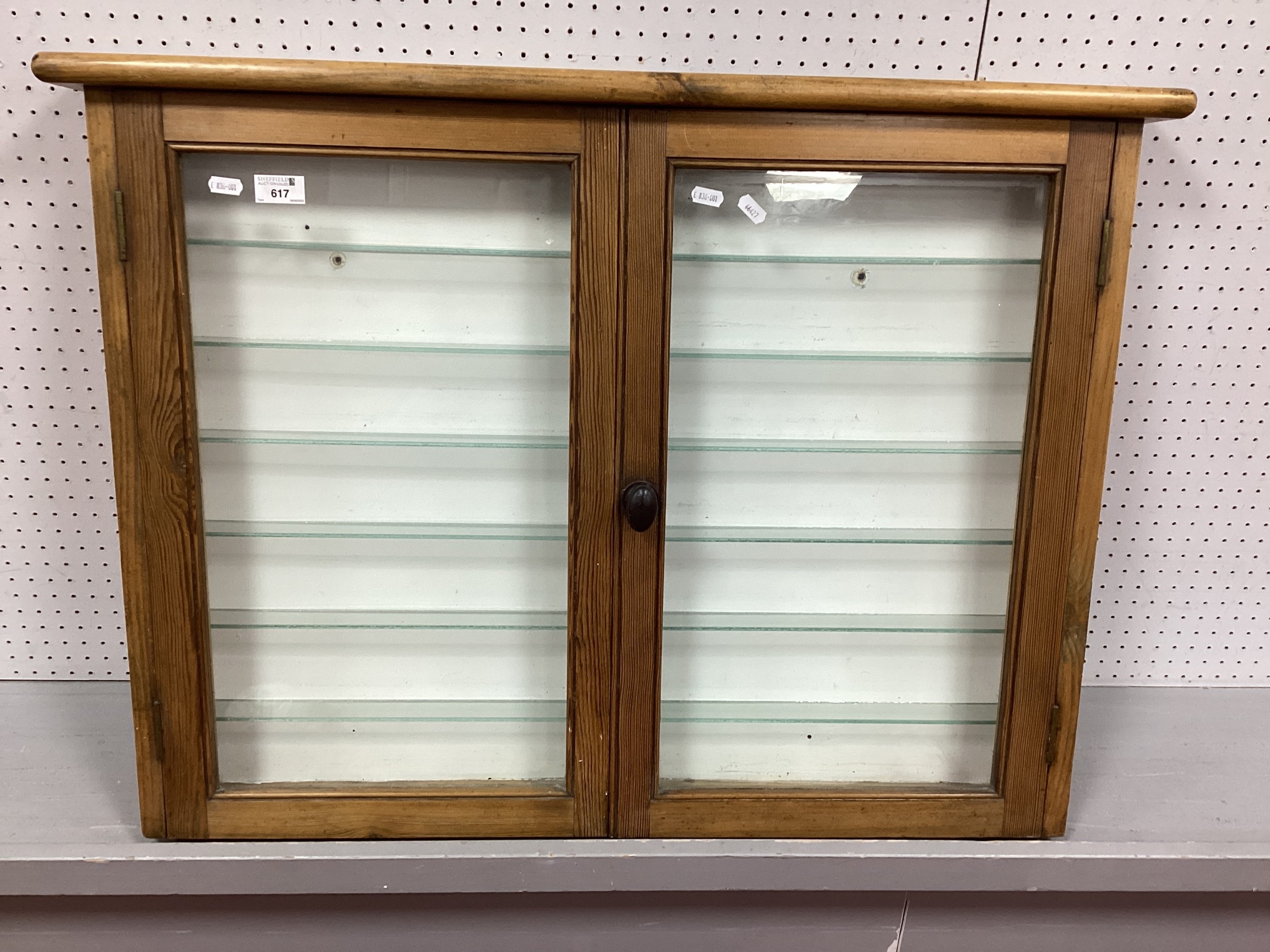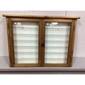 A Wall Mounted Double Door Glass Fronted Display Cabinet with glass shelves 82cm w x 67cm h x 10cm d.
