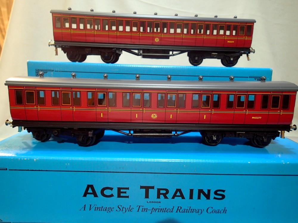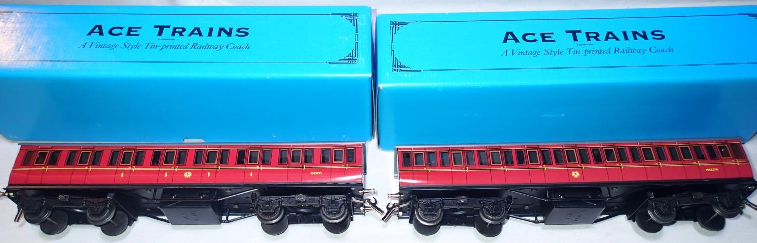 O gauge Ace Trains, pair of C1 BR Maroon Suburban coaches, 1st class and 3rd class with windows, in near mint condition/boxed. P&P Group 1 (£14+VAT for the first lot and £1+VAT for subsequent lots)