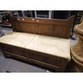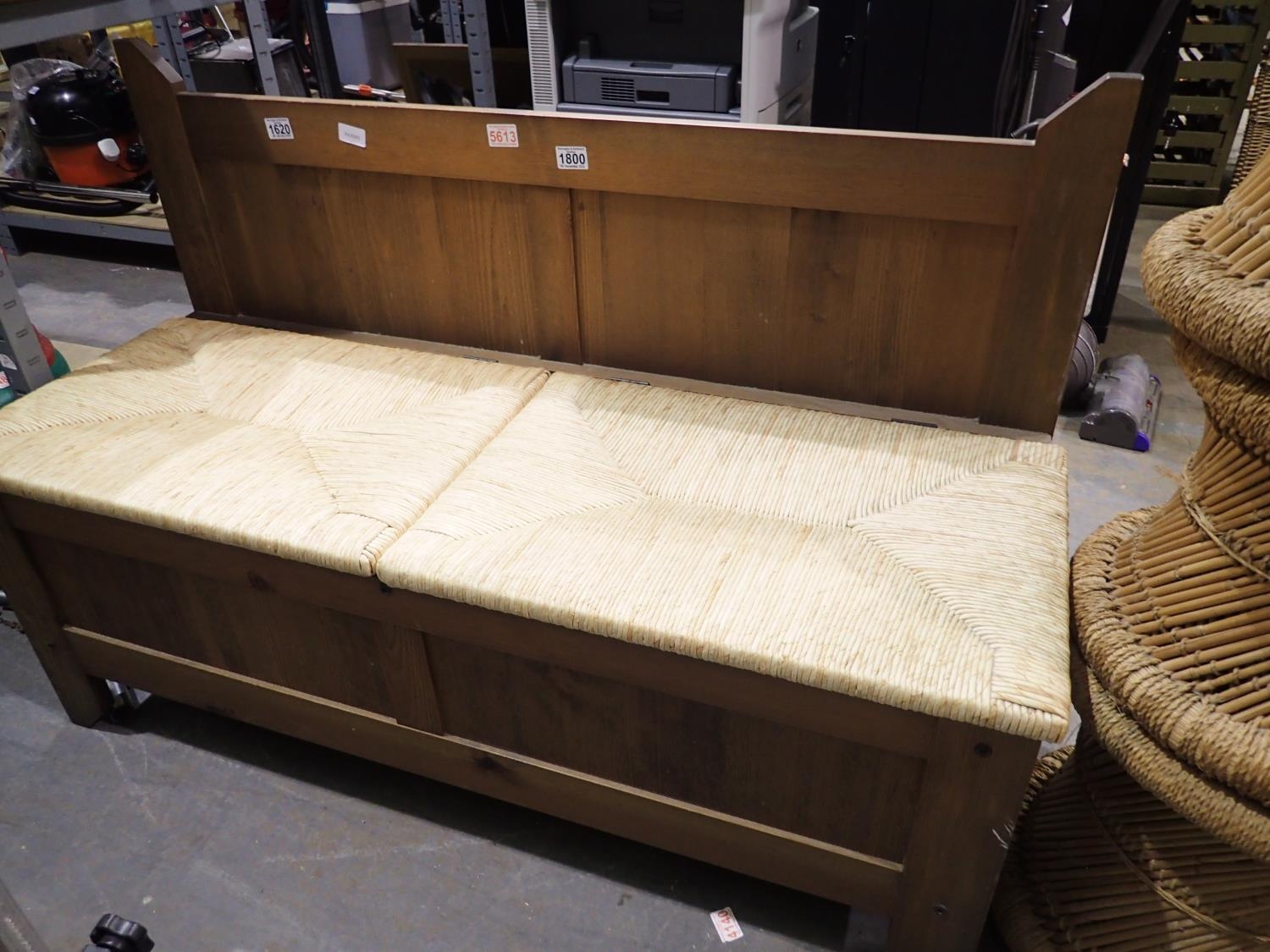 Pine framed storage pew with rush seats and under storage, 124 x 46 x 83 cm H. Not available for in-house P&P
