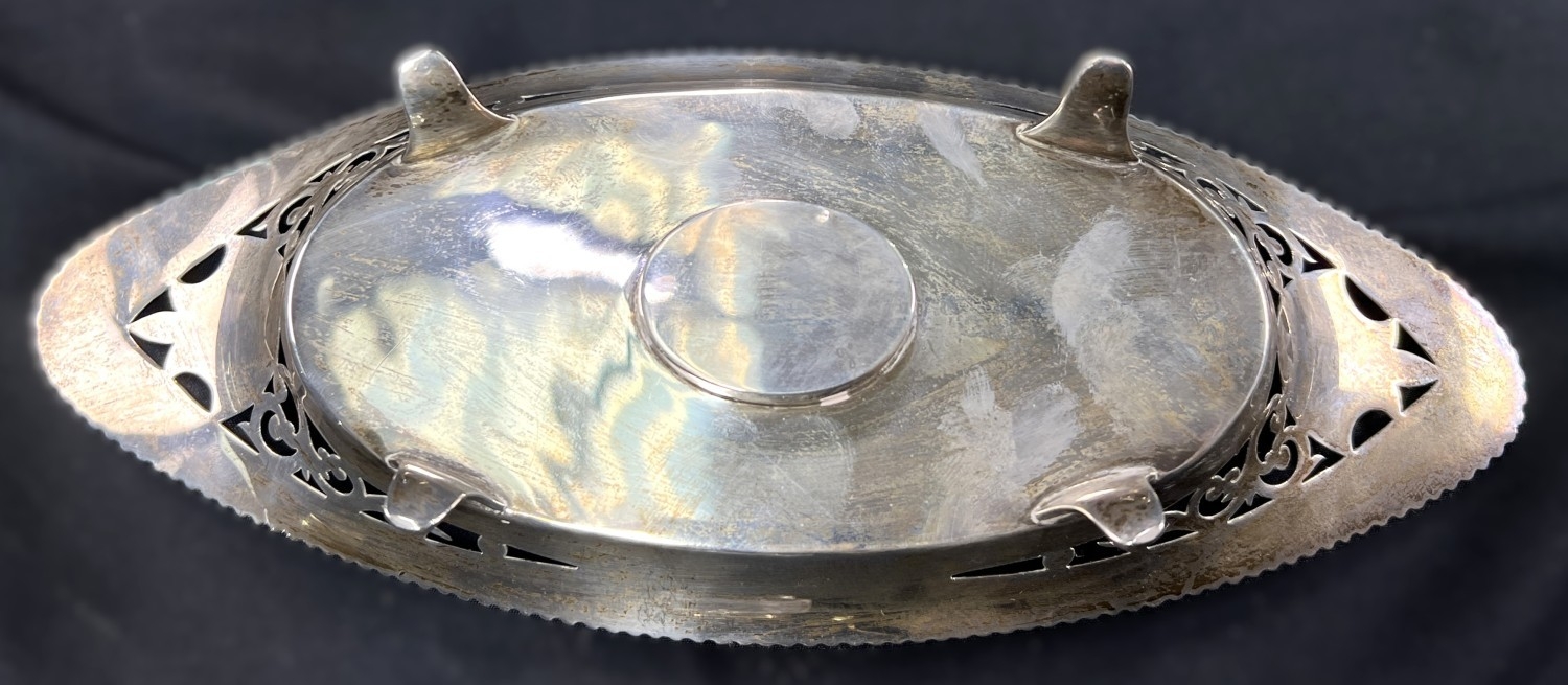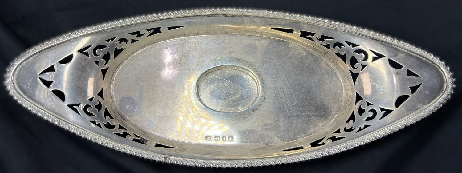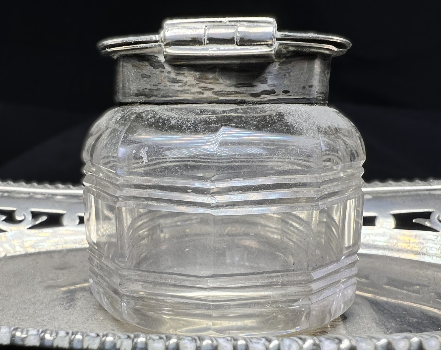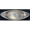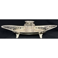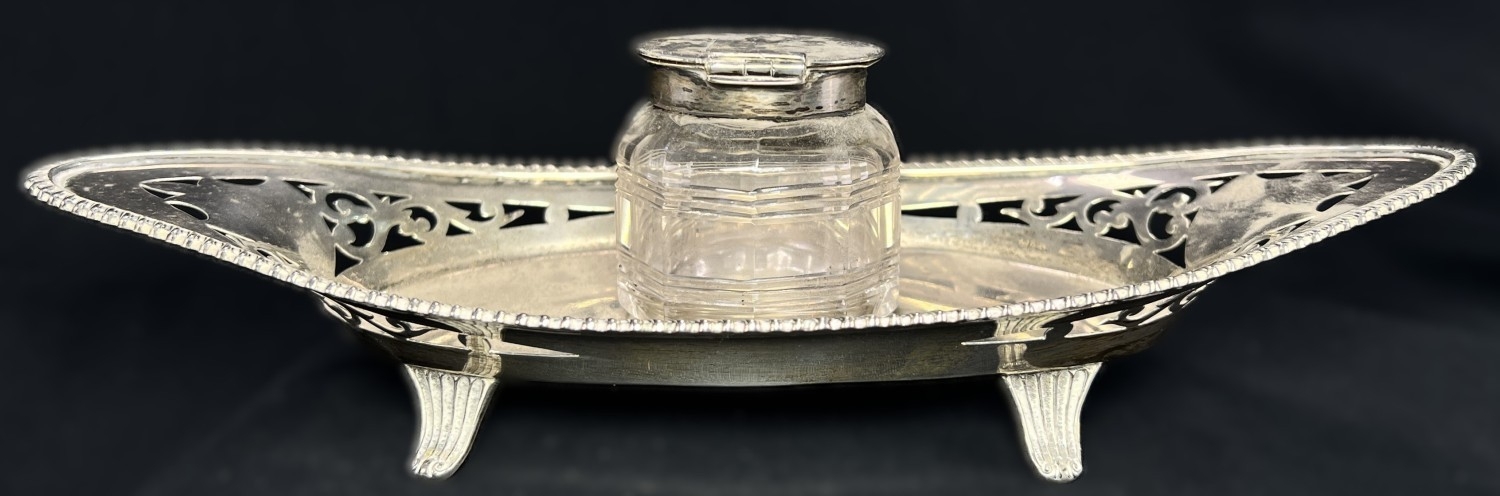An oval hallmarked silver ink stand with pierced and gadrooned decoration, on 4 scroll feet, Birmngham 1899, 4.5ozt, length 24cm