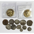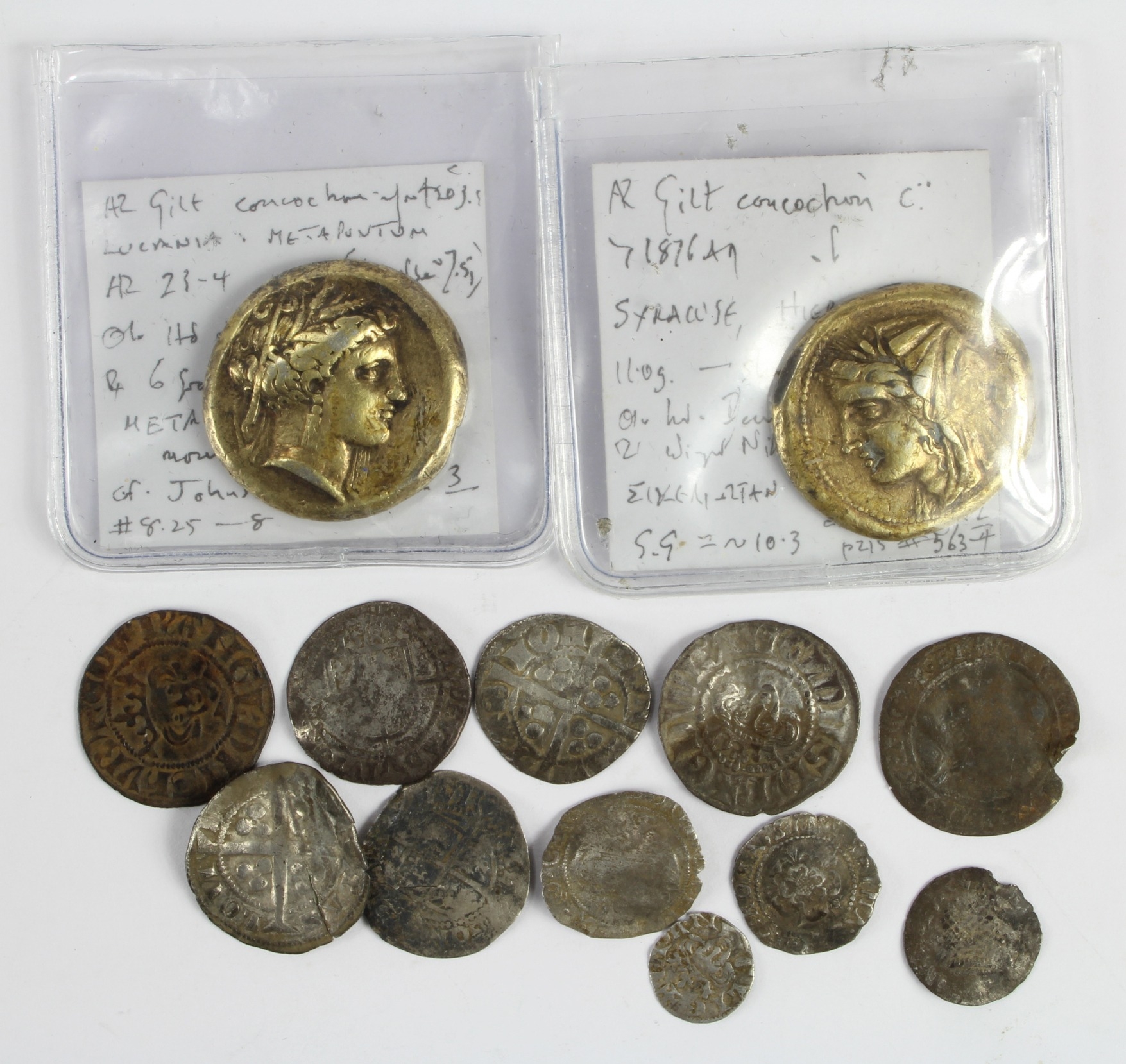 English hammered coins etc (11) noted Edwardian Pennies F-VF; an Edward Farthing of London GF; a James I thistle/rose Penny crinkled nVF etc; also 2x antique gilt electrotypes or concoctions of Ancient Greek coins.