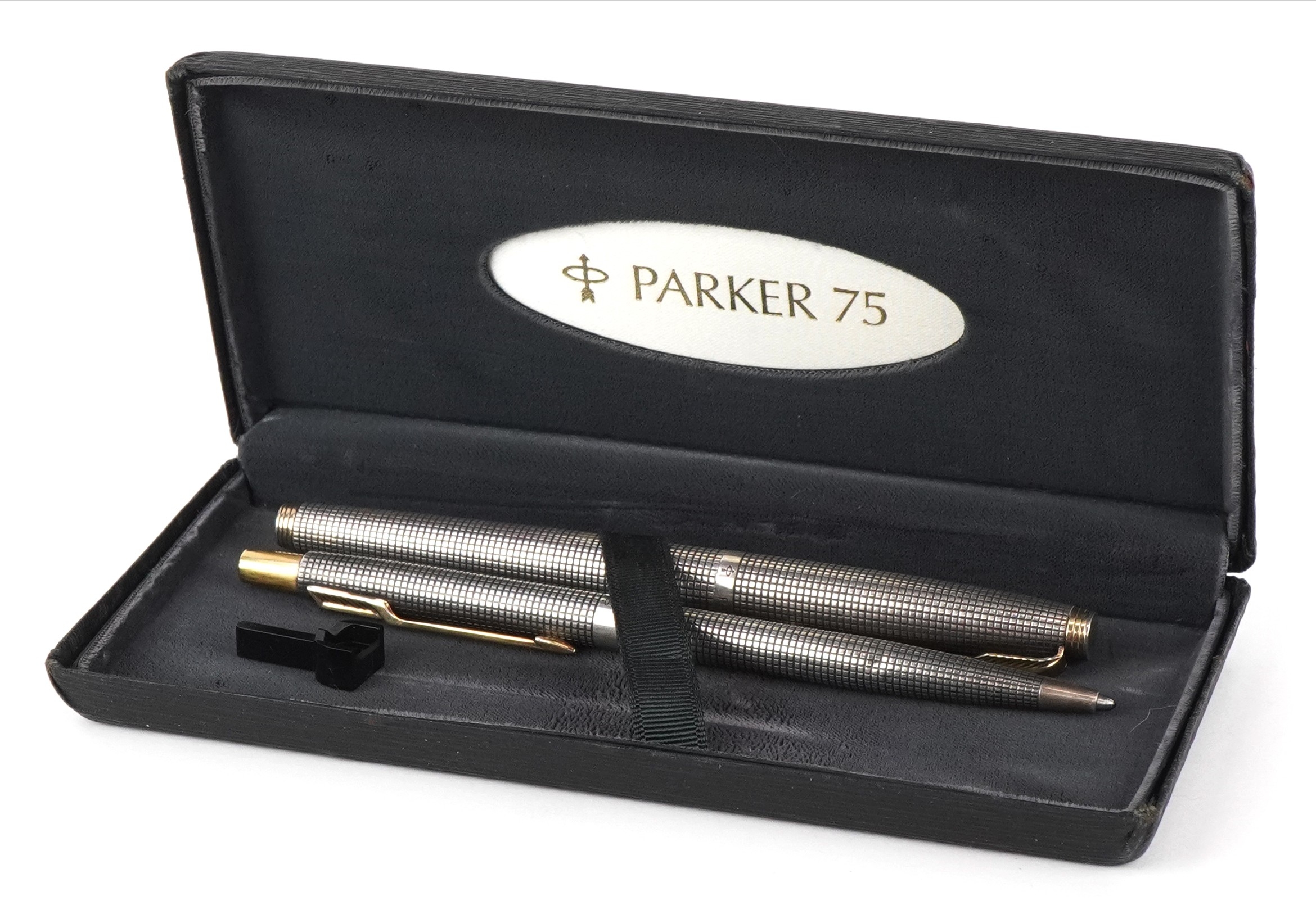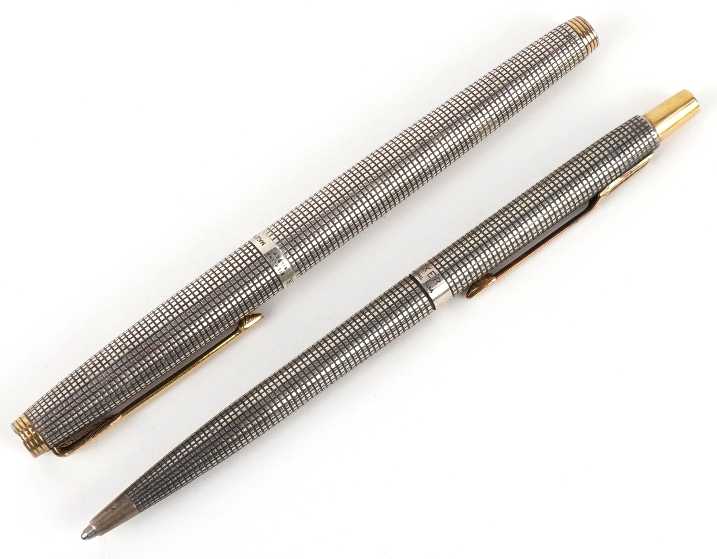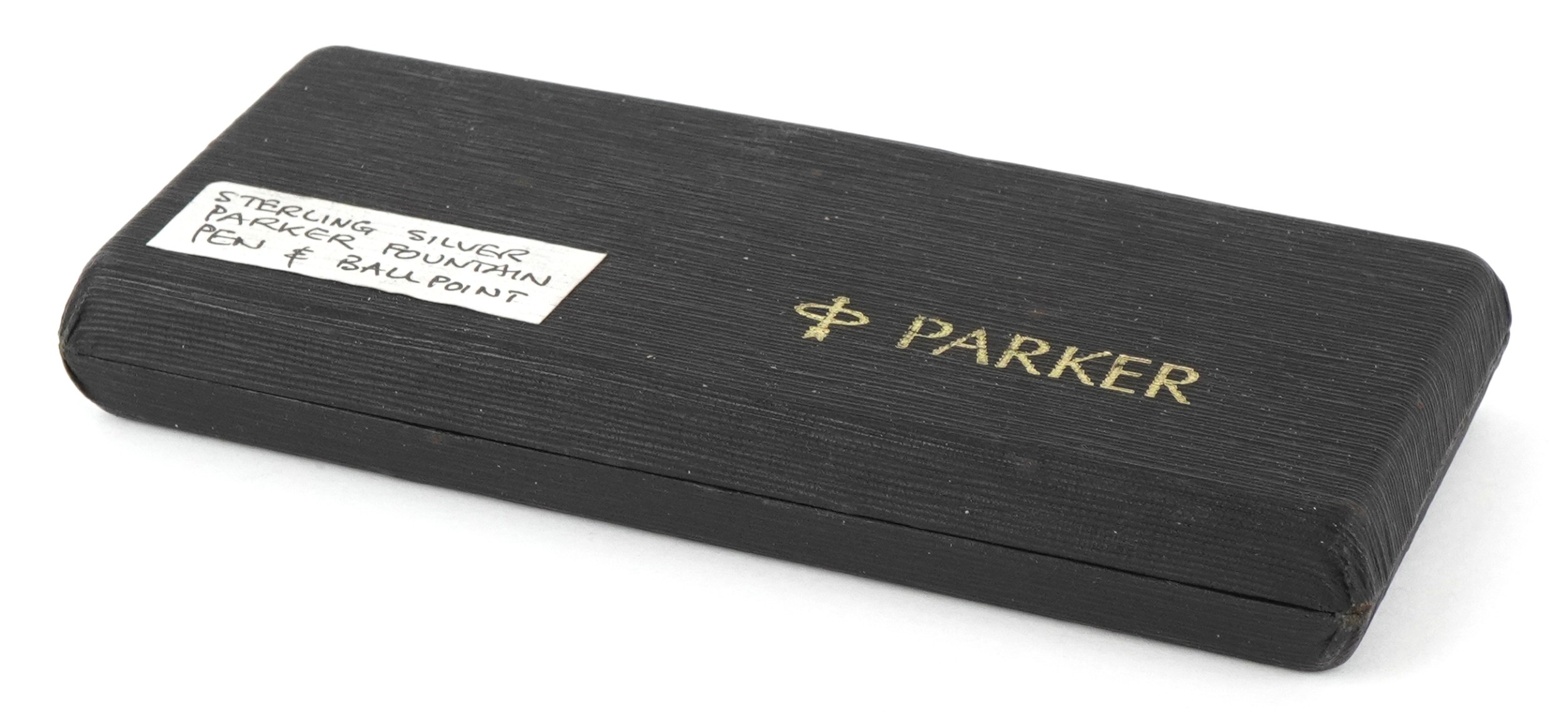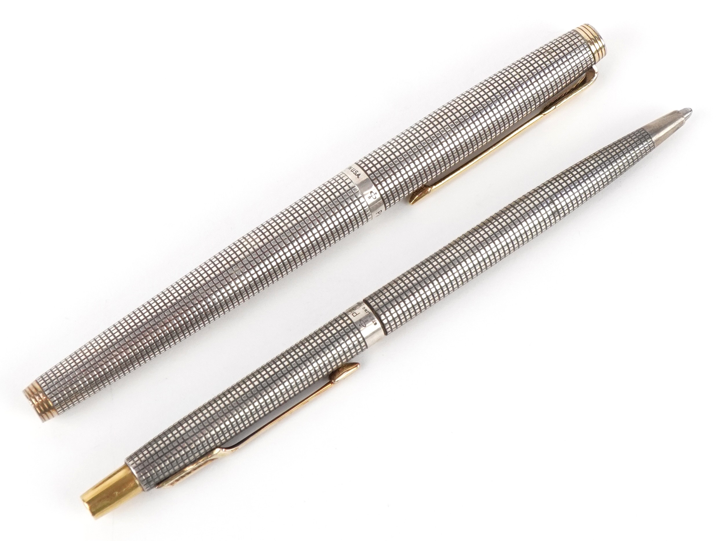 A Parker 75 sterling silver fountain pen and ballpoint pen set with box and certificate, the fountain pen with 14K gold nib, the largest 13cm in length.