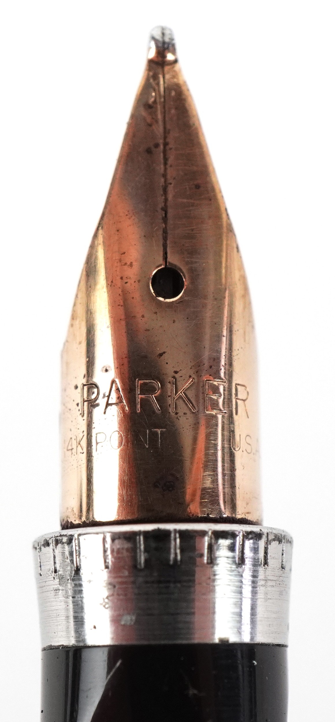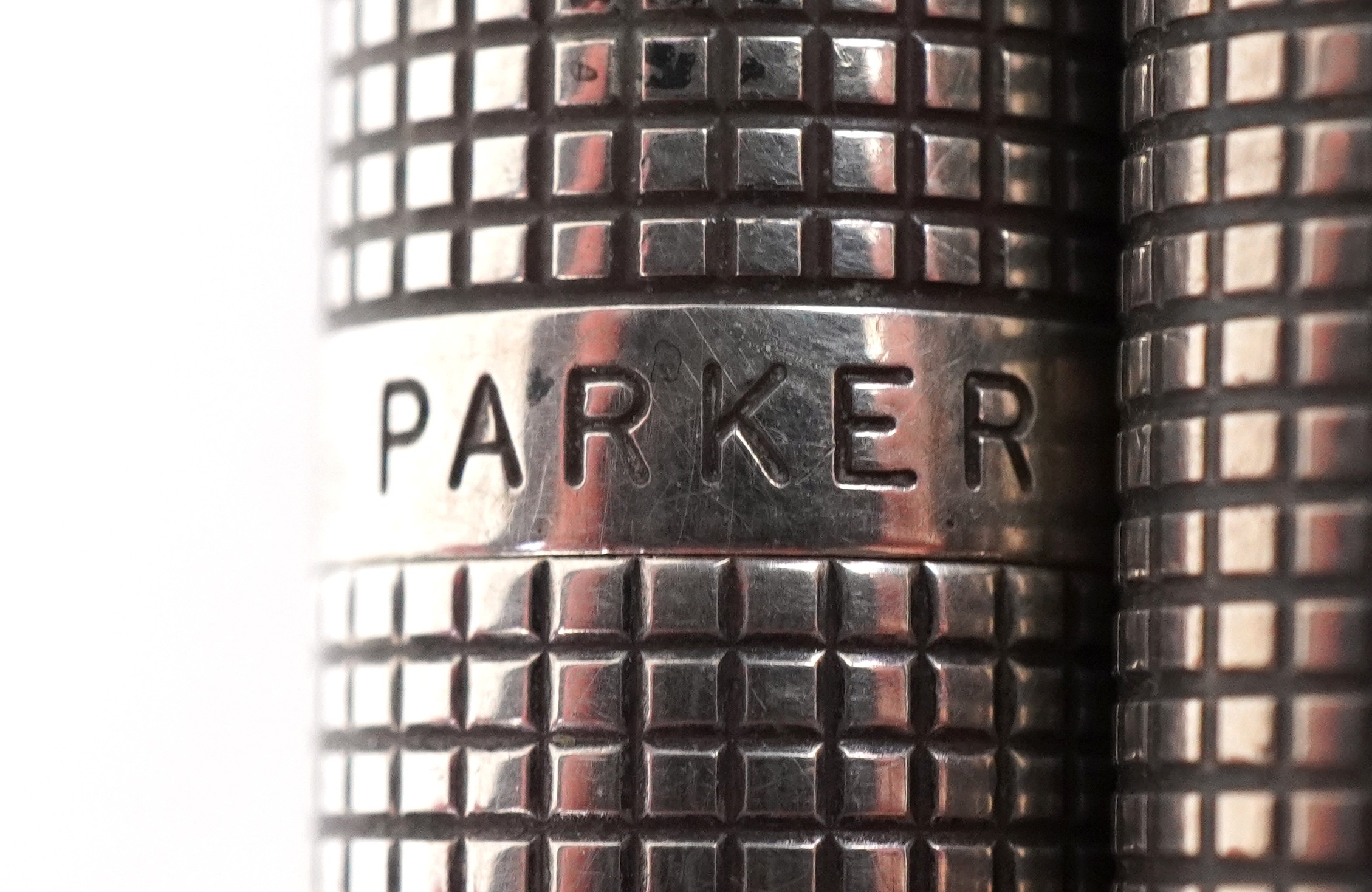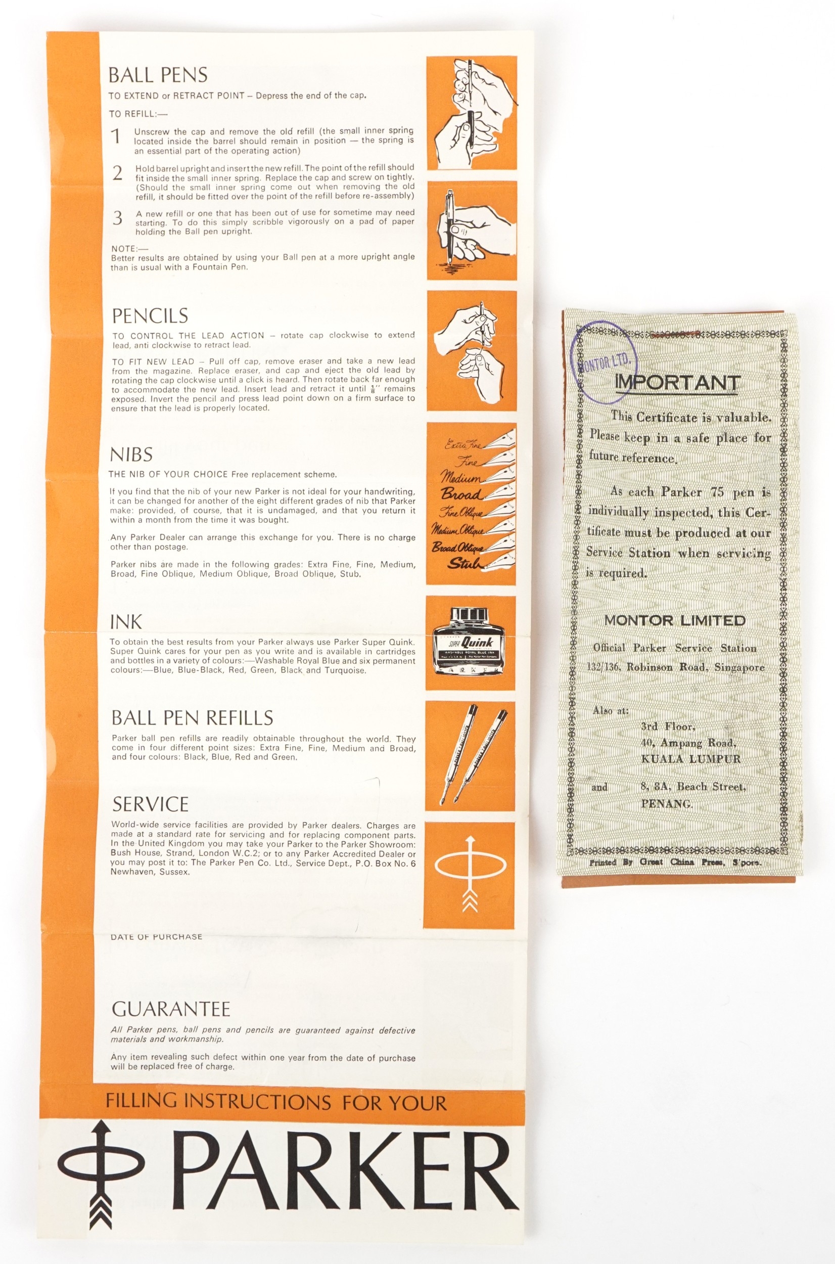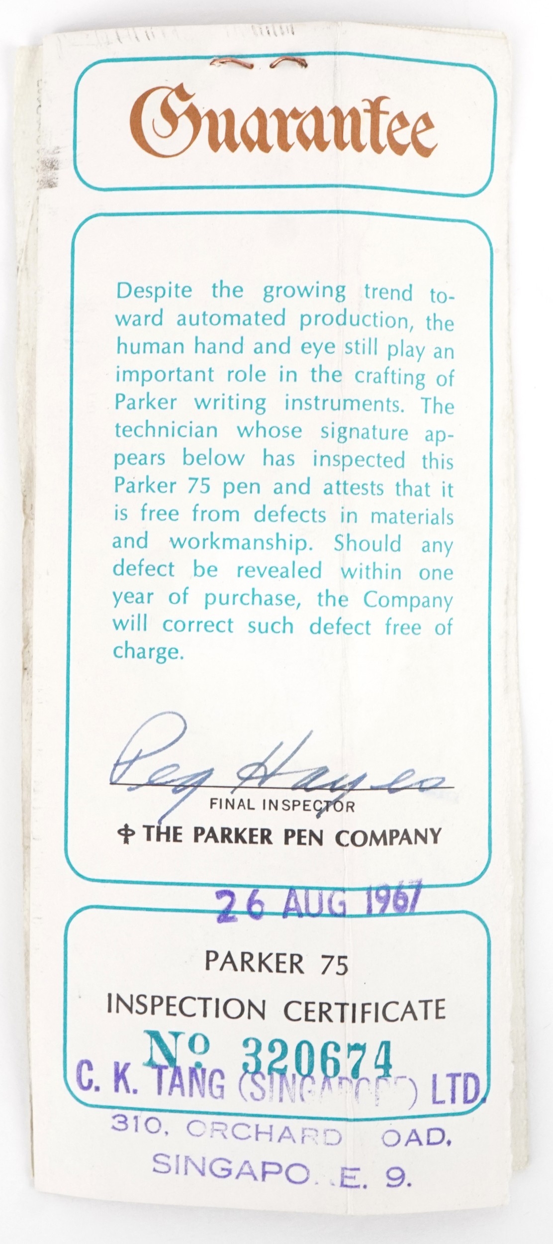 A Parker 75 sterling silver fountain pen and ballpoint pen set with box and certificate, the fountain pen with 14K gold nib, the largest 13cm in length.