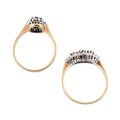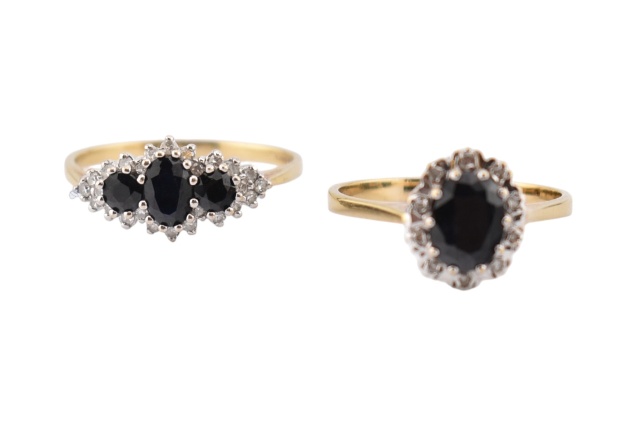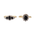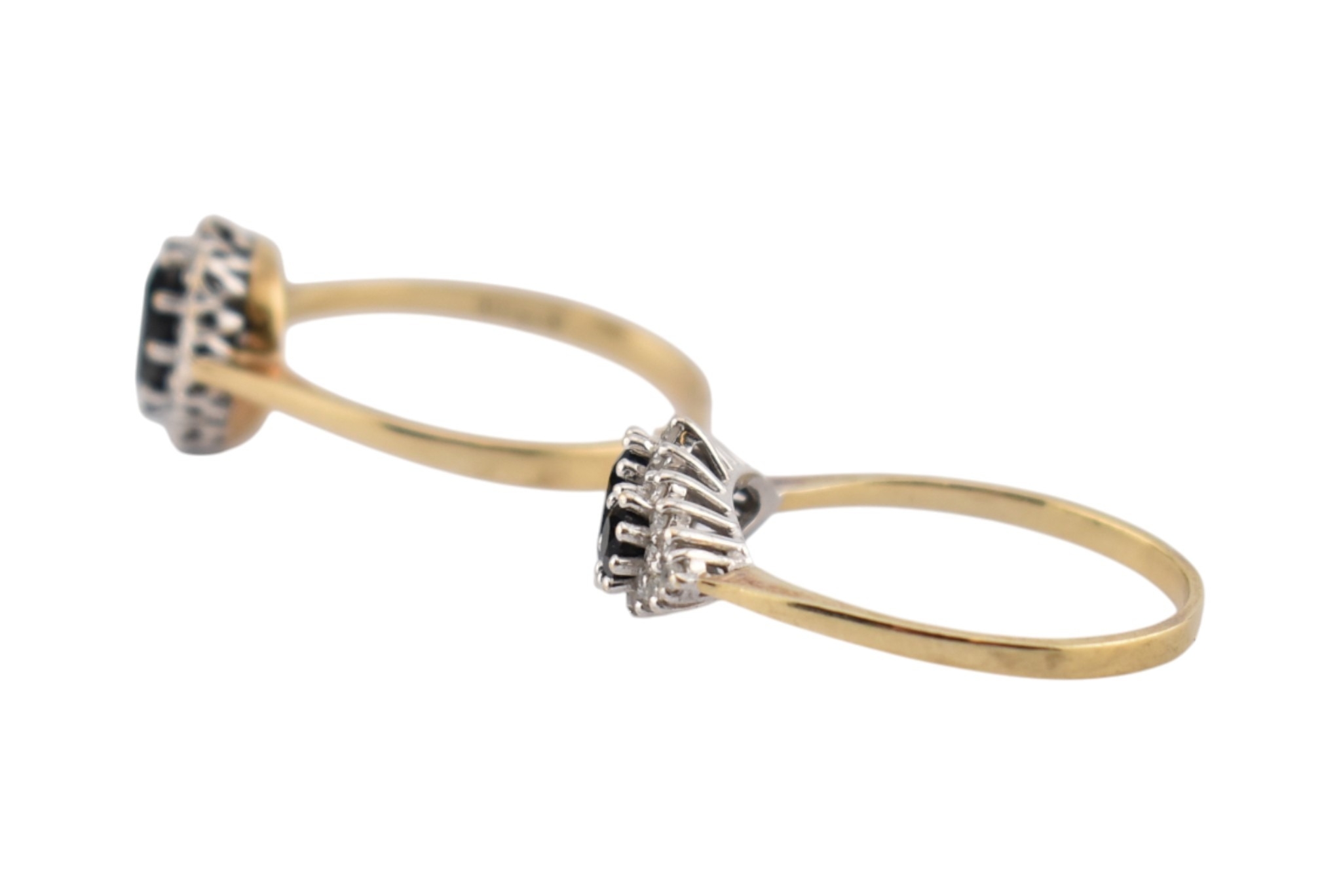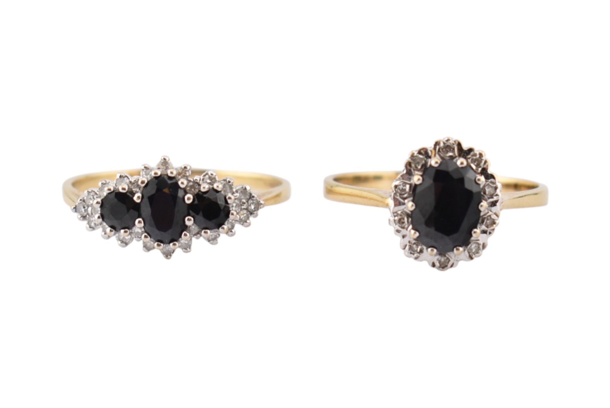 Two 9ct gold sapphire and diamond cluster rings. Weight 5.2g. Both size T.