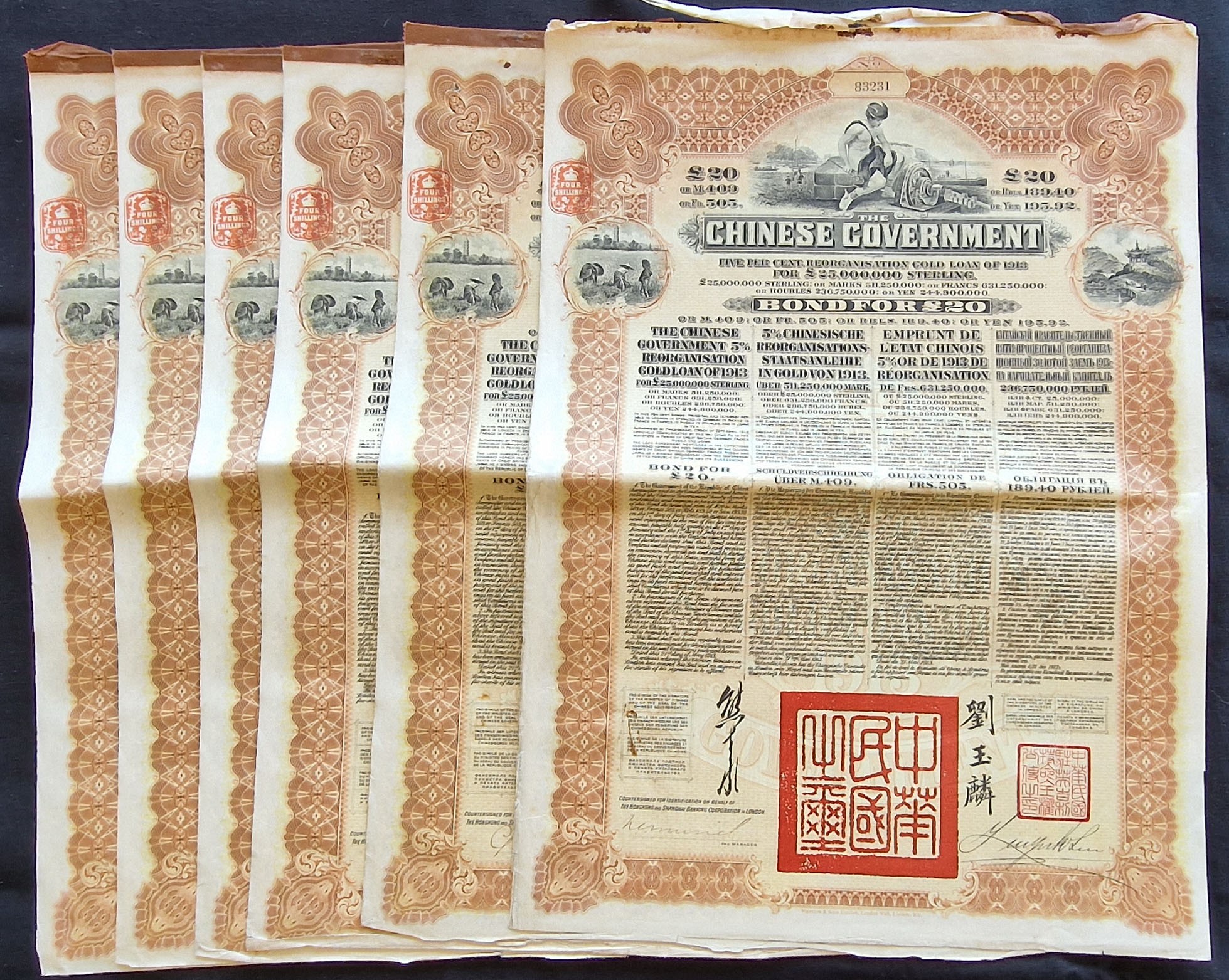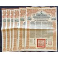 China: 1913 5% Reorganisation Gold Loan, a group of 6 bonds for £20, issued by HSBC, Mercury at top, brown and black, printed by Waterlow & Sons, with coupons. One with loose brown tape at top, a few rust marks but generally VF-EF (6).