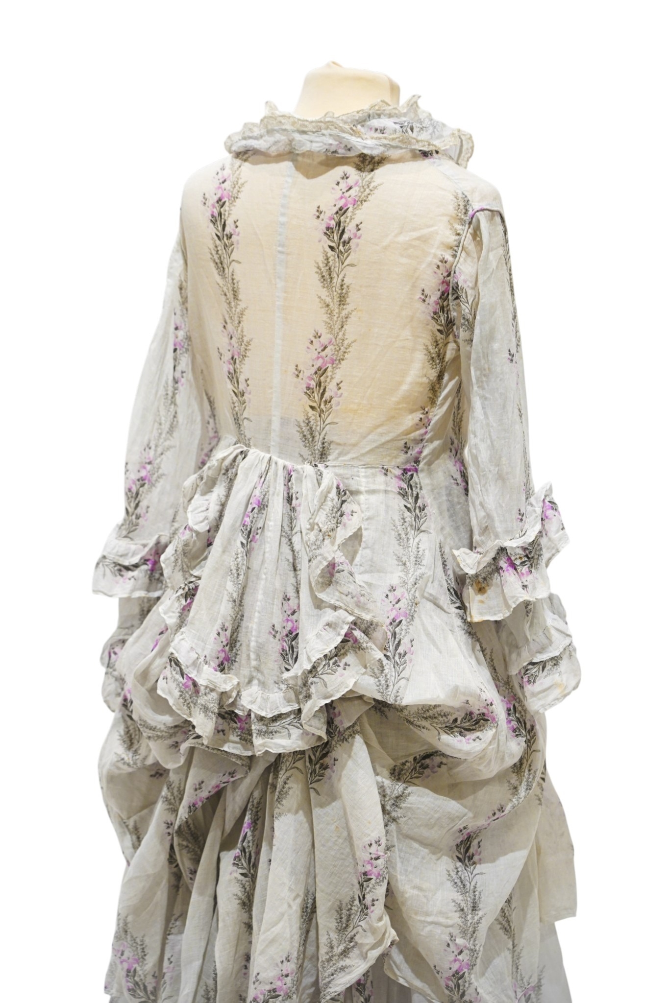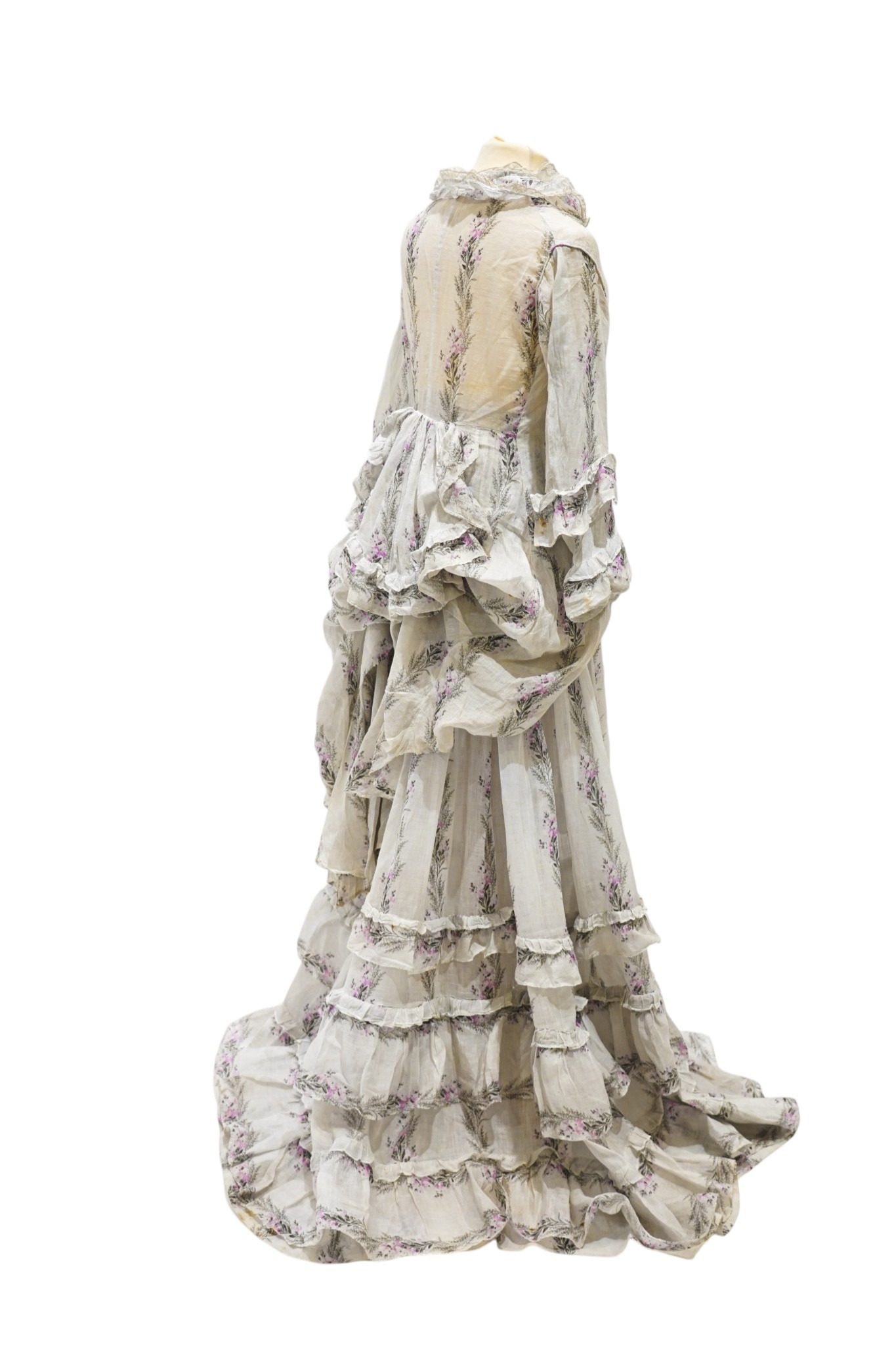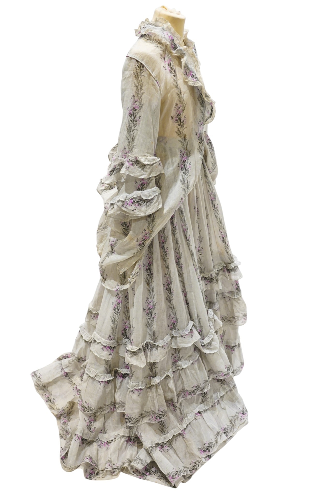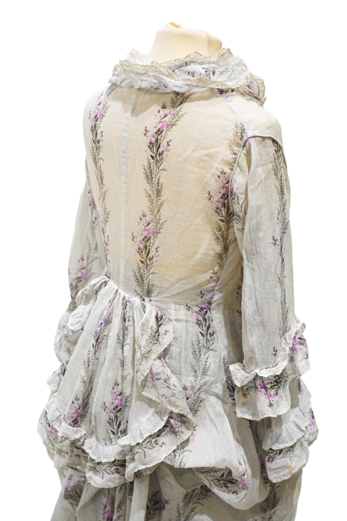 A Victorian 1860-1870 ladies deep flounced lawn summer skirt and matching bustle jacket, both printed in a floral stripe of wild flowers and grasses in pale lilac and greys, the jacket edged with a lace bordered collar, flounced lower sleeves and a fancy taped bustle to the back.