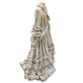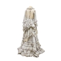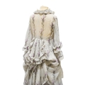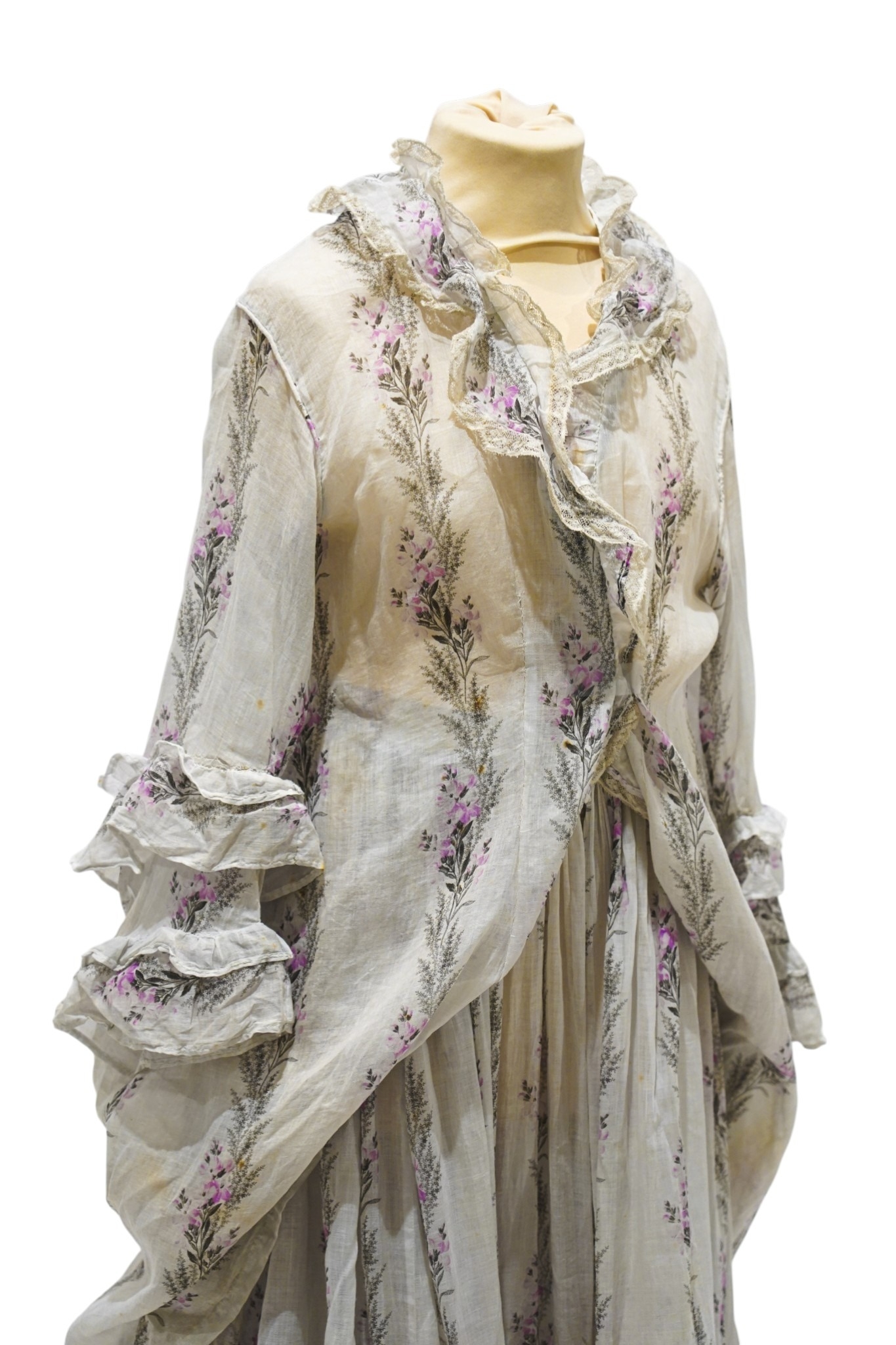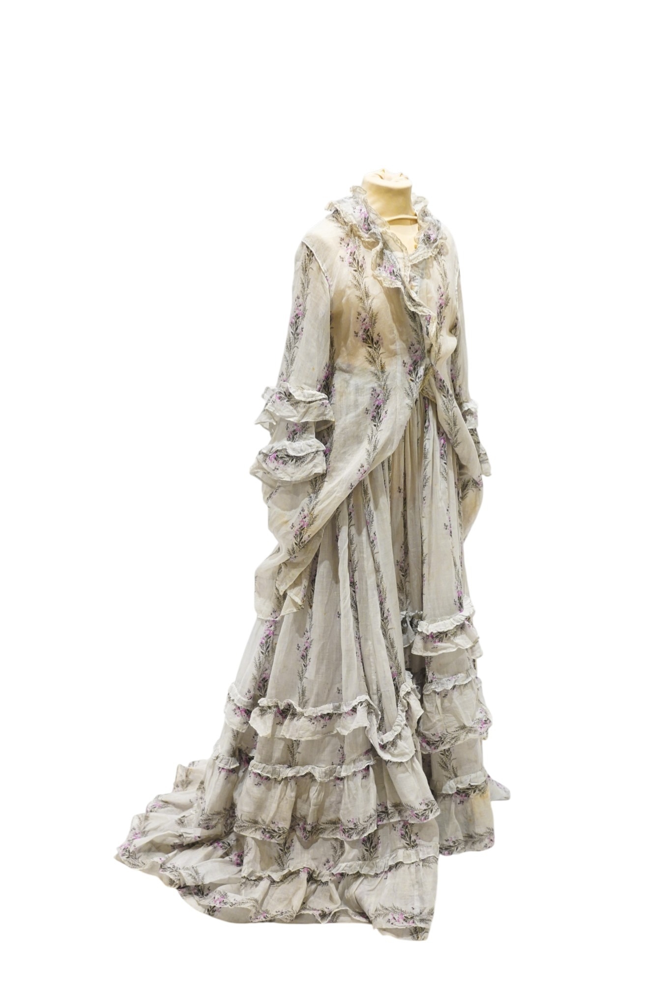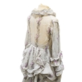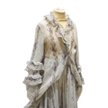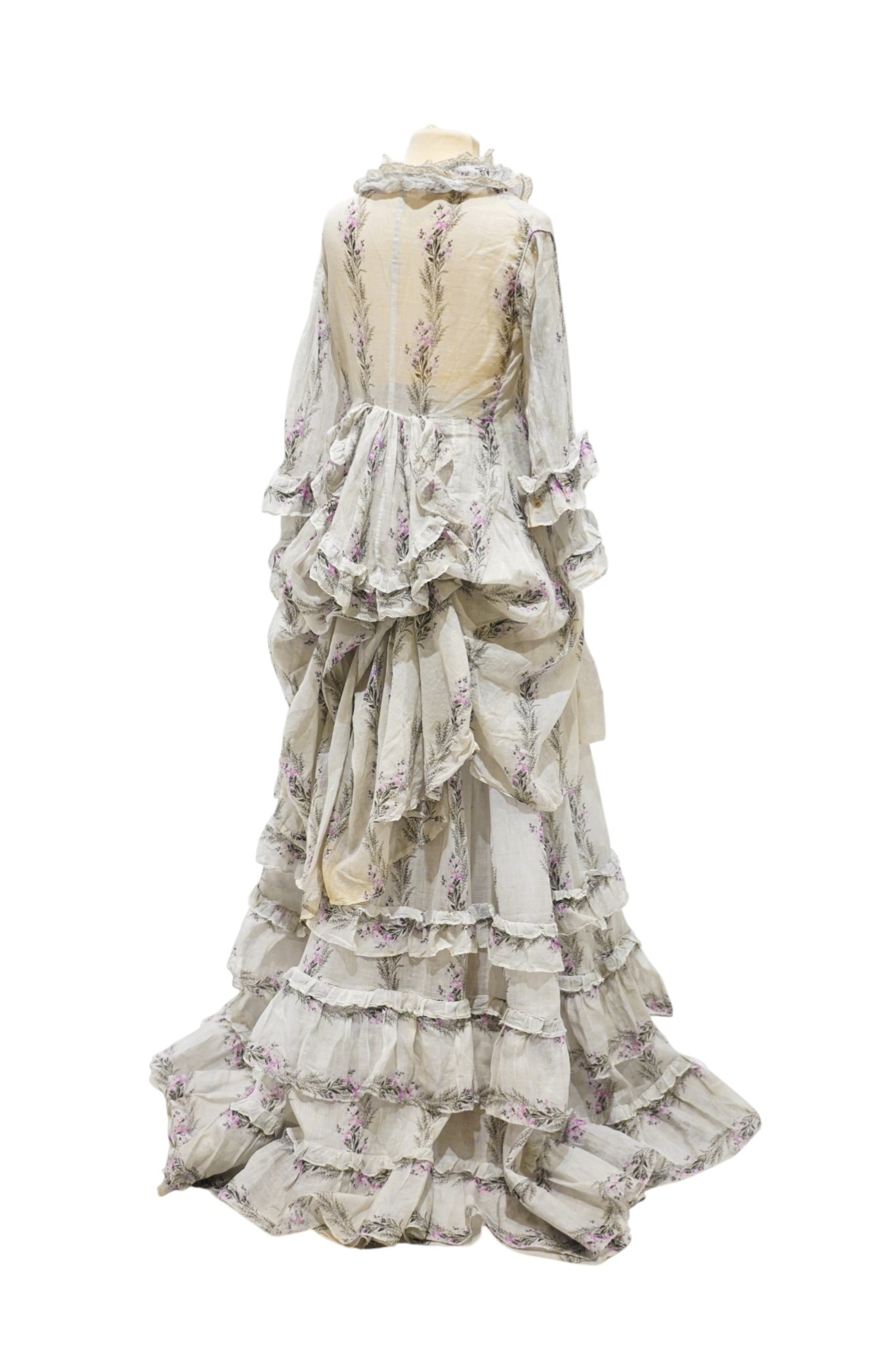 A Victorian 1860-1870 ladies deep flounced lawn summer skirt and matching bustle jacket, both printed in a floral stripe of wild flowers and grasses in pale lilac and greys, the jacket edged with a lace bordered collar, flounced lower sleeves and a fancy taped bustle to the back.