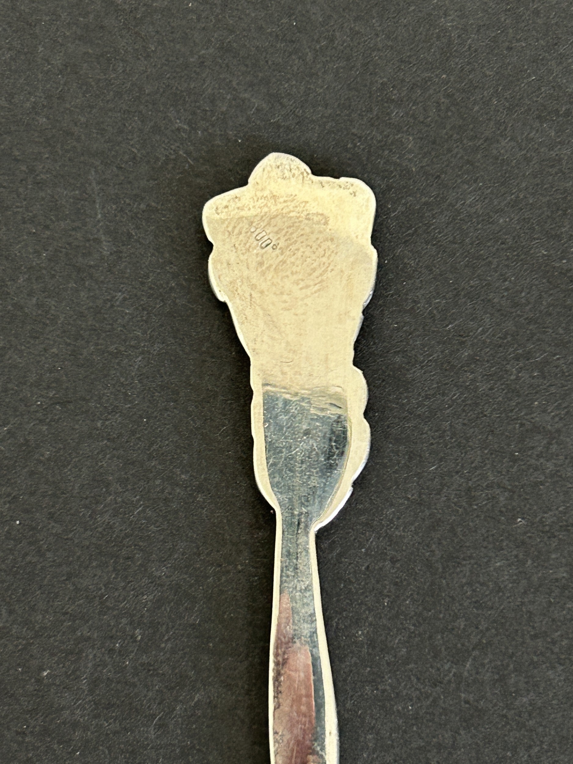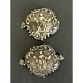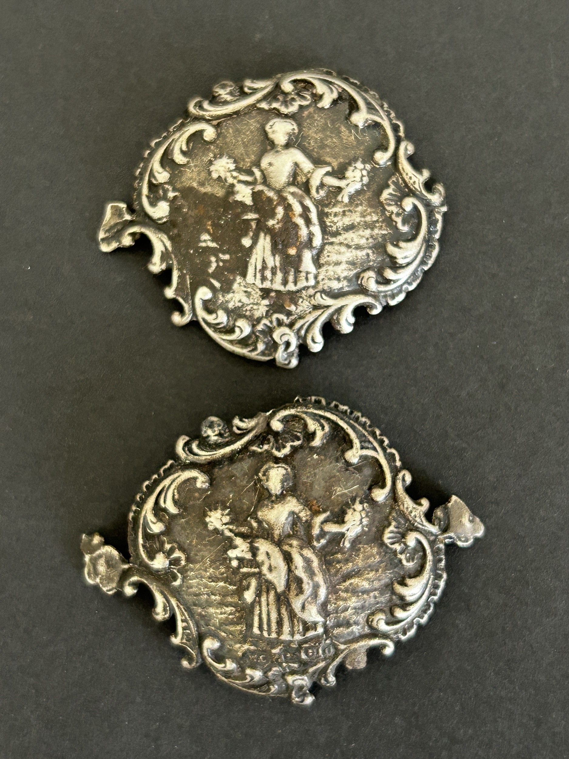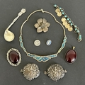 A pair of hallmarked silver small plaques together with an 800 grade spoon, two Bakelite brooches and other white metal items
