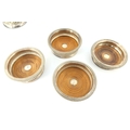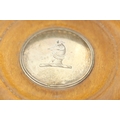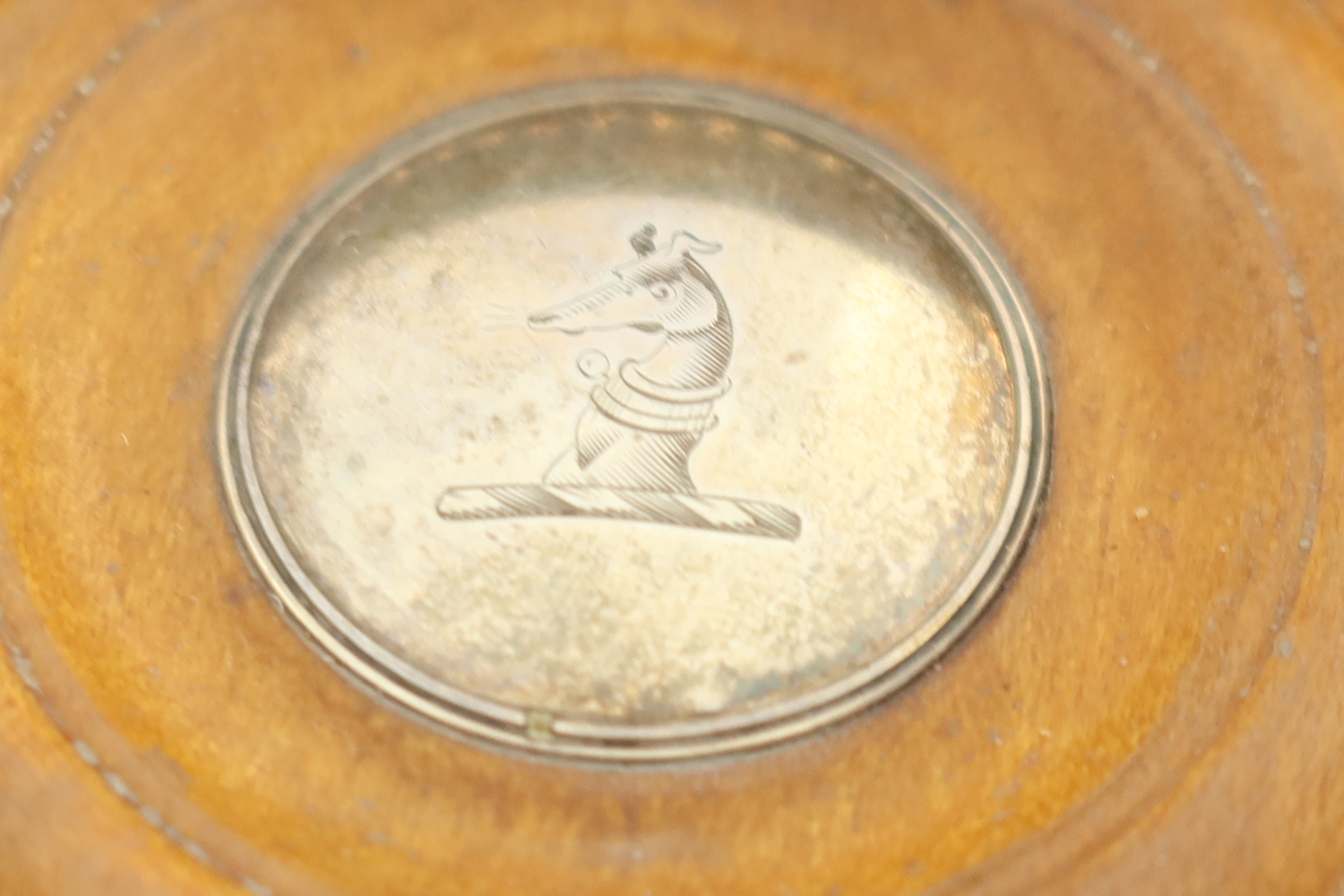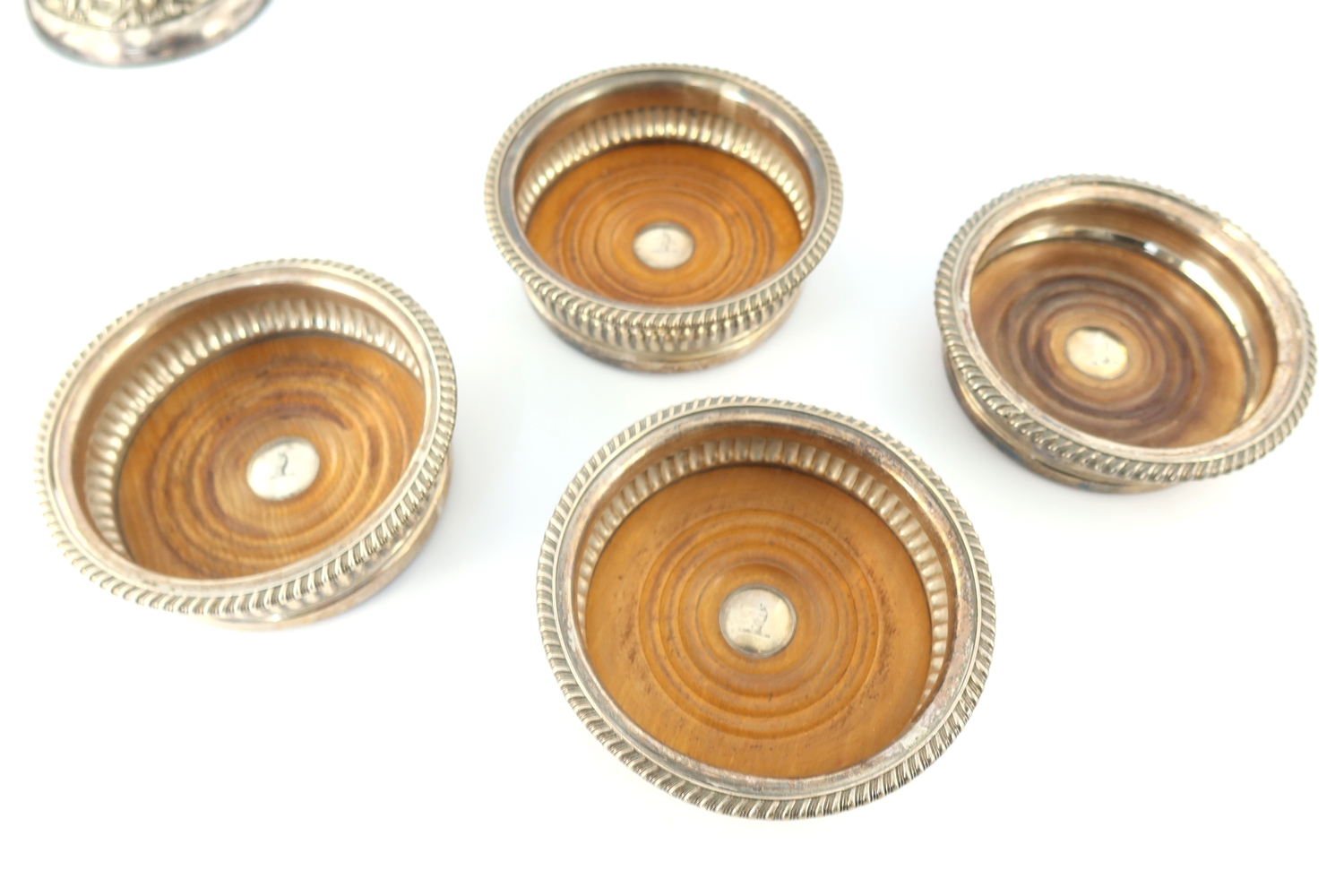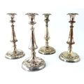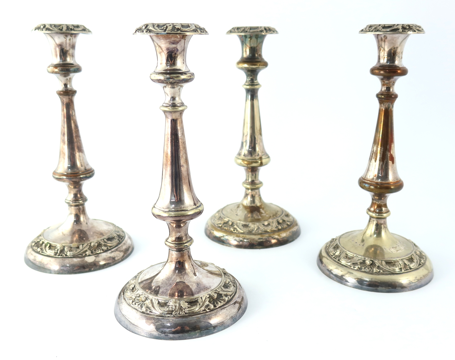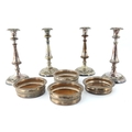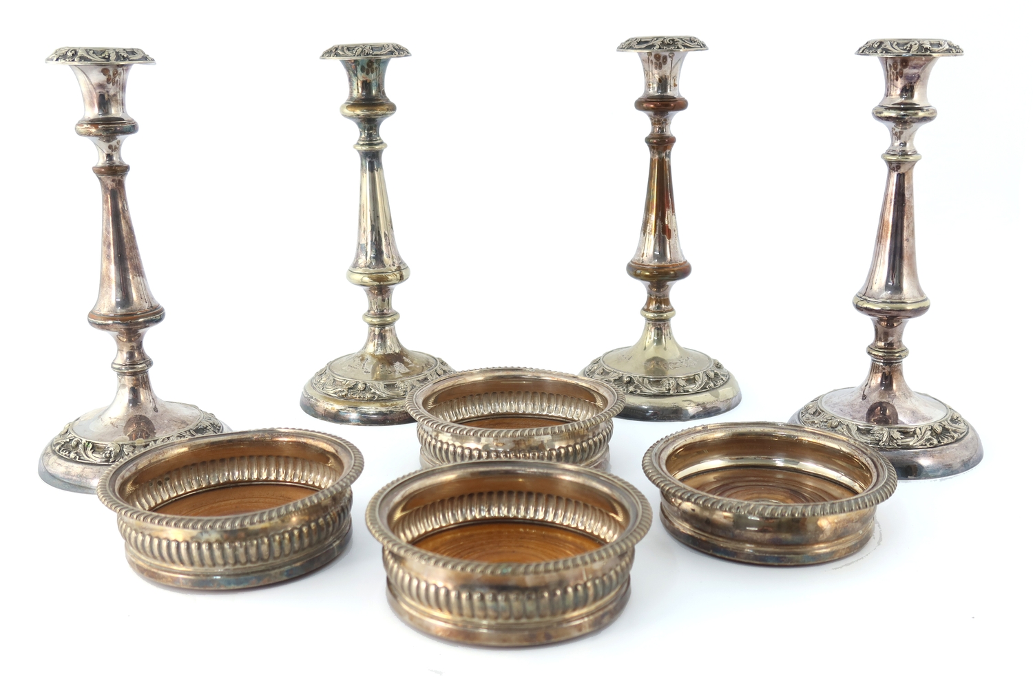 A set of three early 19th century old Sheffield plated wine coasters, unmarked, circa 1810-20, fluted circular form, gadroon borders, wooden bases set with a central button engraved with a crest, diameter 15cm, plus a single Old Sheffield plated wine coaster, of circular form, gadroon border, the wooden base set with a crested button, The crest is that of Halford, diameter 15cm, together with a set of four early Victorian plated candlesticks with weighted circular bases, tapered knopped columns, maker George Richmond & Co (8)