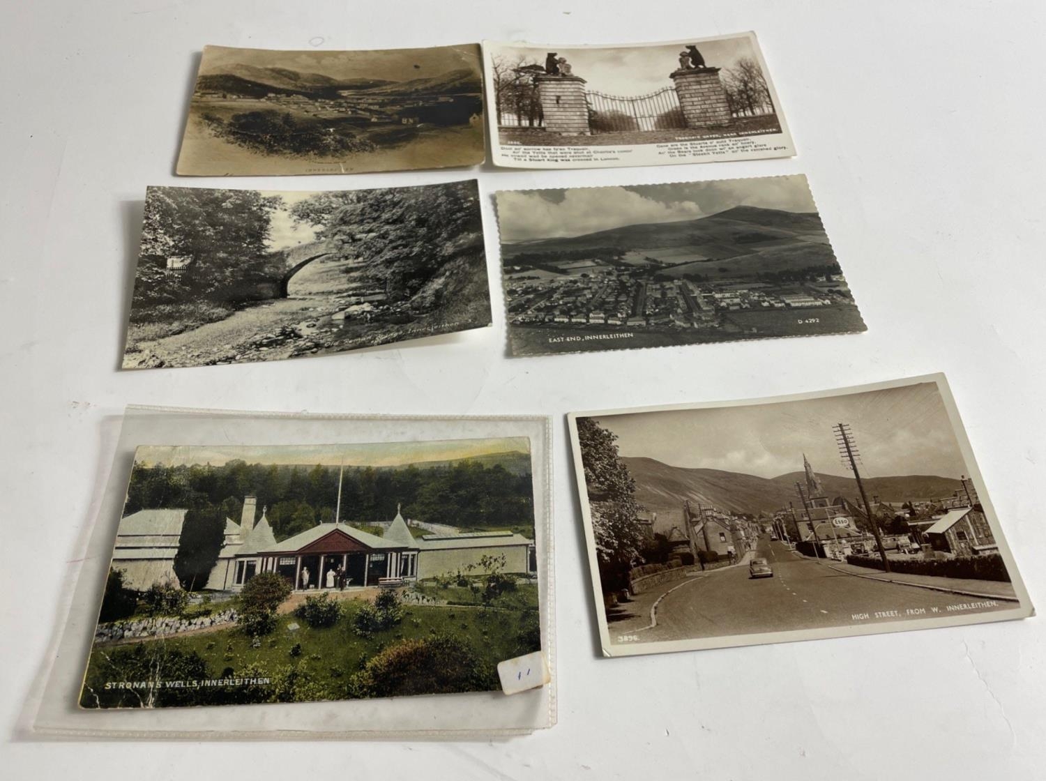INNERLEITHEN LOCAL INTEREST VINTAGE POSTCARDS to include Innerleithen High Street West, Old Roman Bridge, East End Innerleithen, St Ronans Wells in colour, Traquair Gates and a View of Innerleithen