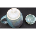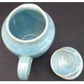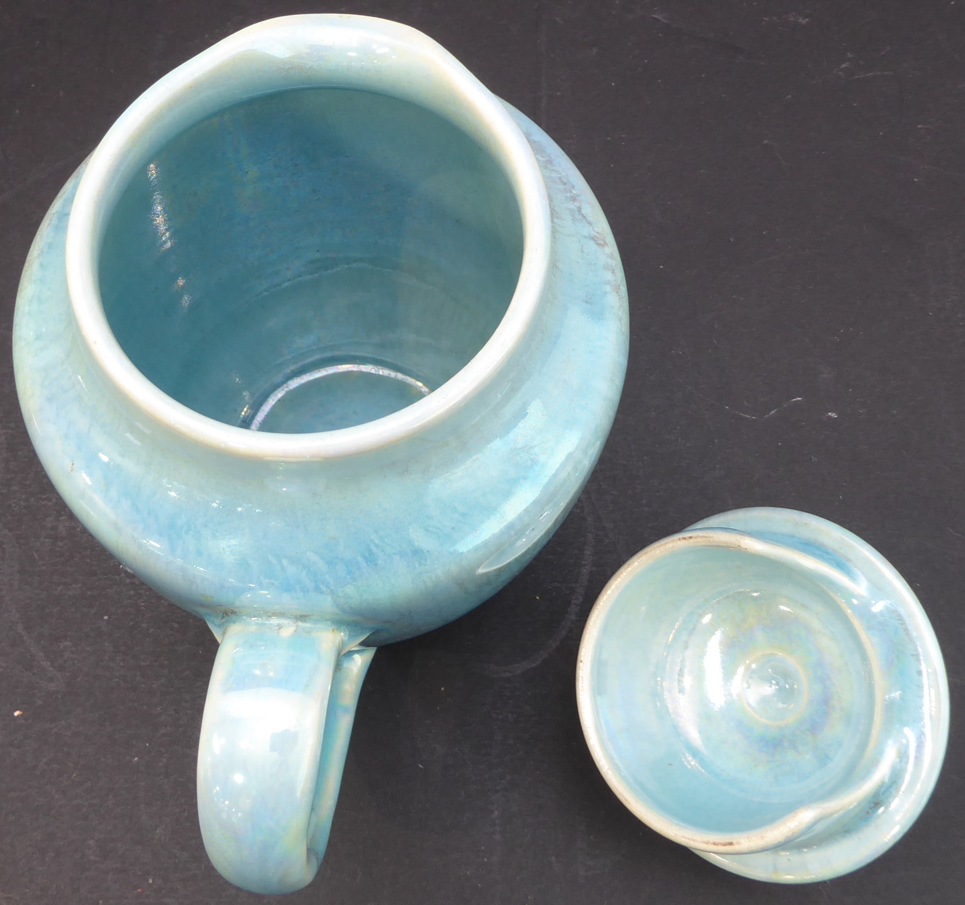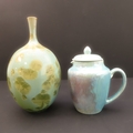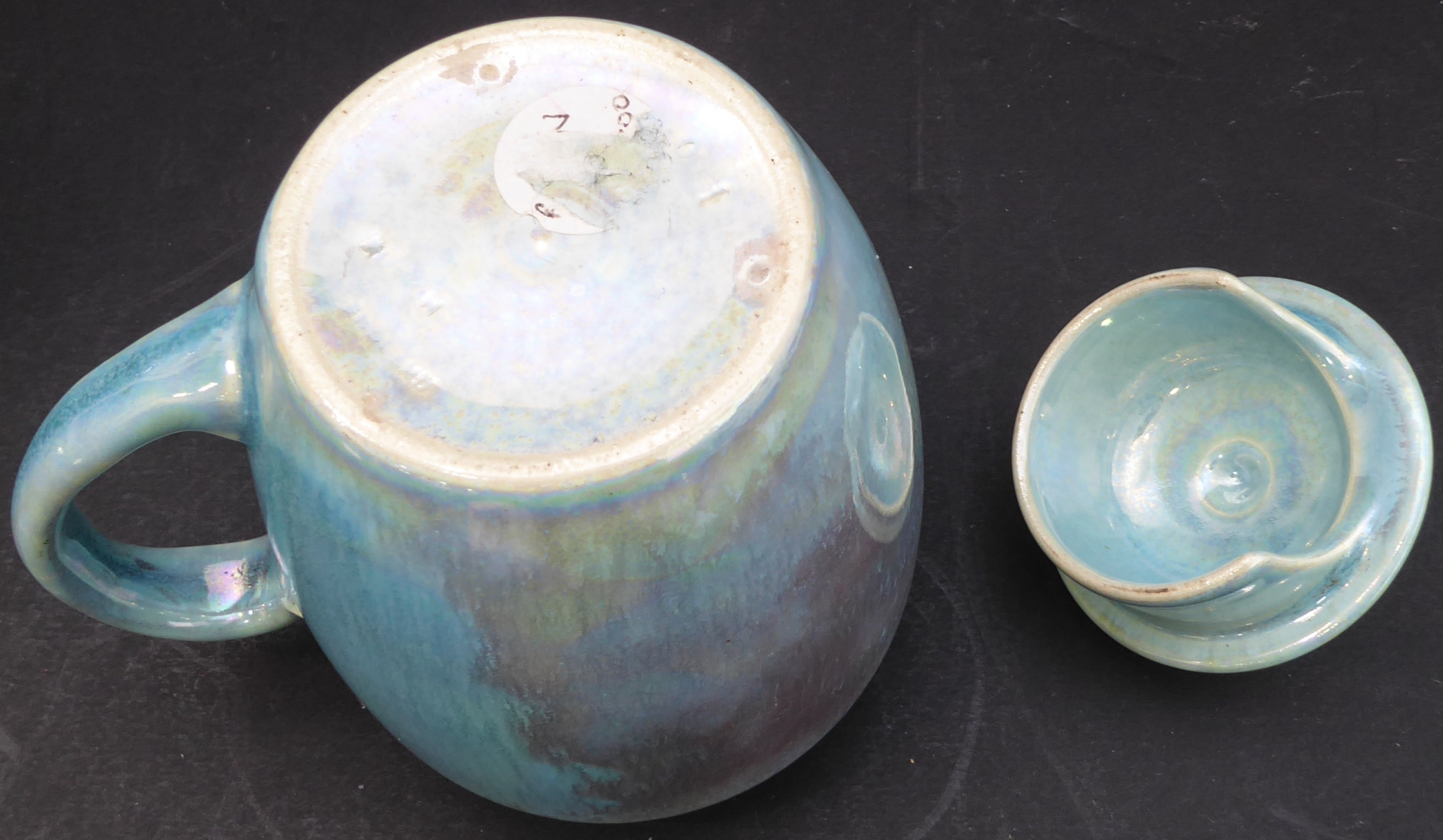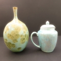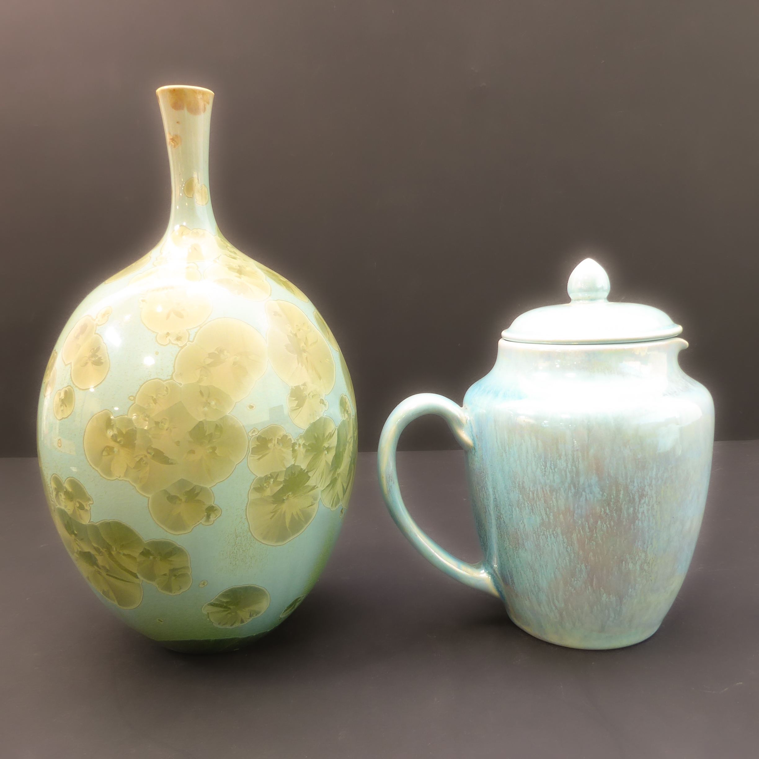 A Ruskin Pottery jug-and-cover with lustreware-style glaze. Together with an unusual studioware style vase (20cm), thin waisted neck, ovoid body decorated with stylised lustreware lily leaves, impressed potter's mark to underside. (2)