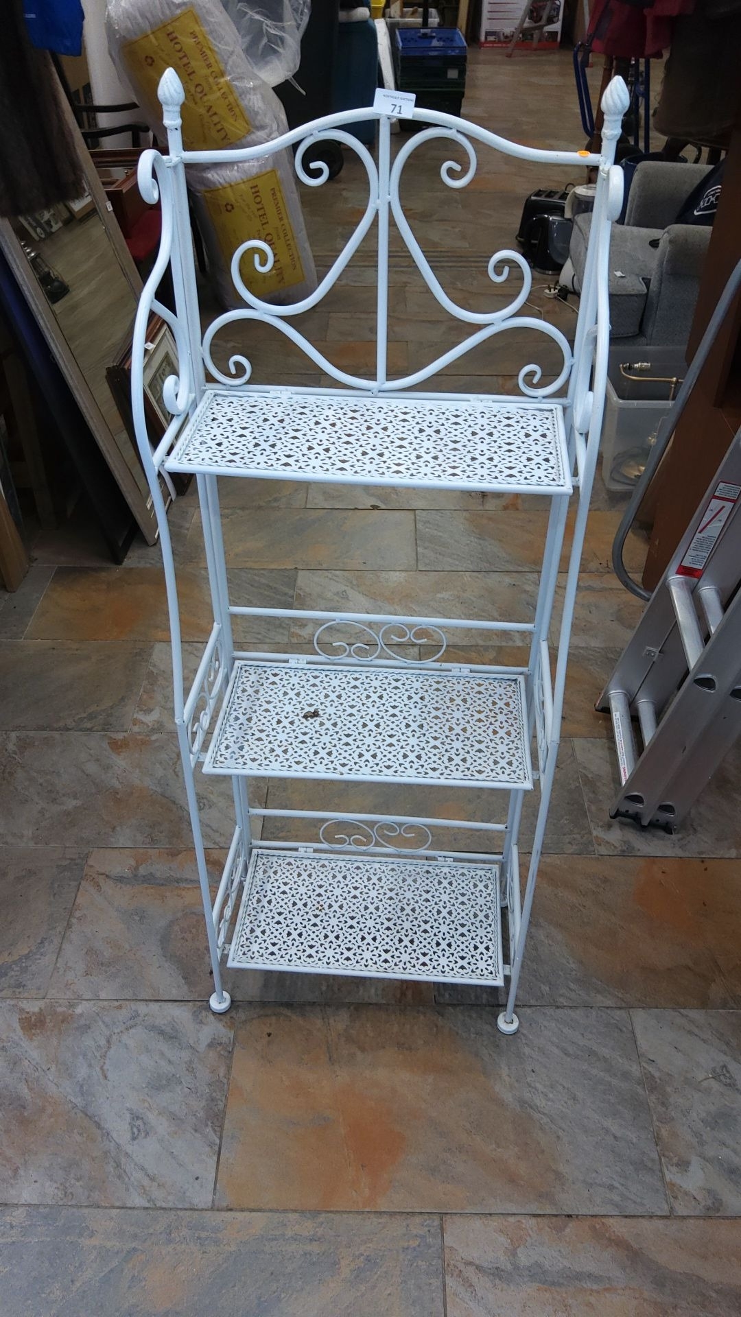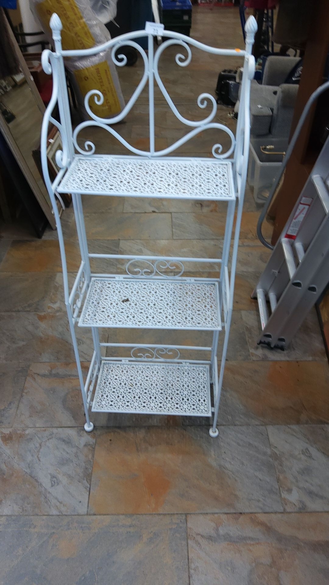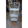 White-painted wrought-iron three-tier étagère or plant stand, pierced lattice shelves beneath scrolled cresting, late 20th century.