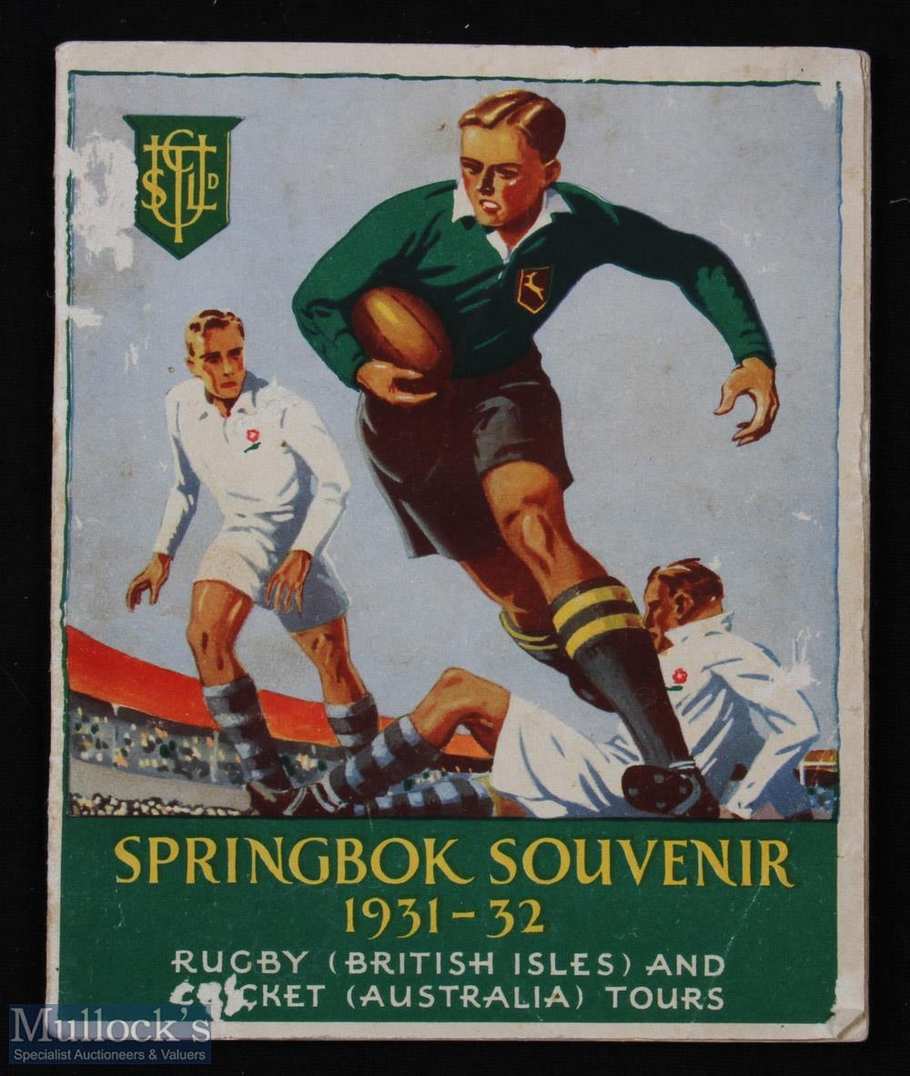Rare 1931-2 Springbok Rugby Souvenir Booklet: Lovely coloured-cover compact 32 pp publication with pics of the S African Rugby & Cricket squads for their overseas tours. VG with just a few v small rubs
