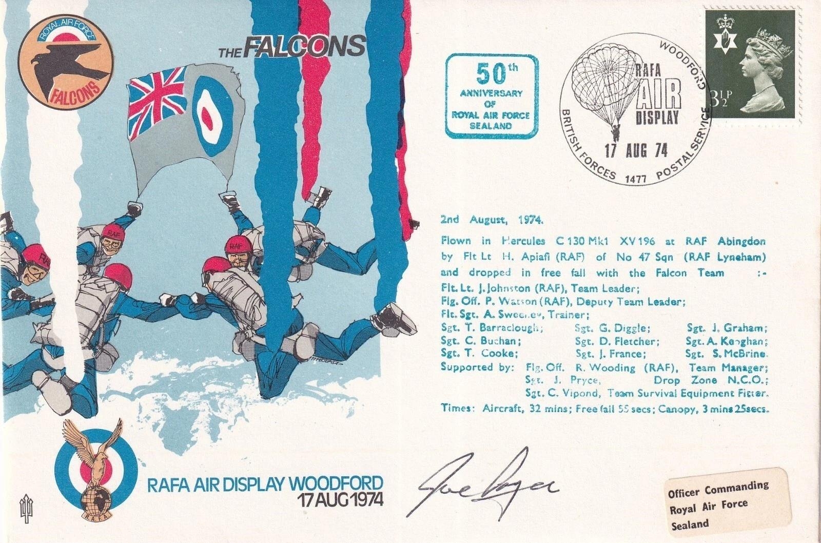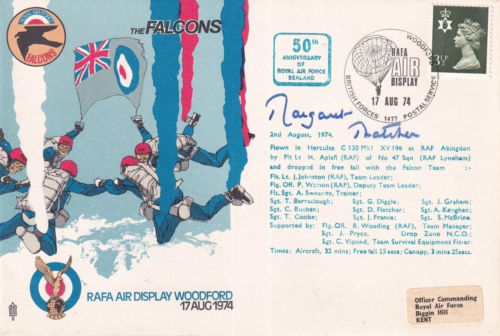 AD4 The Falcons Signed by Margaret Thacher and Falcons Parachutists Flown and Carried. Two Covers 17 Aug 74 BFPS 1477 Falcons Parachutists. Blue Flown Cachet Flown in Hercules at RAF Abingdon and dropped in free fall with the Falcon Team. Personally Signed by The Rt Hon The Baroness Thatcher Prime Minister of the United Kingdom 1979 - 90 and the other Cover Signed by Sat J Pryce. Drop Zone N C O. Falcons display Parachute team. Rare Very Few Issued. Good condition. All autographs come with a Certificate of Authenticity. We combine postage on multiple winning lots and can ship worldwide. UK postage from £5.99, EU from £7.99, Rest of World from £9.99