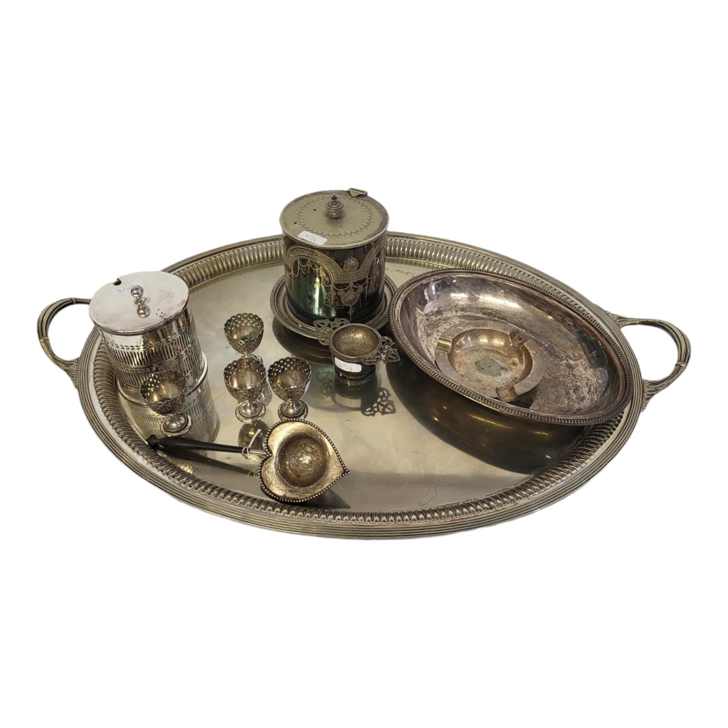 Having an ebonised turned wooden handle and beaded design to heart form bowl, together with a collection of Victorian and later silver plated ware, including an oval twin handled tray with fluted decoration, a biscuit barrel with engraved decoration, a tea strainer and bowl, four egg cups and an entrèe lid.