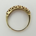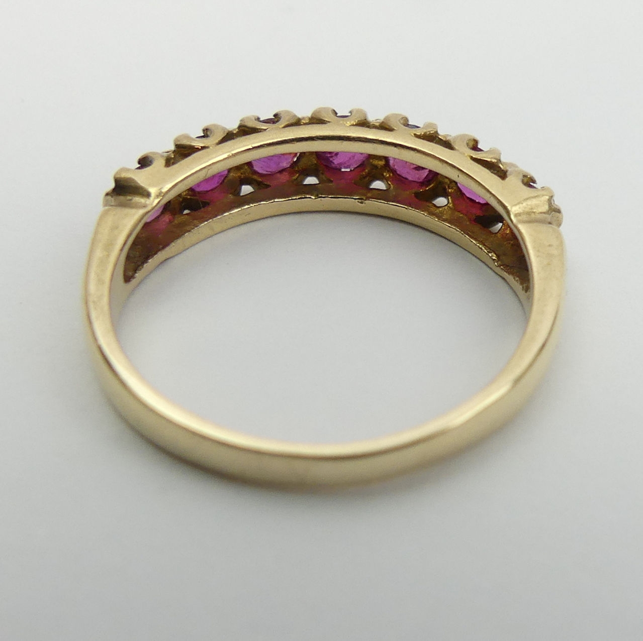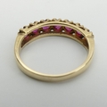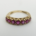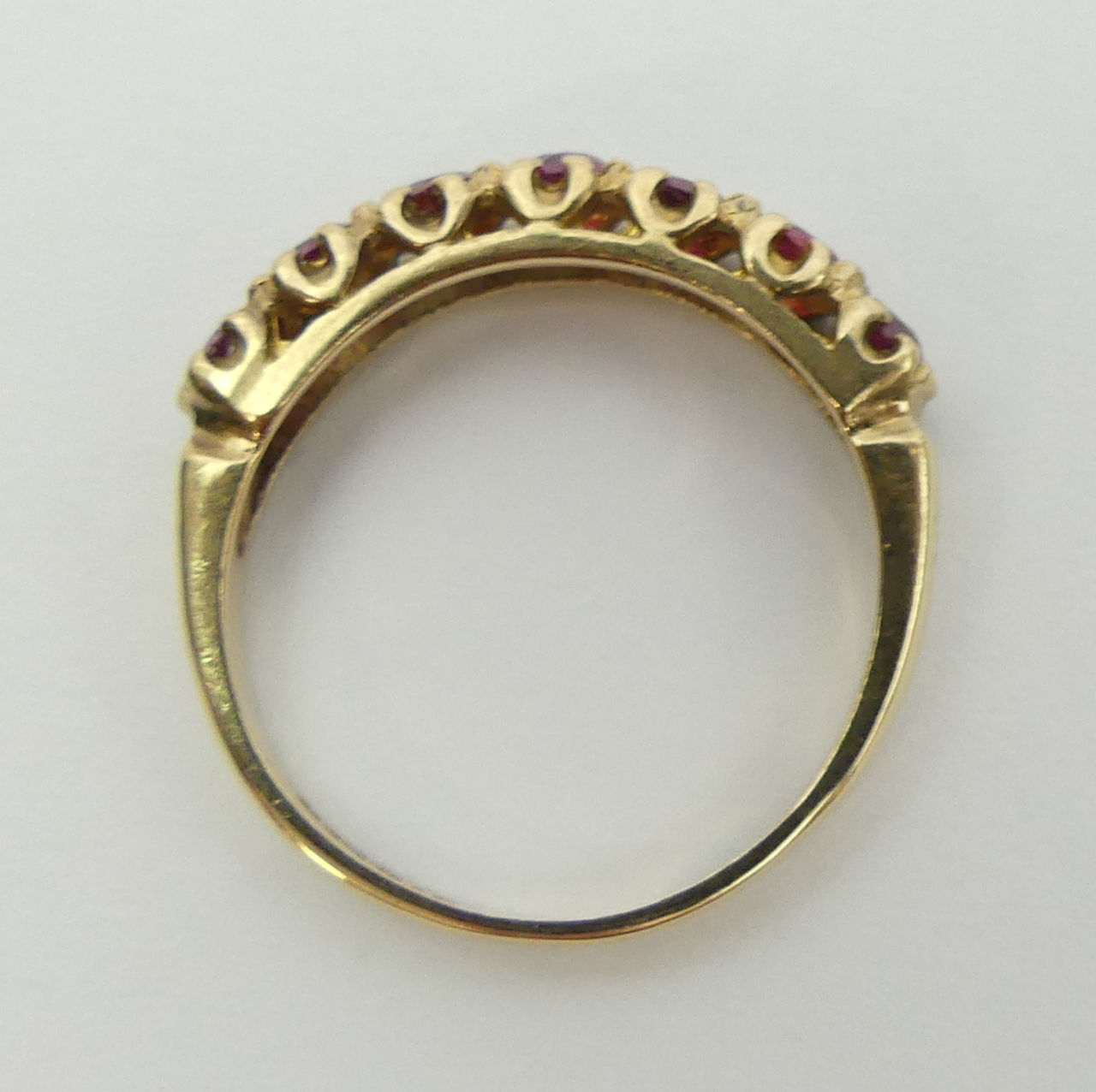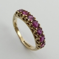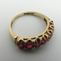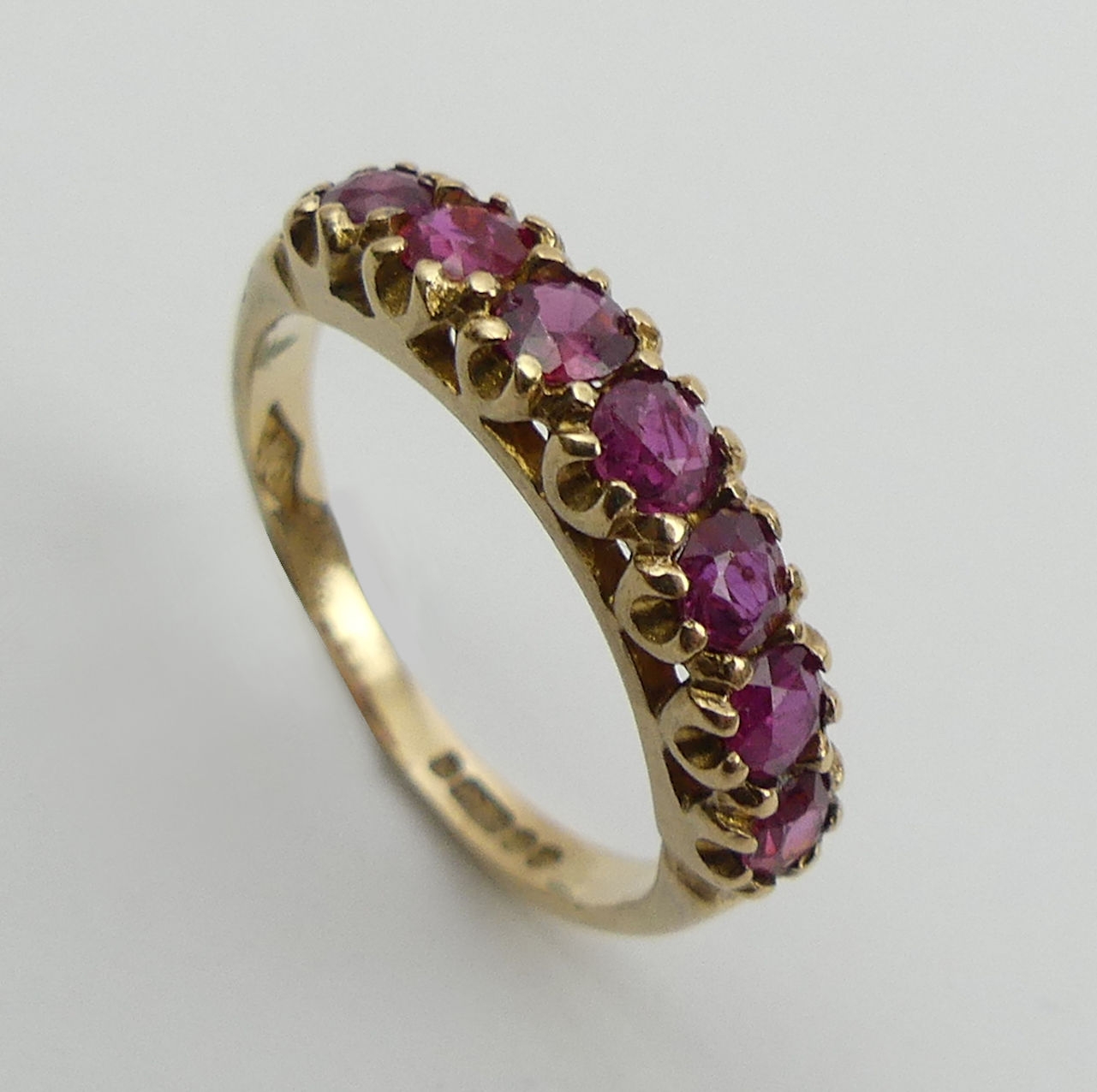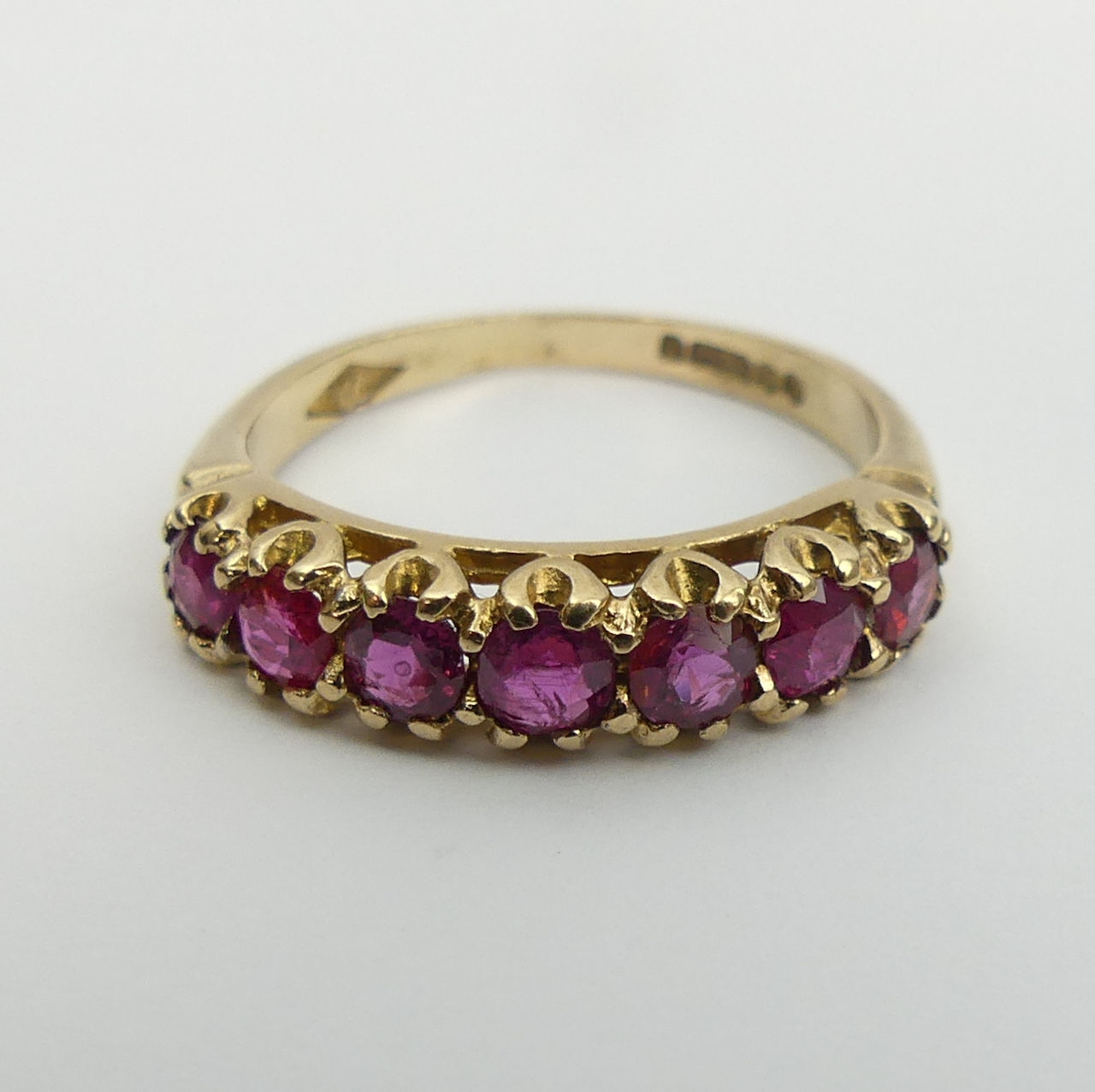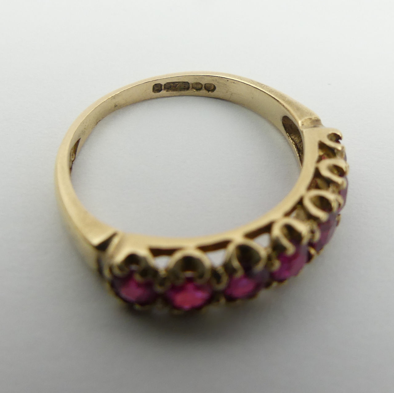 9ct gold seven stone ruby ring, 2 grams, size L 4.5mm wide. UK Postage £12.