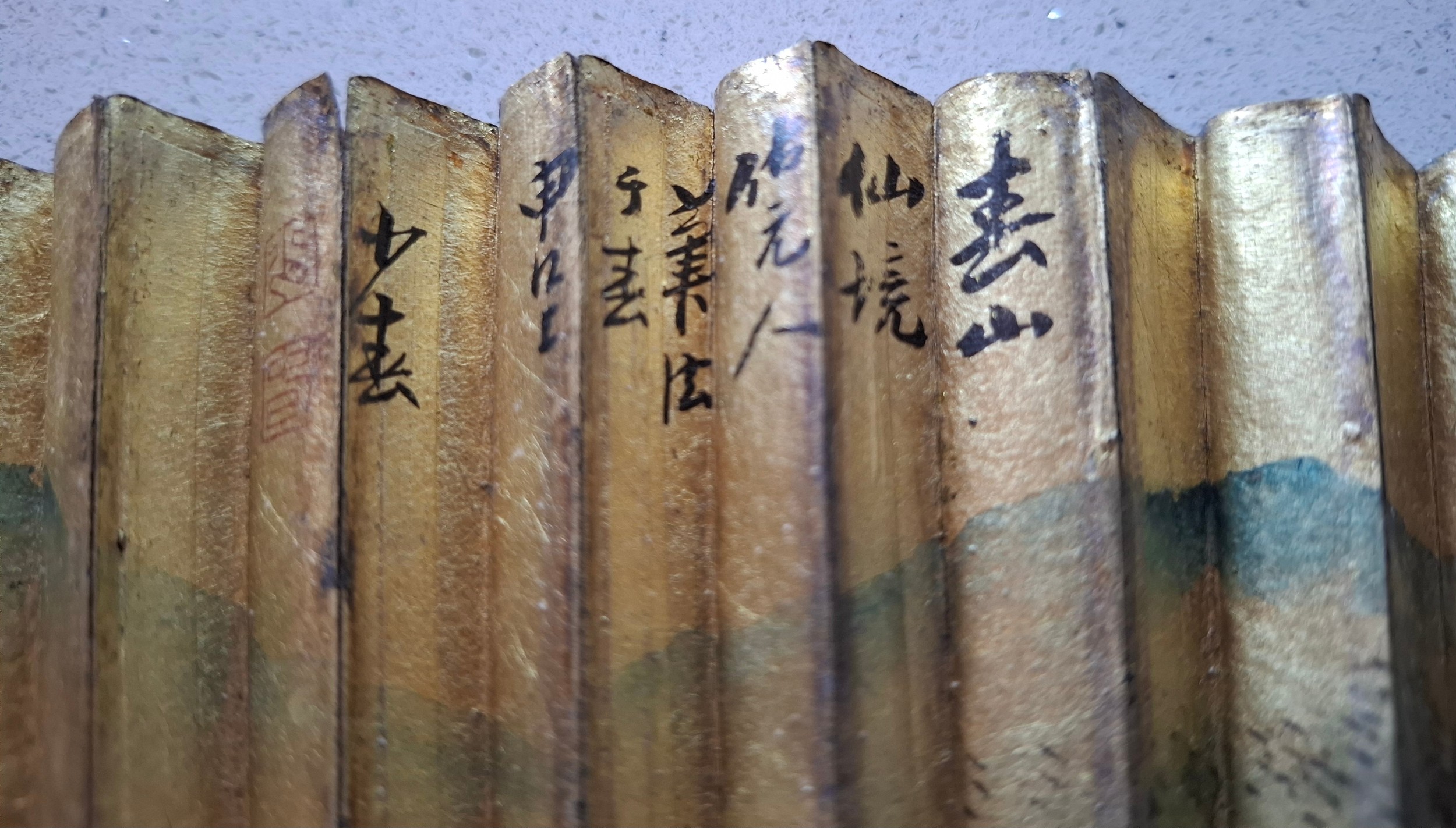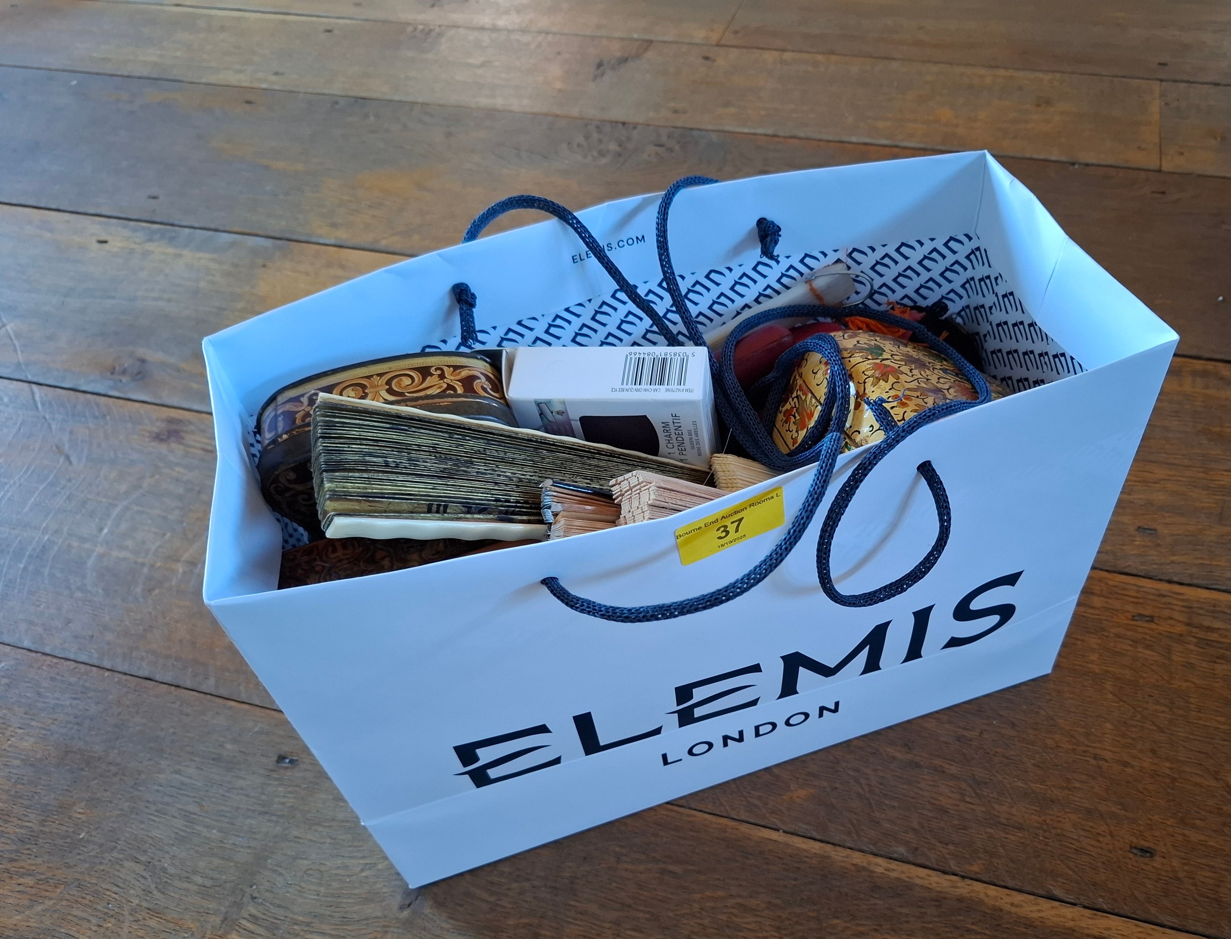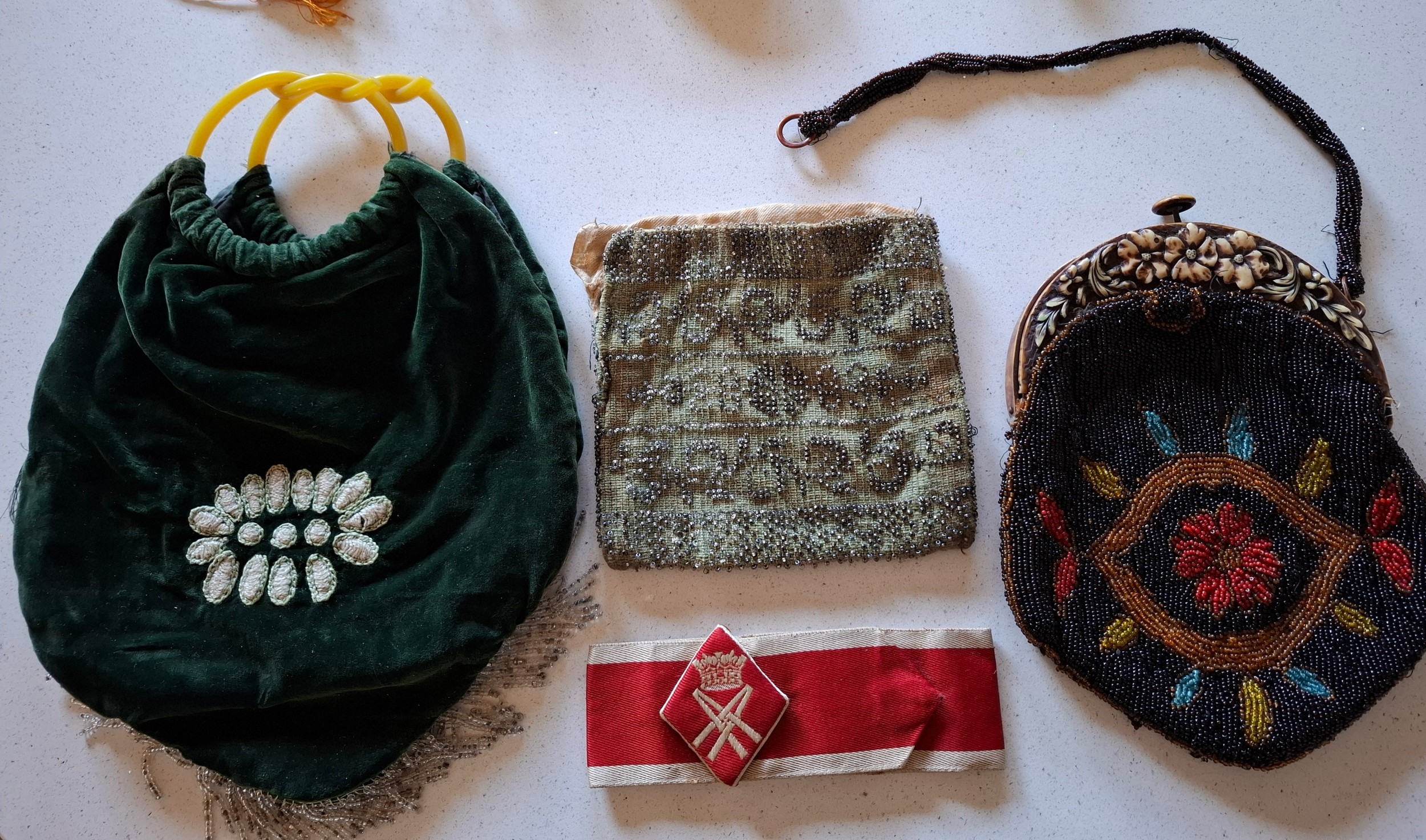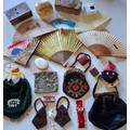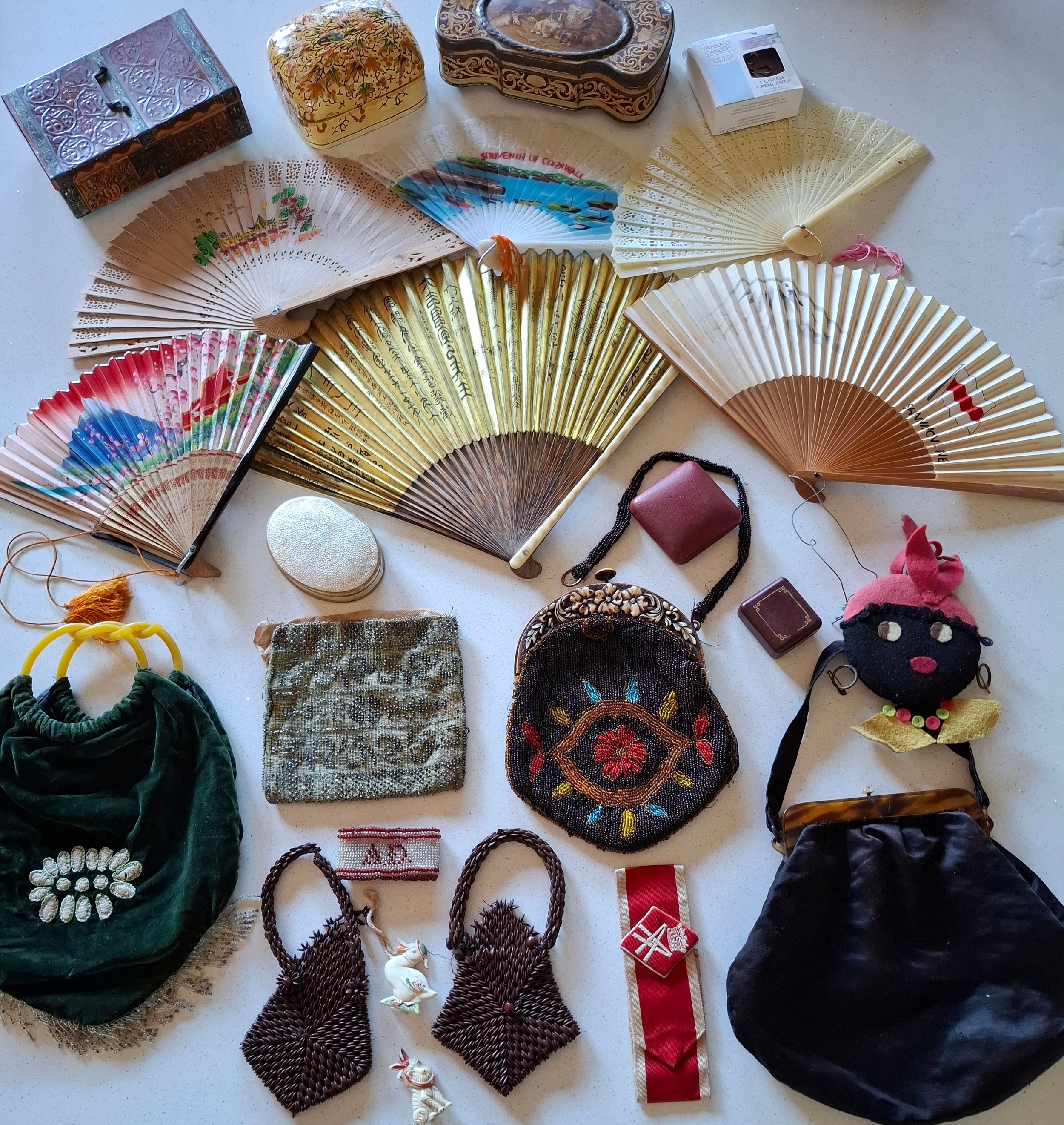 A decorative lot comprising a 1920'S-1950'S Queen Alexandra's Royal Army Nursing Corps armlet badge (QARANC), 6 fans, 2 Cadbury/Bournville Three British Queens chocolate tins, an Indian lacquered box, 6 early 20th Century and later evening bags A/F and other items. Location: BWR