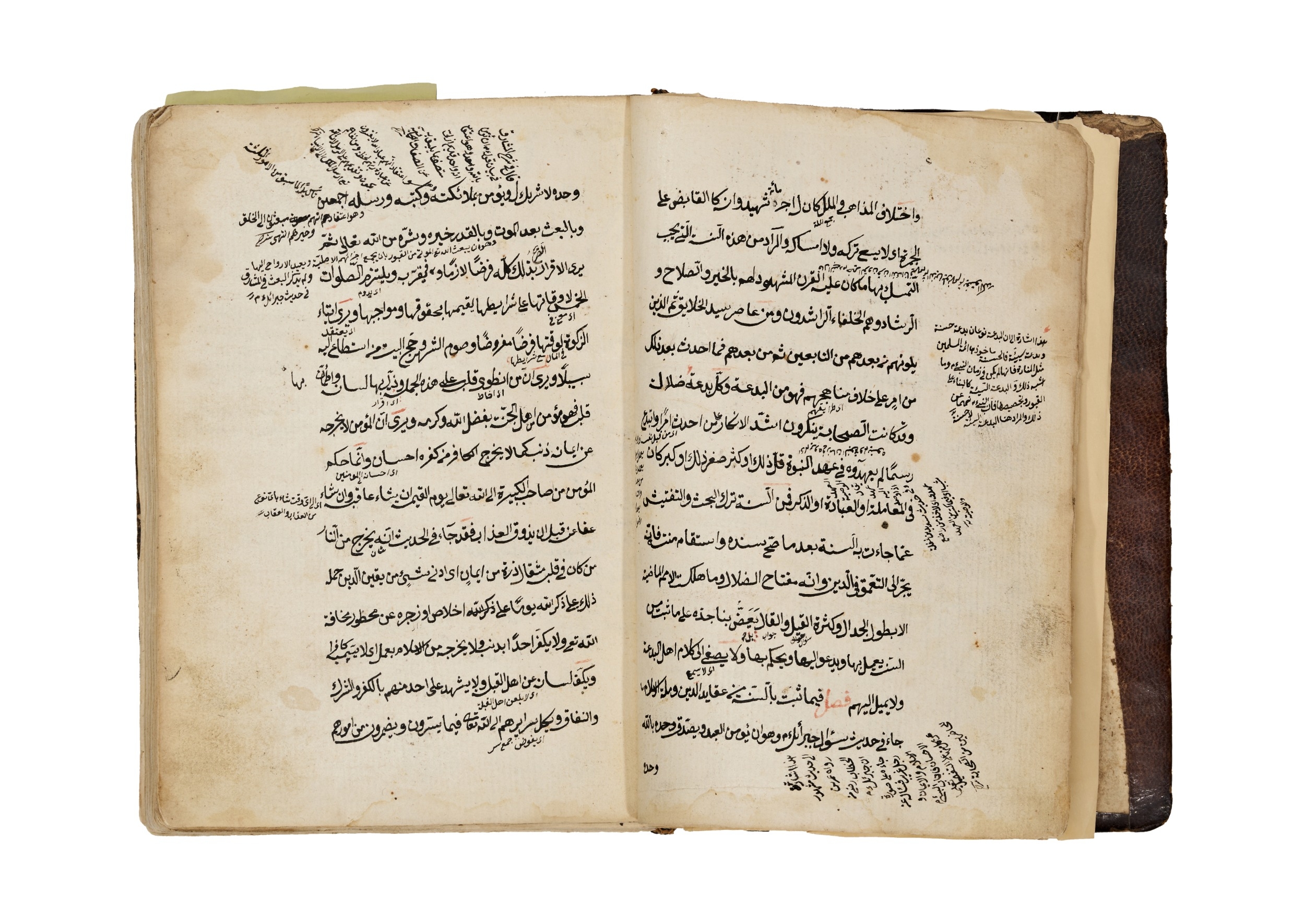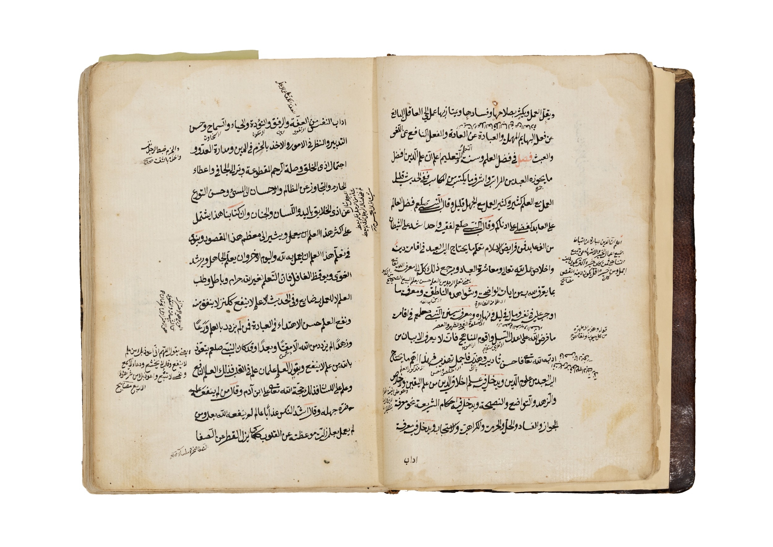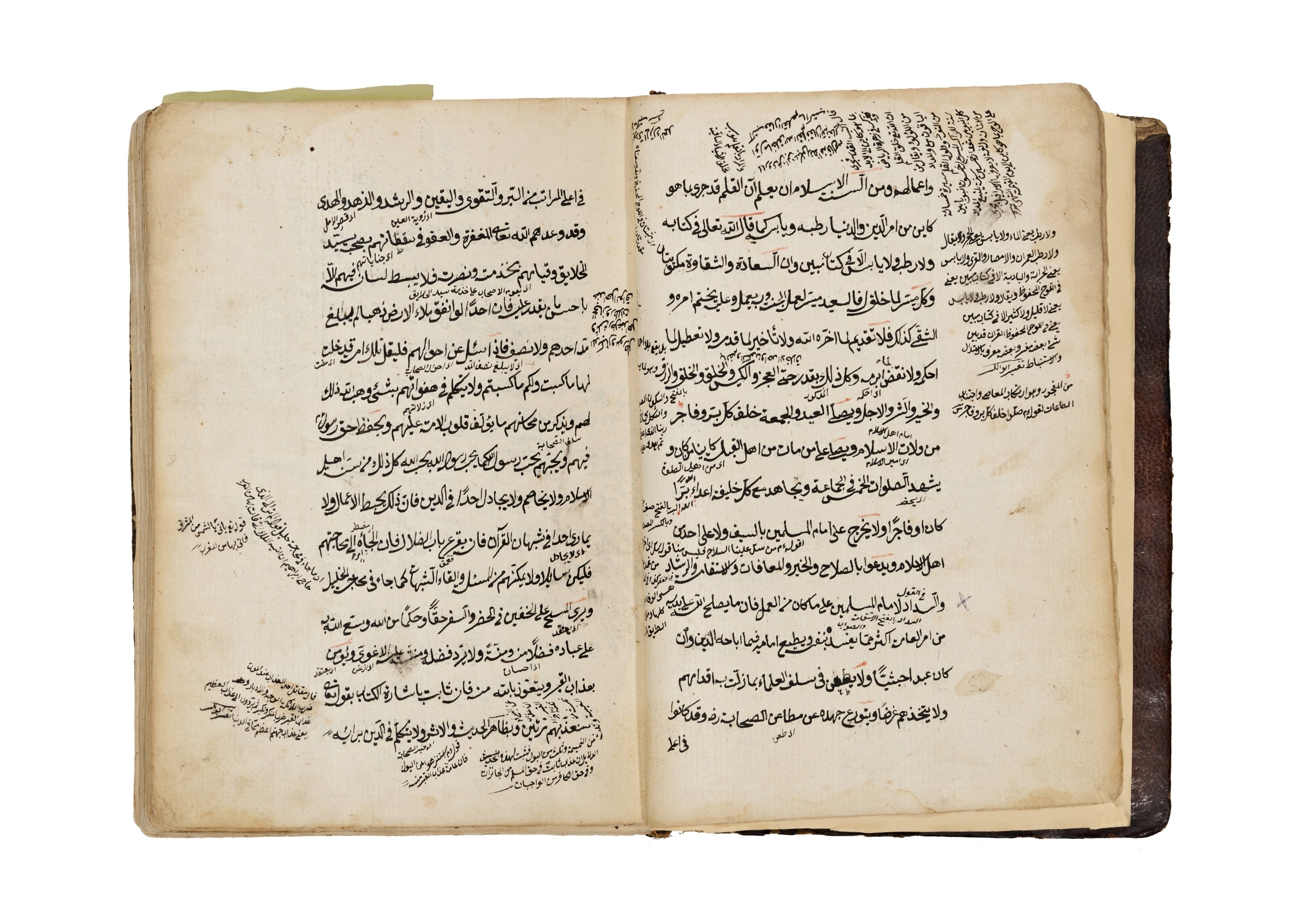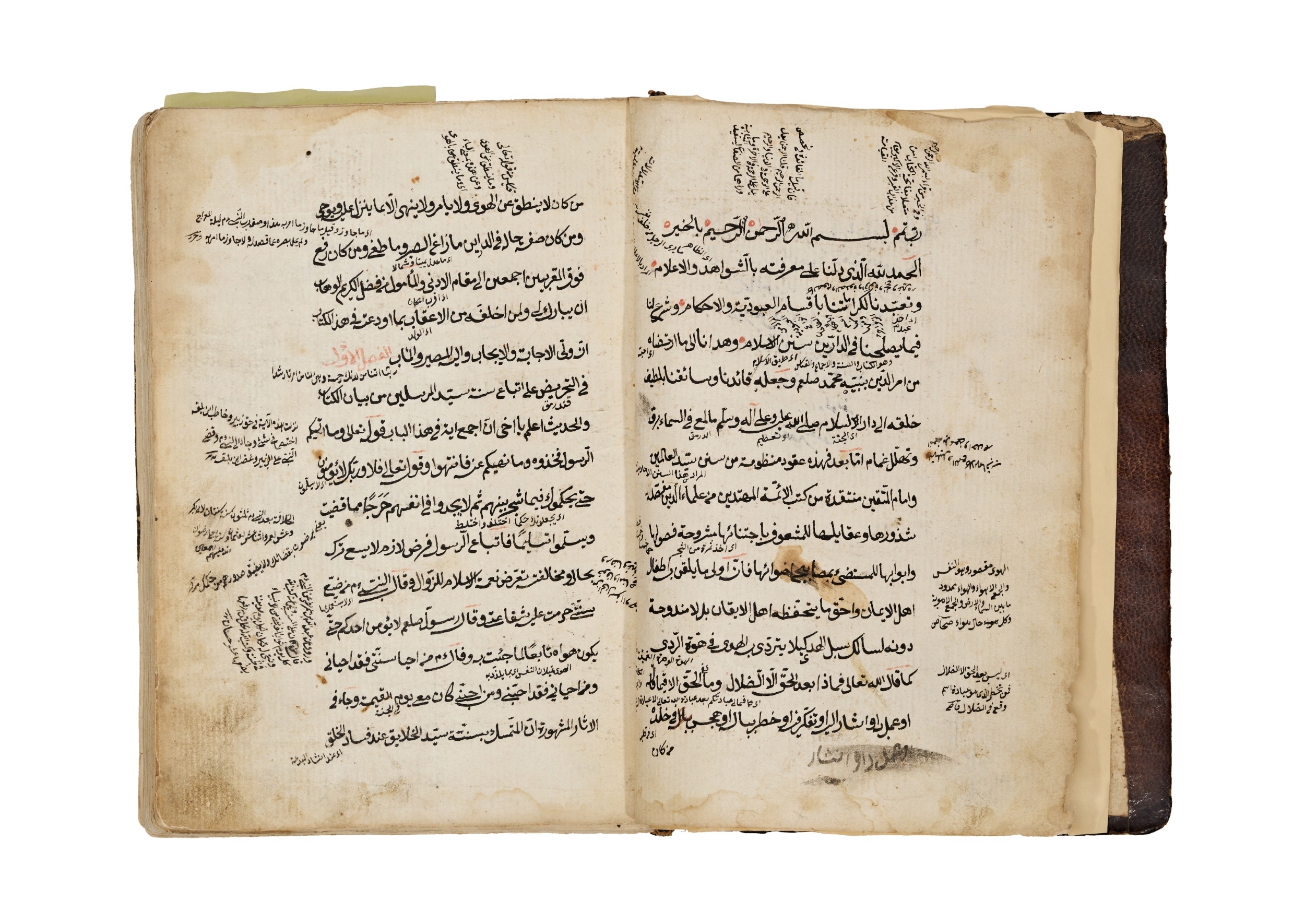 This late 18th-century Arabic manuscript comprises two primary works: Mukhtasar Sharai al-Islam (Abridged Laws of Islam), a treatise on Islamic jurisprudence, and Risalat Tibb al-Abdan (Treatise on the Medicine of the Bodies), a work of prophetic medicine. The introductory page and colophon identify the author and scribe as Ya'qub bin Qasim bin Isma'il bin al-Amir Sa'd al-Tahi al-Amini. The text is written in a clear Naskh script in black ink with rubricated headings and key phrases in red. The manuscript contains extensive marginalia, annotations, and glosses in various smaller hands throughout the text. The colophon on the final page dates the completion of the transcription to Tuesday in the month of Dhu al-Qidah, 1087 AH corresponding to approximately 1676ââ¬â1677 A.D. The volume is bound in a contemporary full dark brown leather binding with blind-tooled geometric designs, including diagonal lines forming a large X on the front cover.