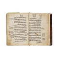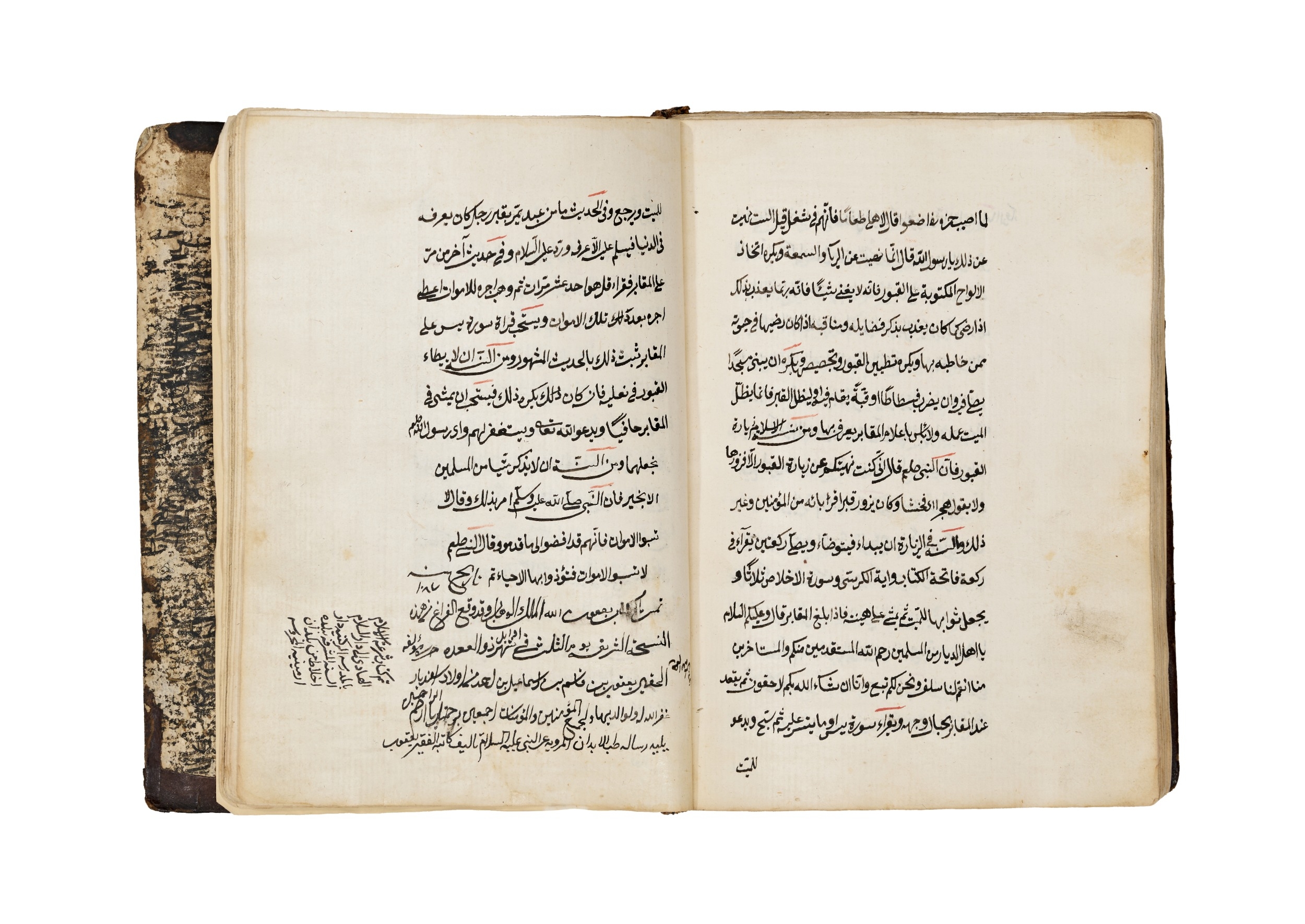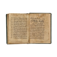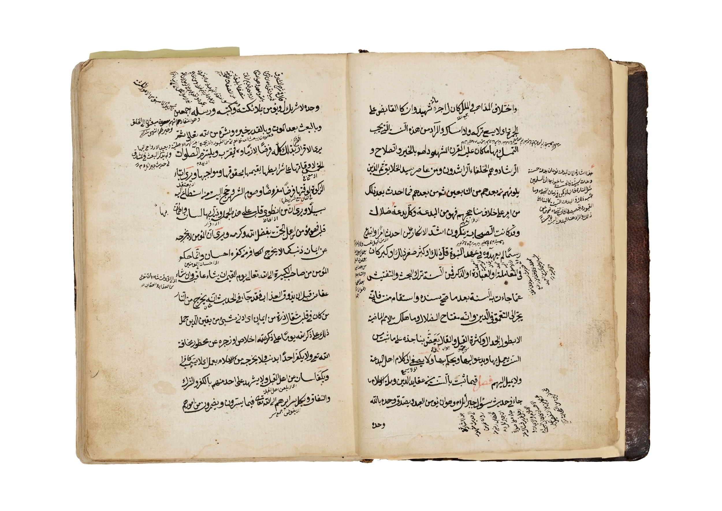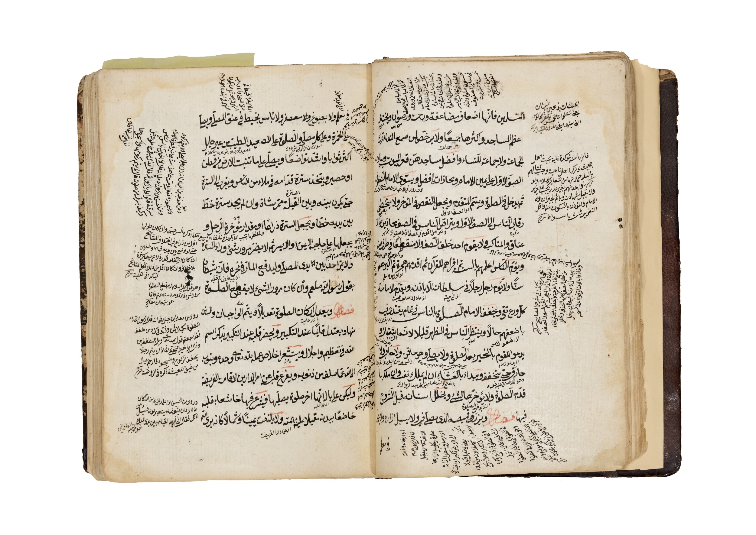 This late 18th-century Arabic manuscript comprises two primary works: Mukhtasar Sharai al-Islam (Abridged Laws of Islam), a treatise on Islamic jurisprudence, and Risalat Tibb al-Abdan (Treatise on the Medicine of the Bodies), a work of prophetic medicine. The introductory page and colophon identify the author and scribe as Ya'qub bin Qasim bin Isma'il bin al-Amir Sa'd al-Tahi al-Amini. The text is written in a clear Naskh script in black ink with rubricated headings and key phrases in red. The manuscript contains extensive marginalia, annotations, and glosses in various smaller hands throughout the text. The colophon on the final page dates the completion of the transcription to Tuesday in the month of Dhu al-Qidah, 1087 AH corresponding to approximately 1676ââ¬â1677 A.D. The volume is bound in a contemporary full dark brown leather binding with blind-tooled geometric designs, including diagonal lines forming a large X on the front cover.