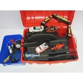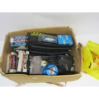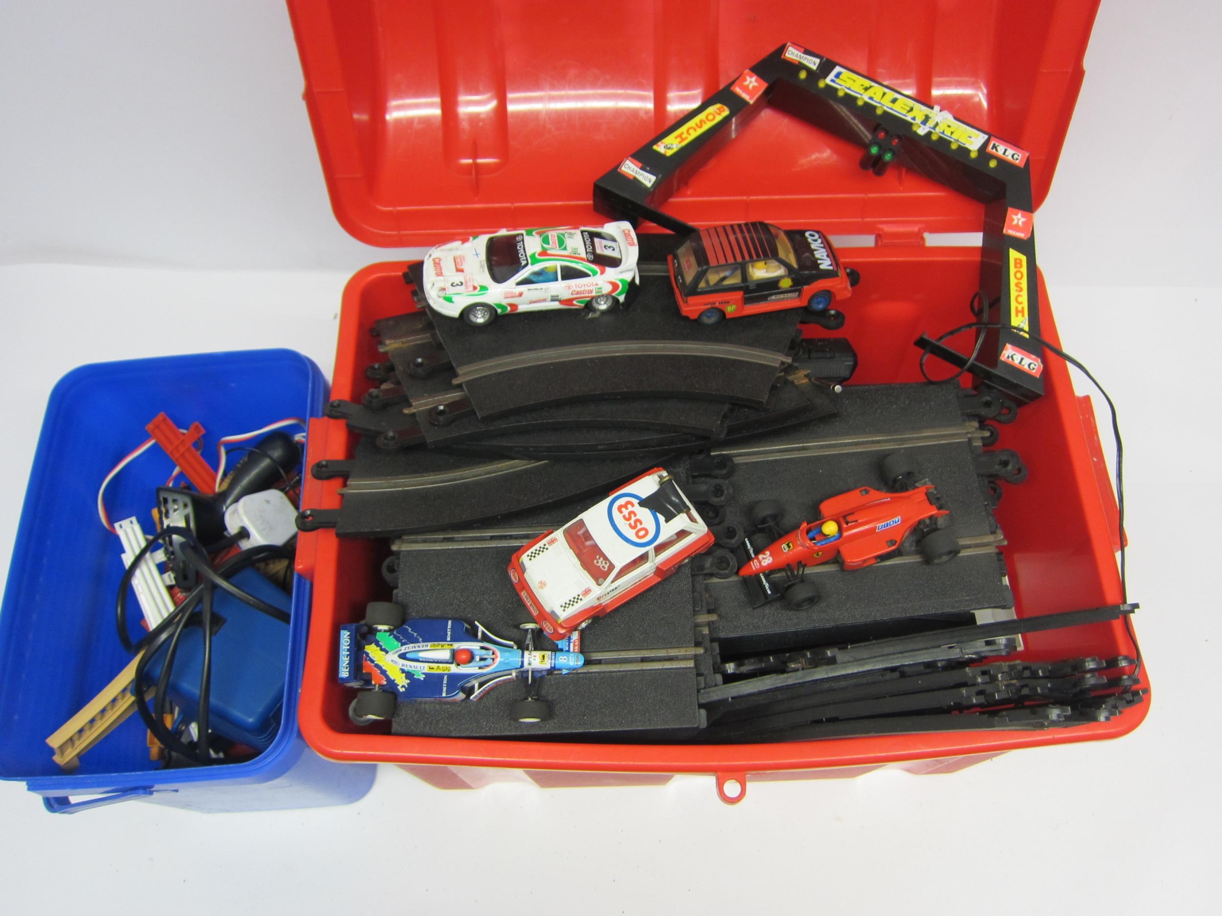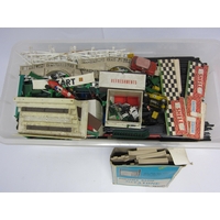 A collection of loose and playworn slot racing cars, track and accessories including Scalextric and SCX