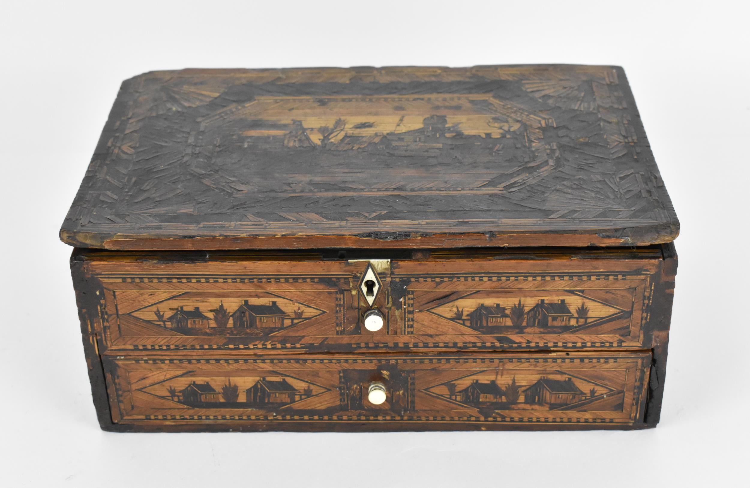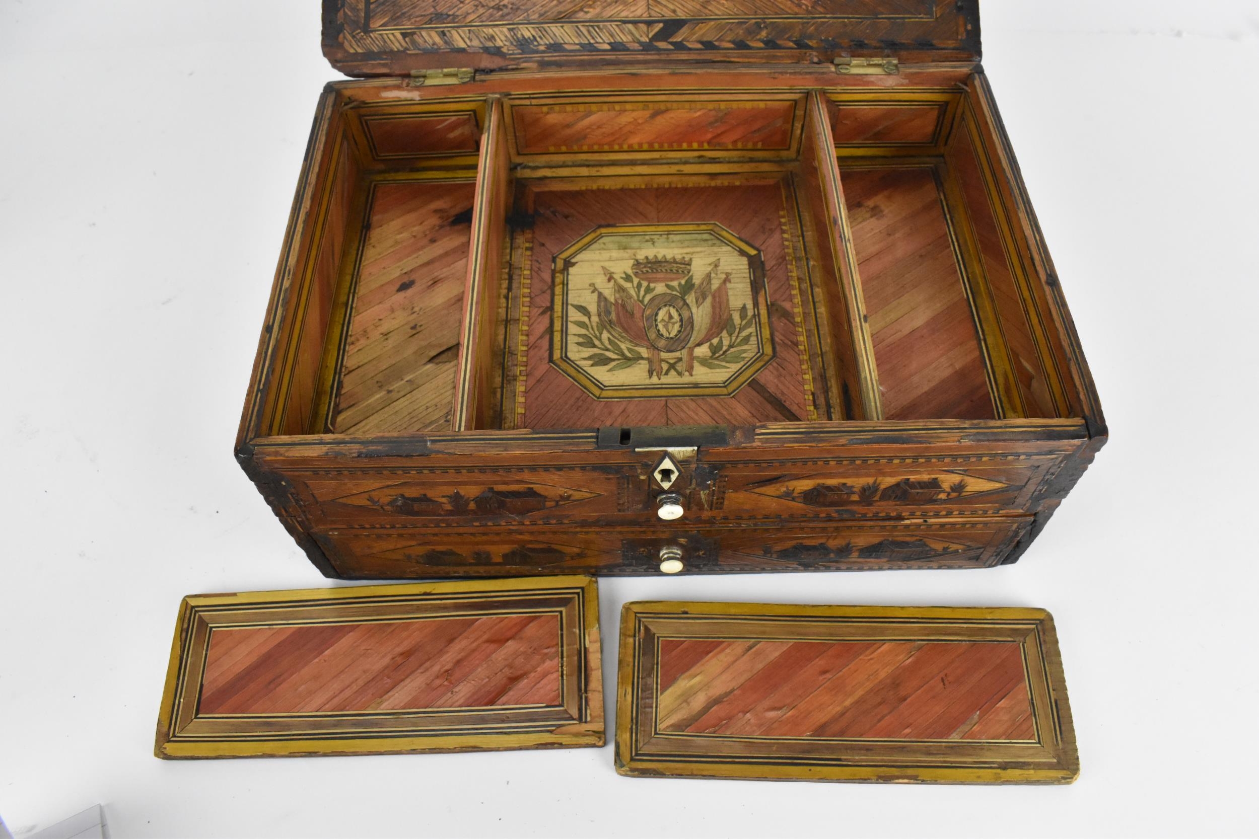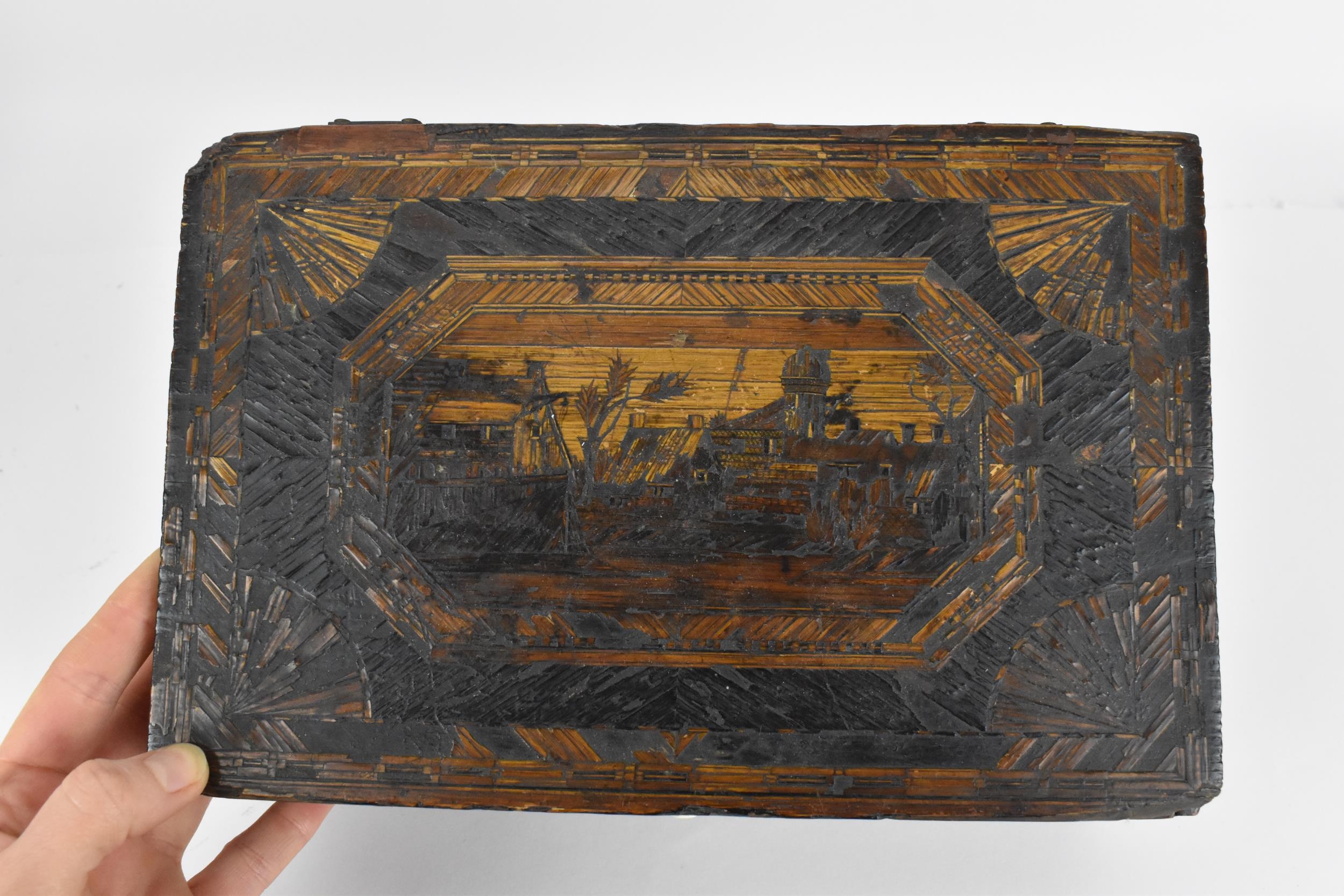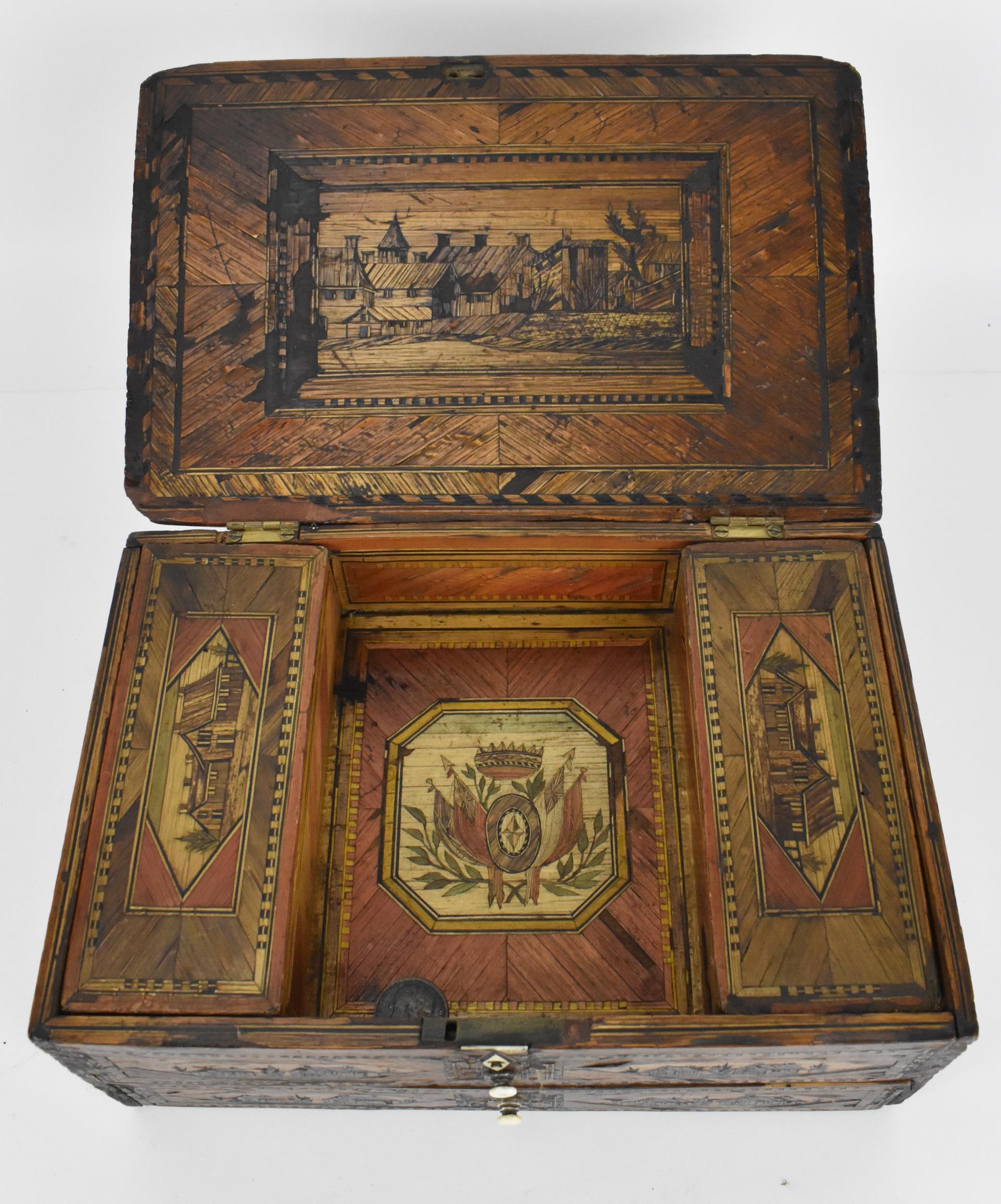 A Napoleonic prisoner of war straw work box, early 19th century, of rectangular form with straw marquetry, the front fitted with a drawer below a dummy drawer with bone handles and escutcheon, decorated to the top, front, sides and inside with building scenes, together with a single coin, believed to be a coin forgerie of a military guinea 1813 crude, the box 11 cm high x 26 cm wide x 17.5 cm deep