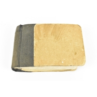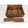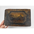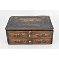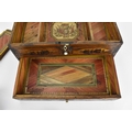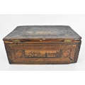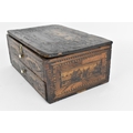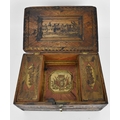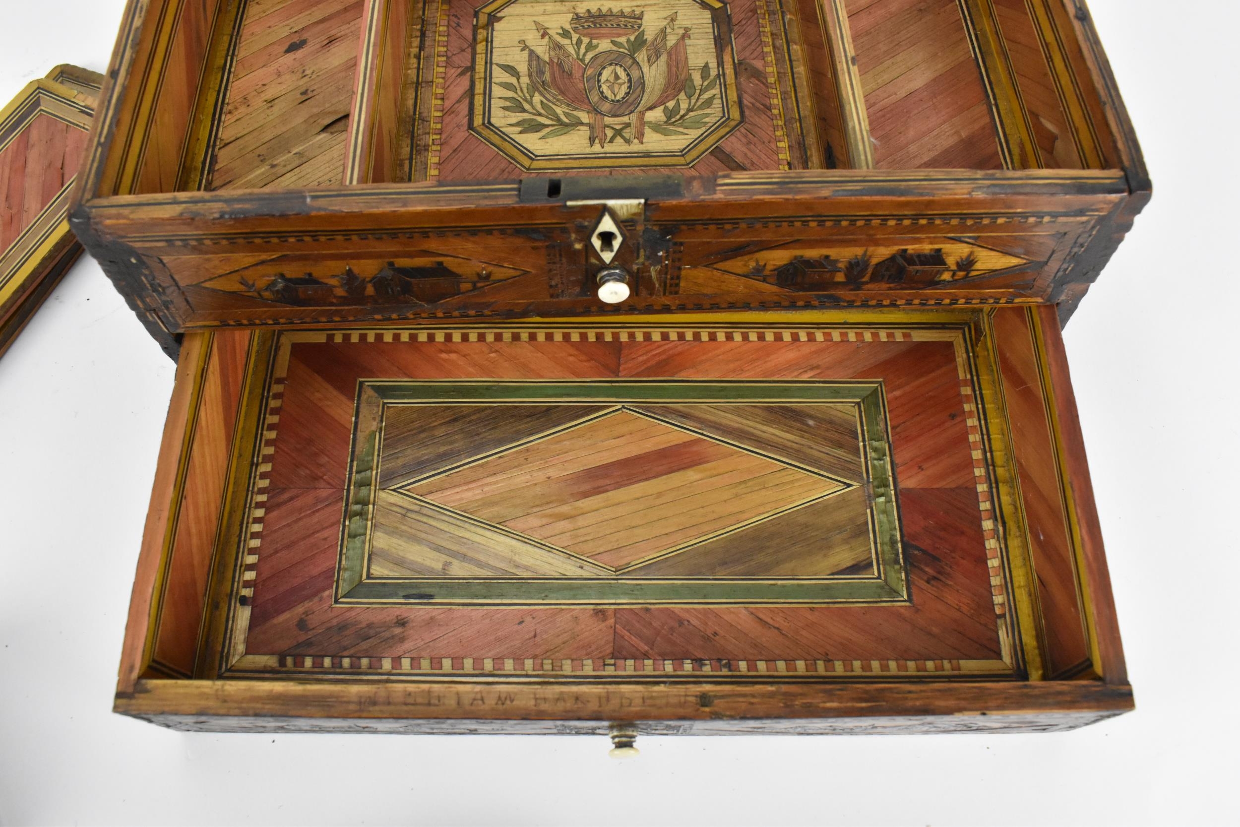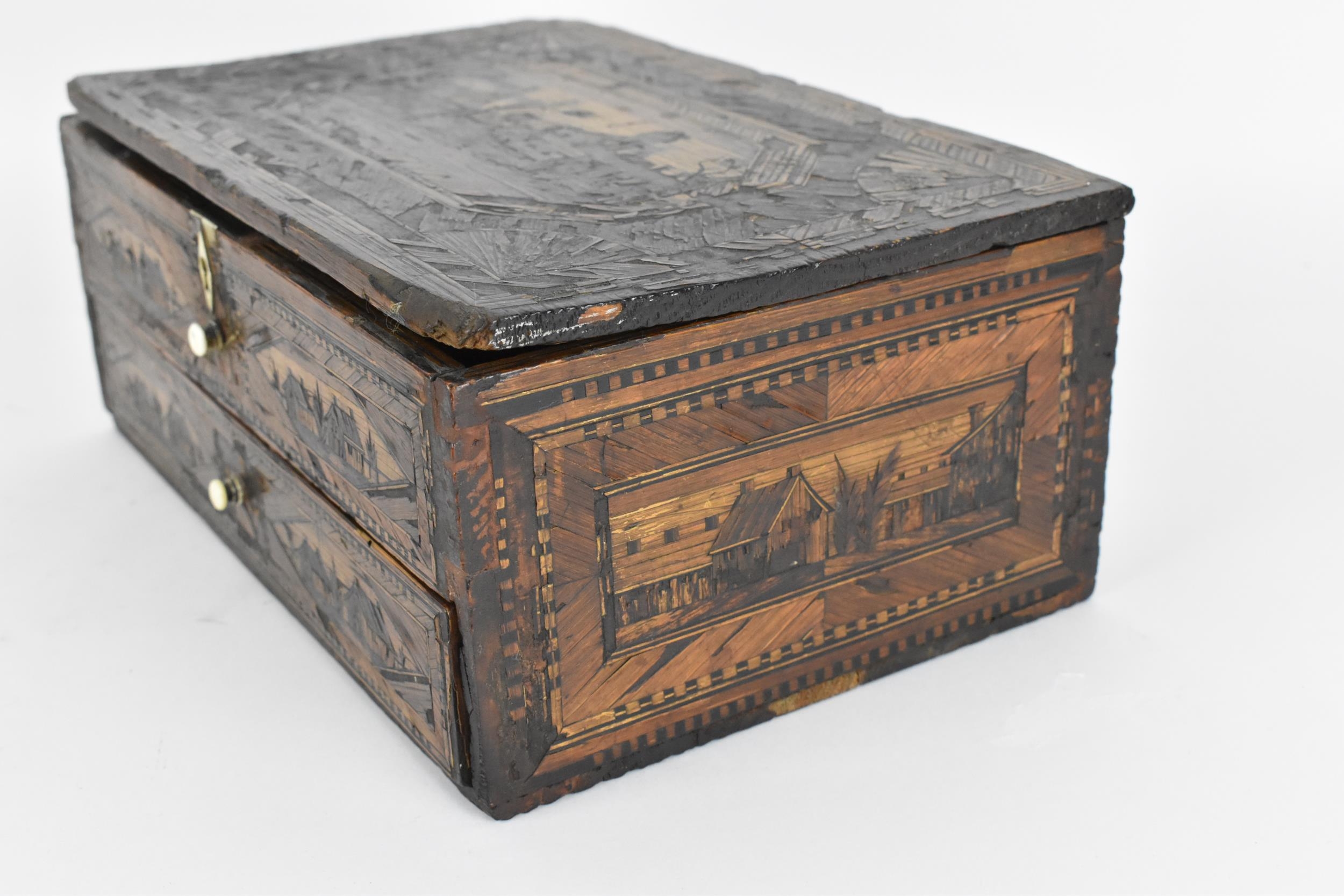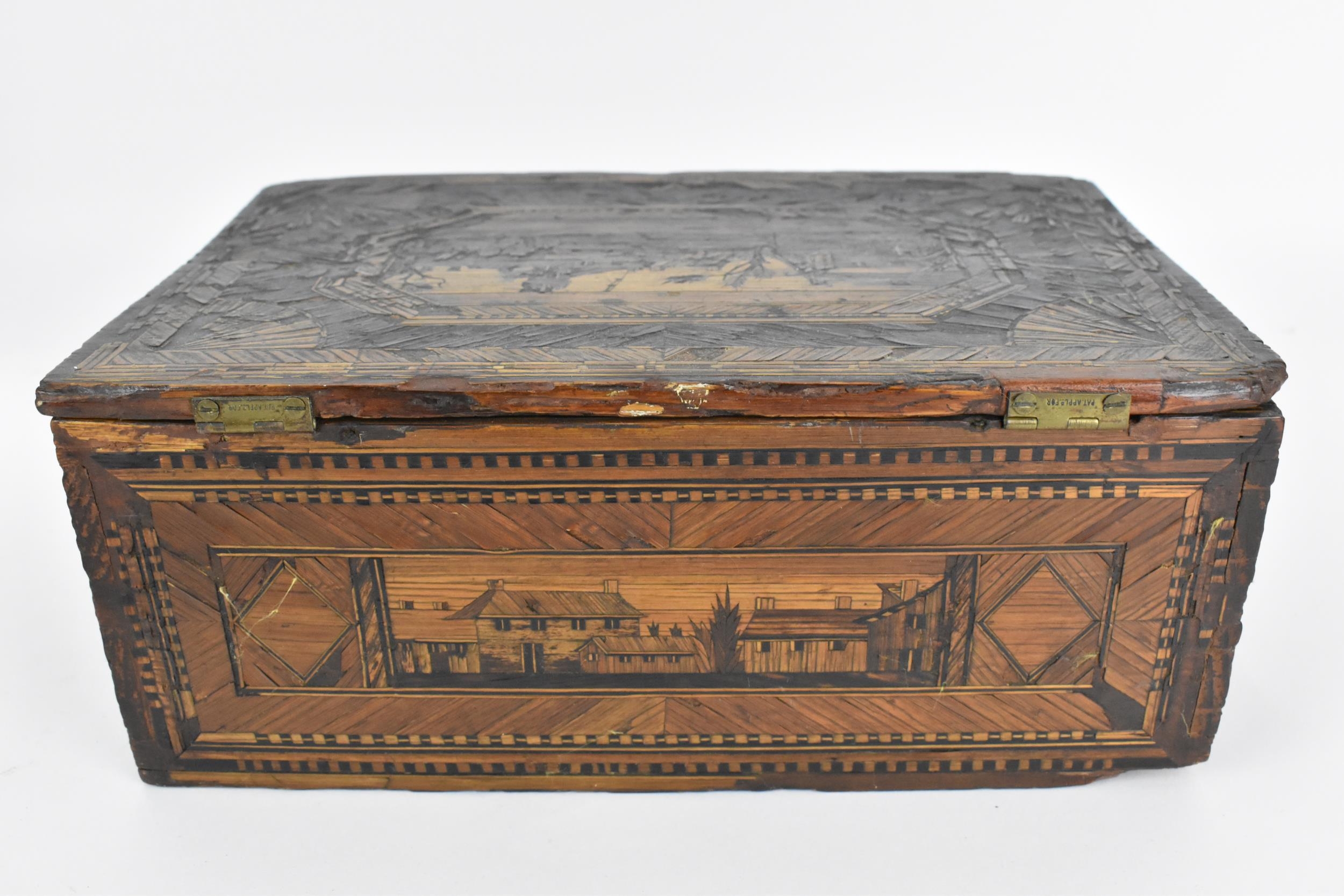 A Napoleonic prisoner of war straw work box, early 19th century, of rectangular form with straw marquetry, the front fitted with a drawer below a dummy drawer with bone handles and escutcheon, decorated to the top, front, sides and inside with building scenes, together with a single coin, believed to be a coin forgerie of a military guinea 1813 crude, the box 11 cm high x 26 cm wide x 17.5 cm deep