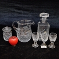 A mixed lot of crystal items including three Waterford Crystal sherry glasses, a Waterford Crystal preserve jar along with a Galway Crystal decanter and water pitcher. All in good condition with acid marks to base.