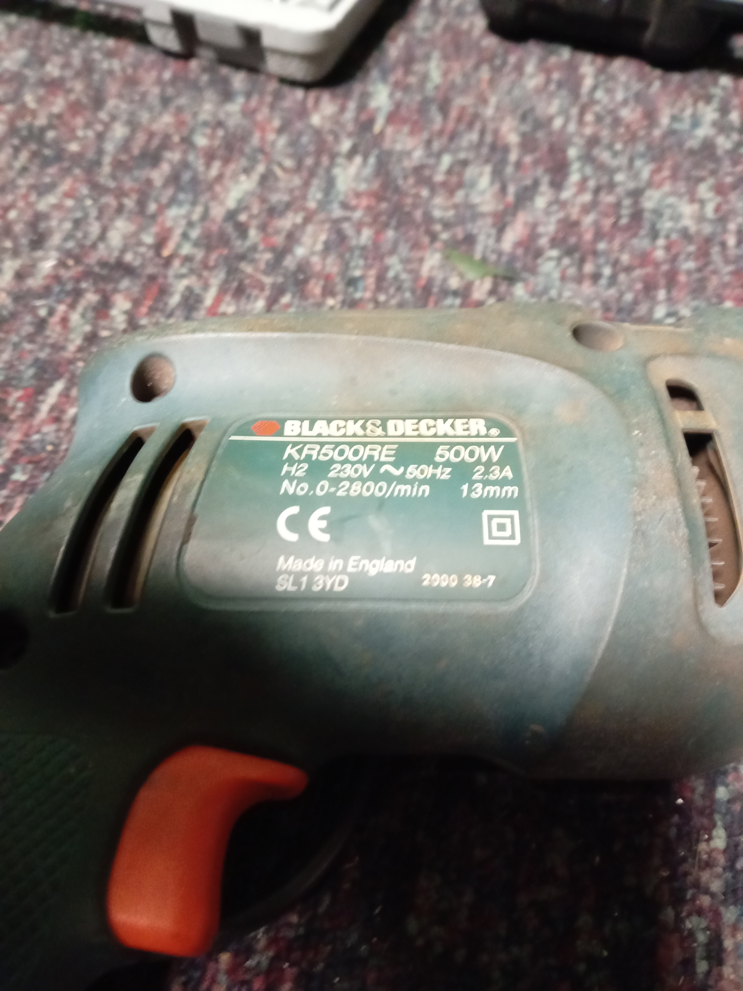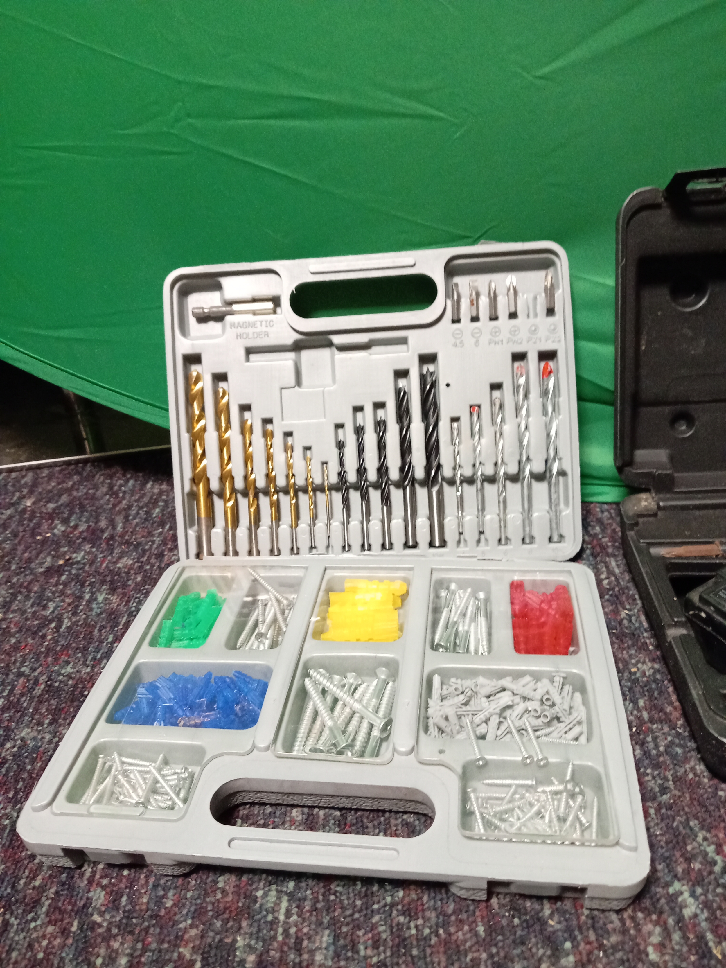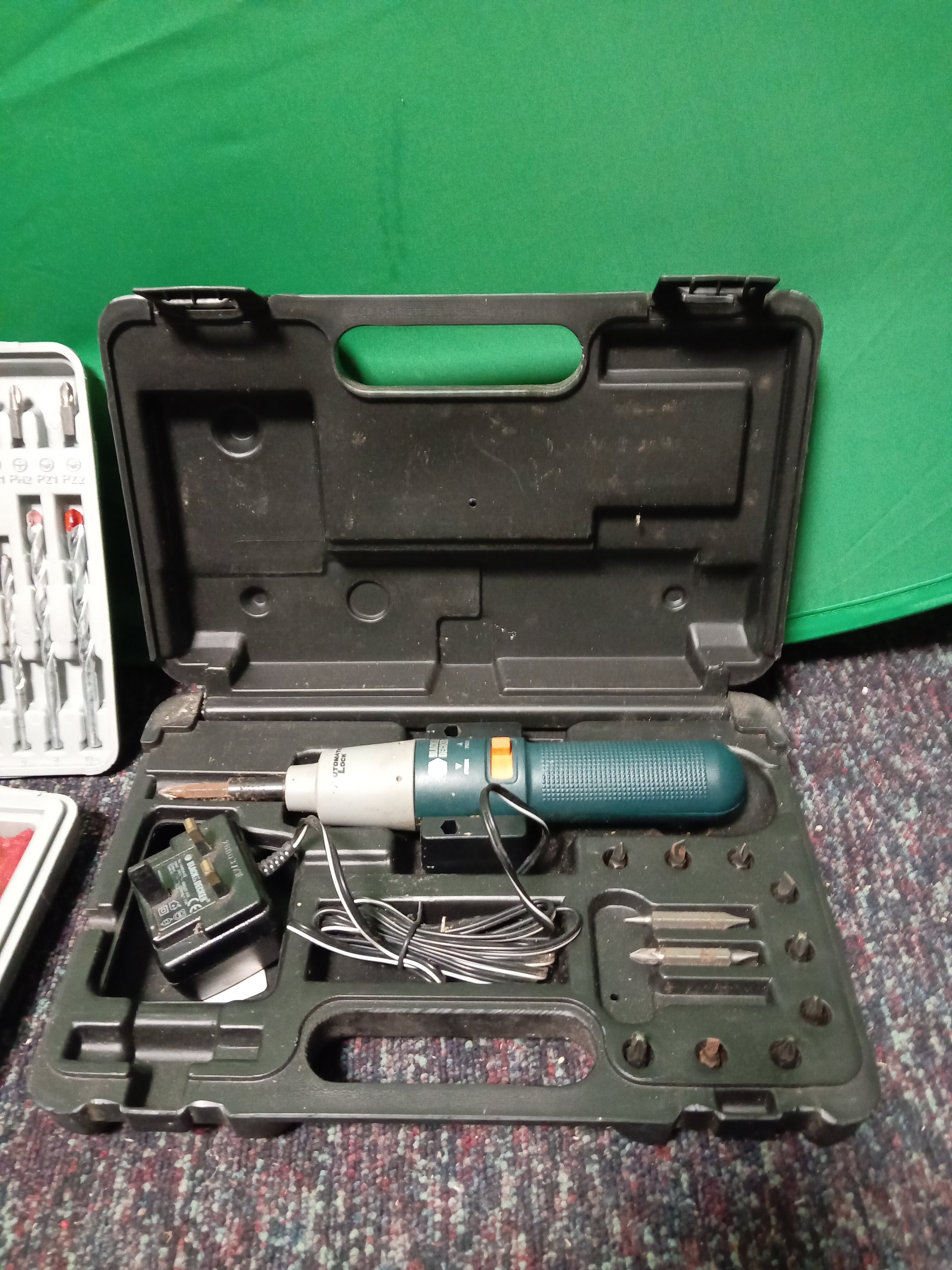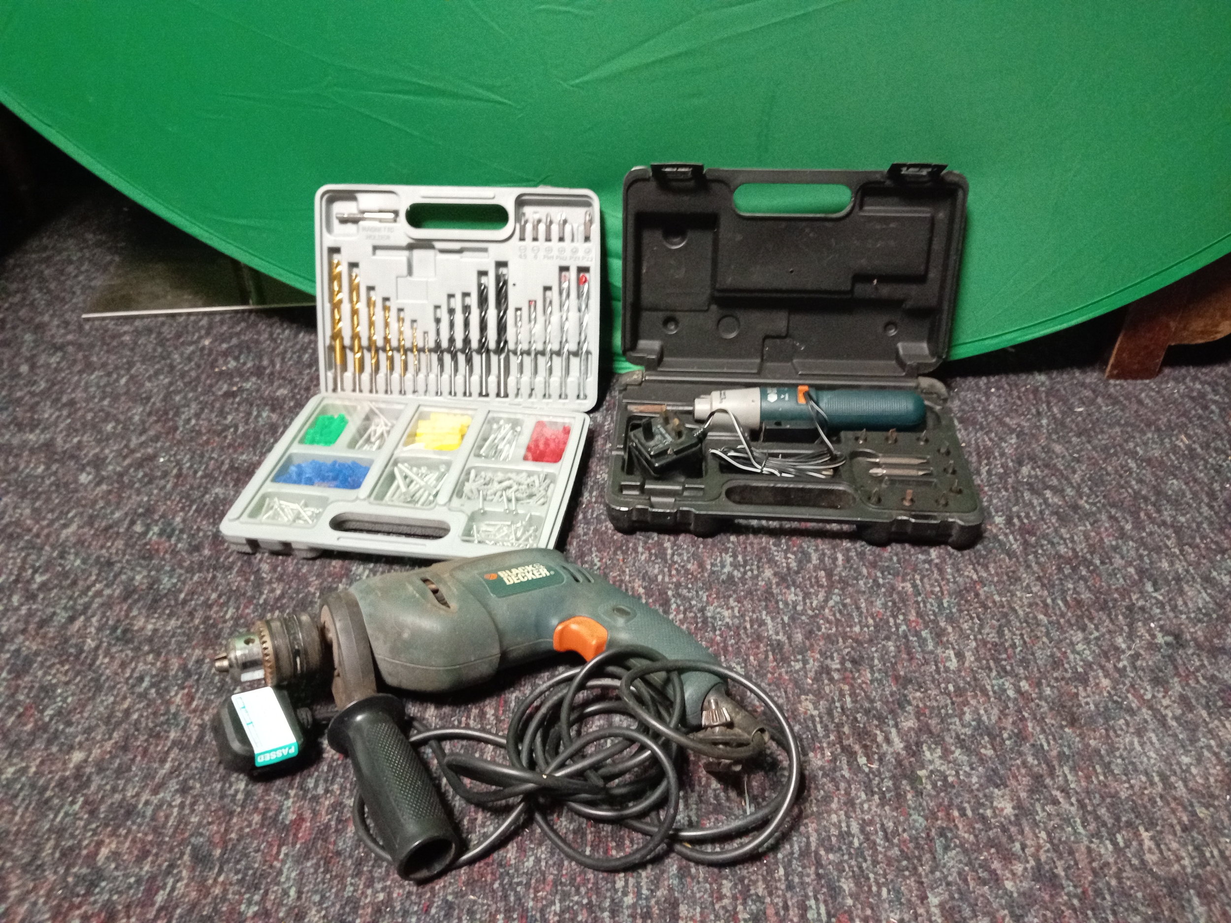 A black & decker corded electric hammer drill, bits & screws & a faulty black & decker screwdriver set.