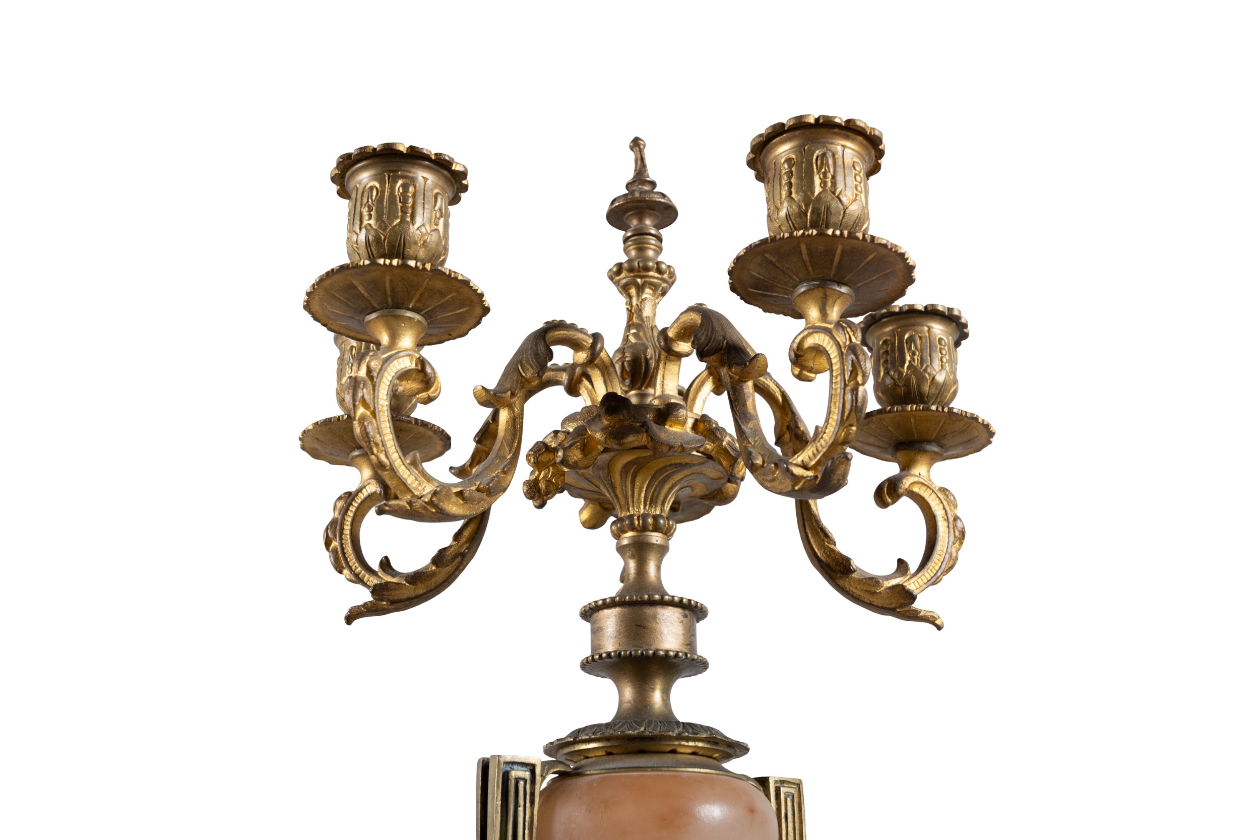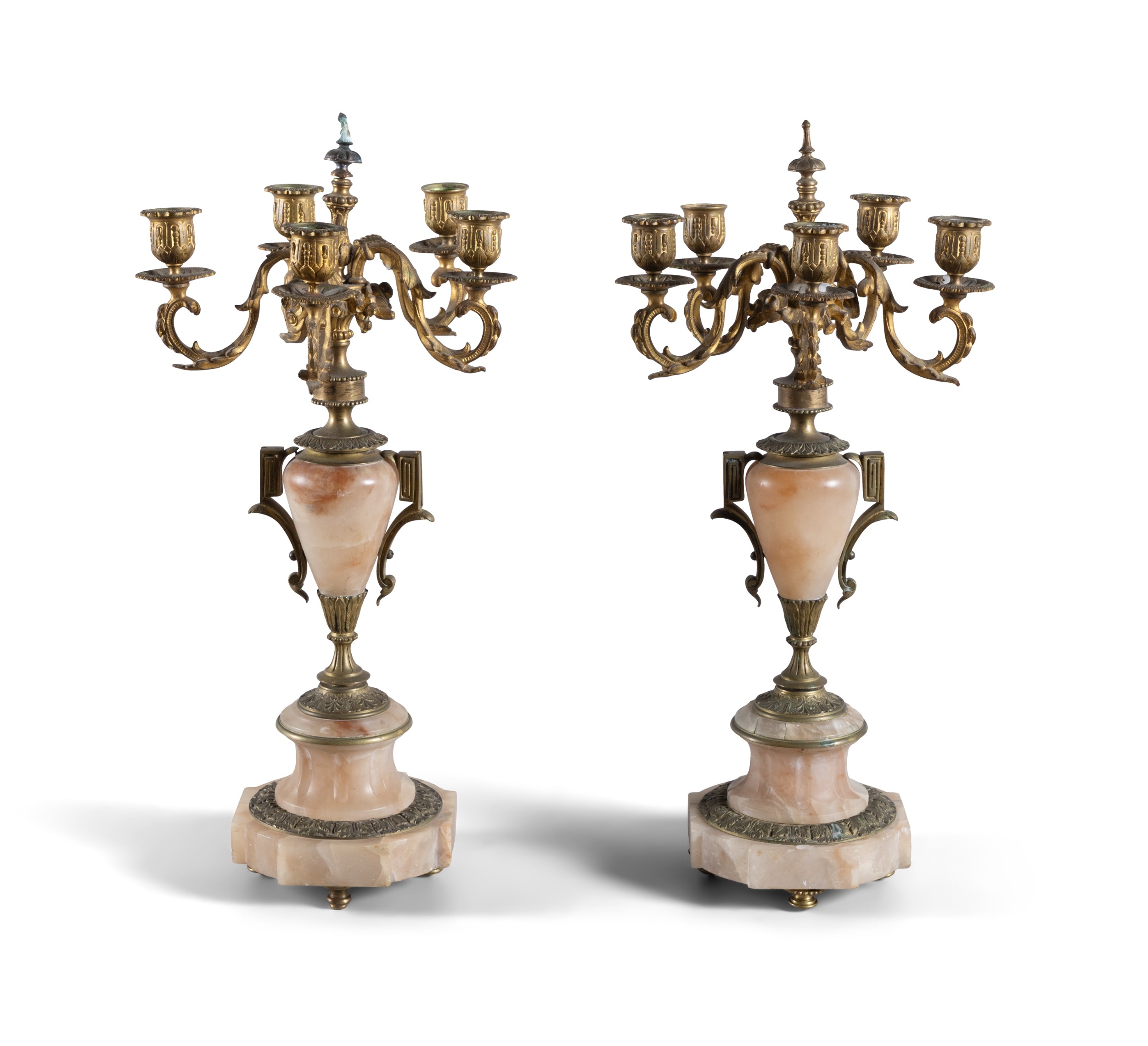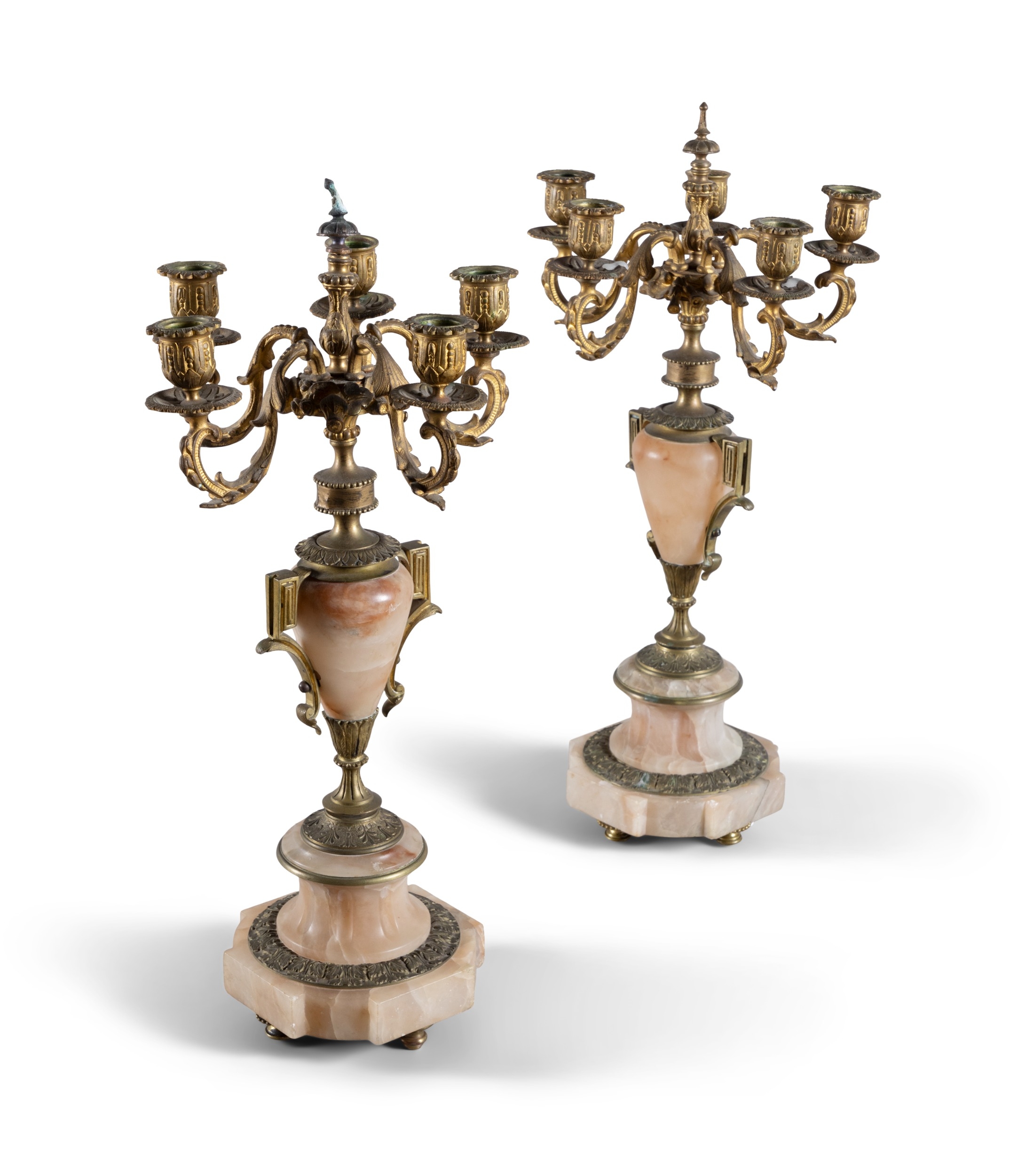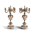 A PAIR OF ALABASTER AND GILT METAL FIVE-LIGHT CANDELABRA, 19TH CENTURY, (E) each with downswept acanthus branches, supported by alabaster centre in the form of an urn, raised on socle and shaped base, raised on four gilt metal feet. c.50cm high ELECTRICAL GOOD IN NEED OF REWIRING ARE INDICATED BY THE SYMBOL **'(E)'** These are sold as 'antiques' only and if bought for use, buyers must have them checked over for compliance with safety regulations by a qualified electrician before you use them. Adam's does not take responsibility for non-functioning electrical goods as most second-hand electrical items sold at auction require re-wiring even if functioning at the time of the auction viewing.