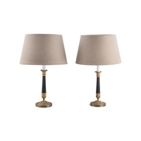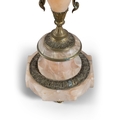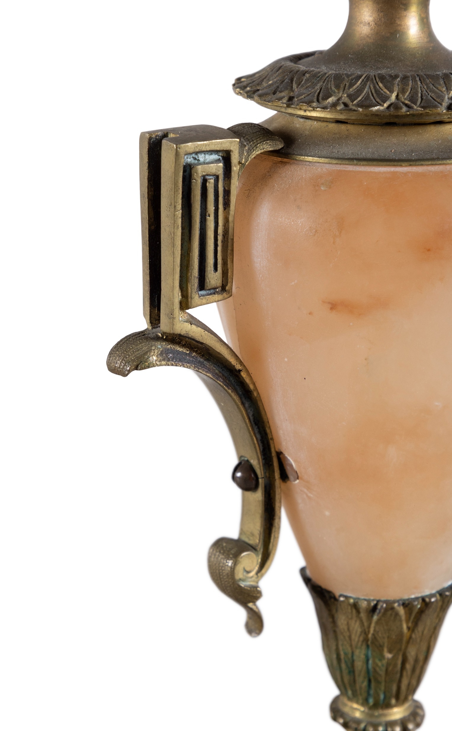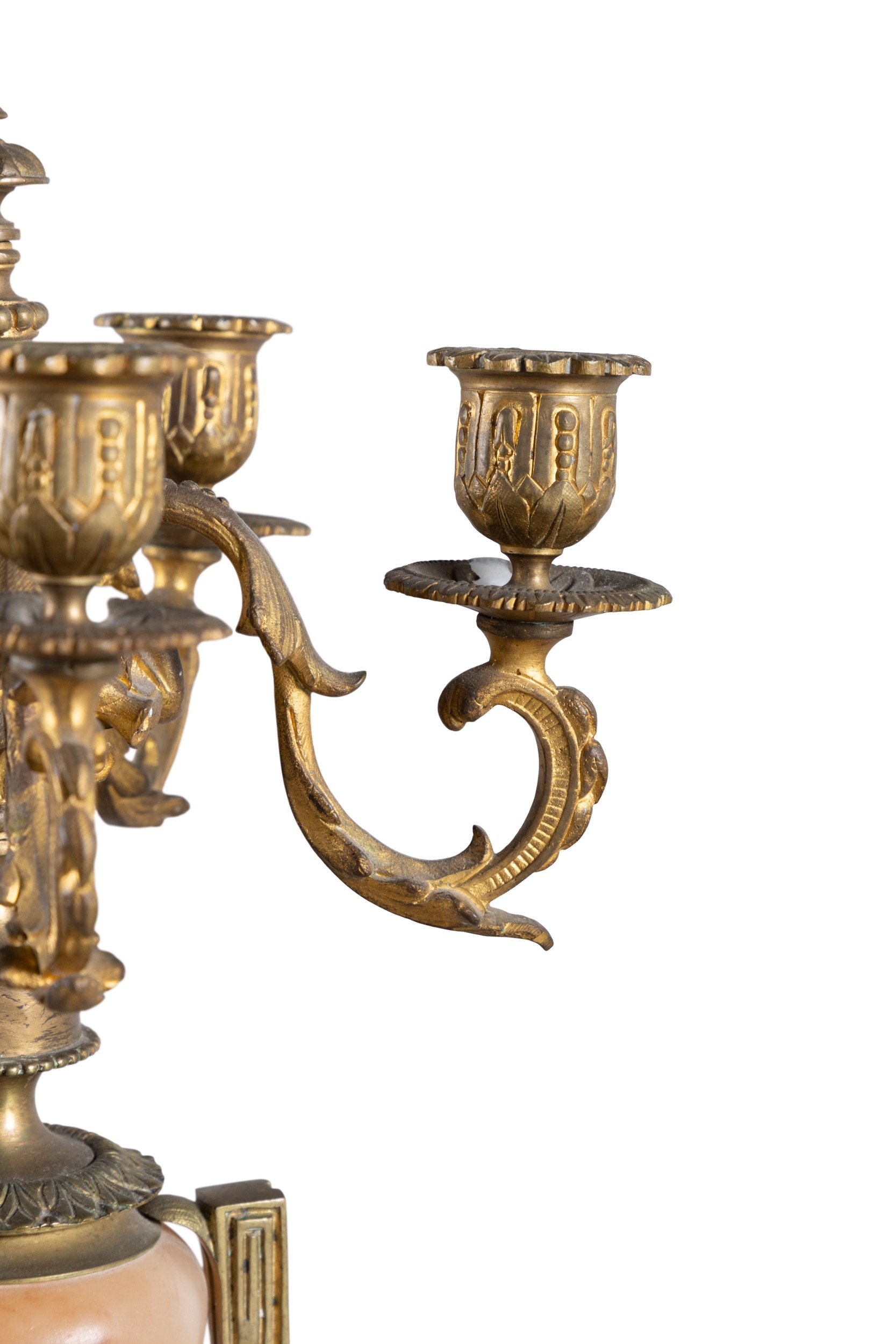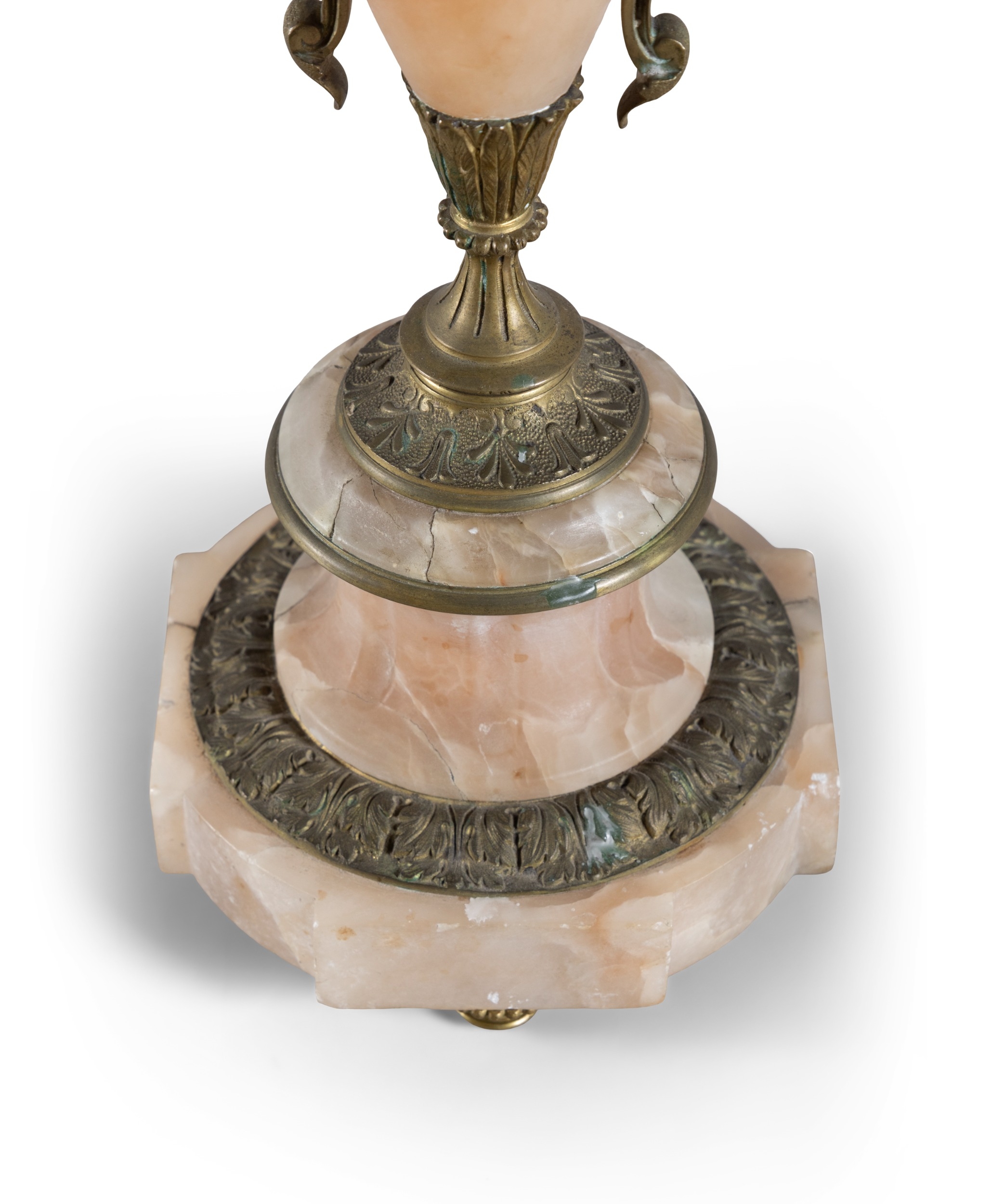 A PAIR OF ALABASTER AND GILT METAL FIVE-LIGHT CANDELABRA, 19TH CENTURY, (E) each with downswept acanthus branches, supported by alabaster centre in the form of an urn, raised on socle and shaped base, raised on four gilt metal feet. c.50cm high ELECTRICAL GOOD IN NEED OF REWIRING ARE INDICATED BY THE SYMBOL **'(E)'** These are sold as 'antiques' only and if bought for use, buyers must have them checked over for compliance with safety regulations by a qualified electrician before you use them. Adam's does not take responsibility for non-functioning electrical goods as most second-hand electrical items sold at auction require re-wiring even if functioning at the time of the auction viewing.
