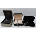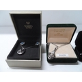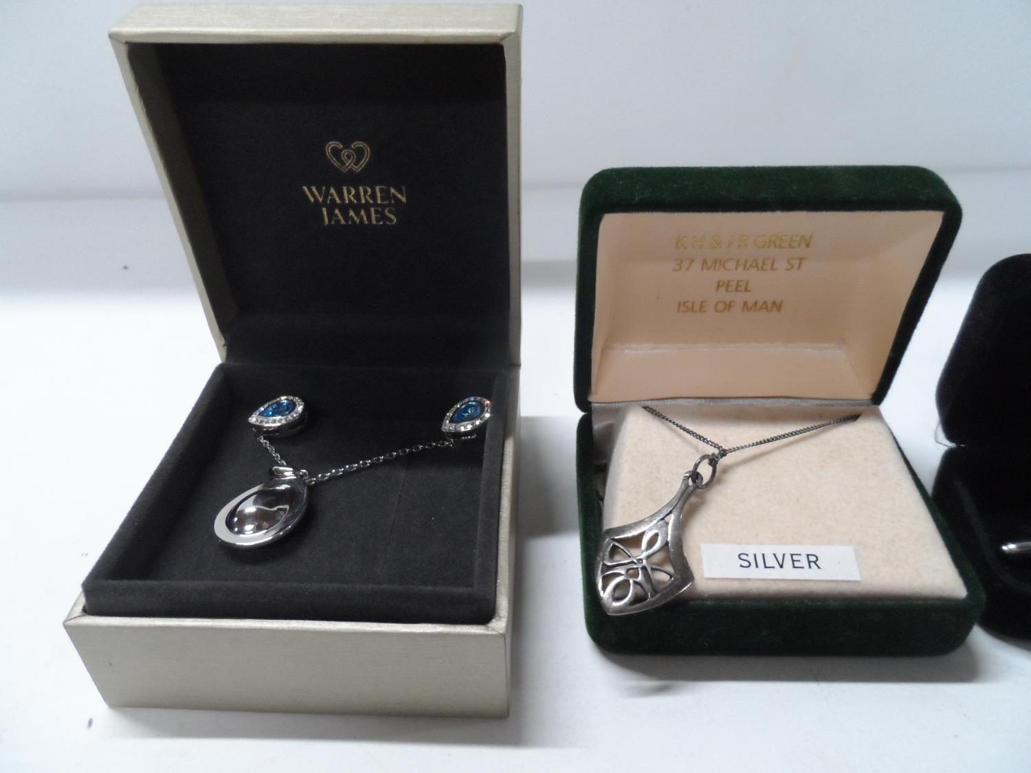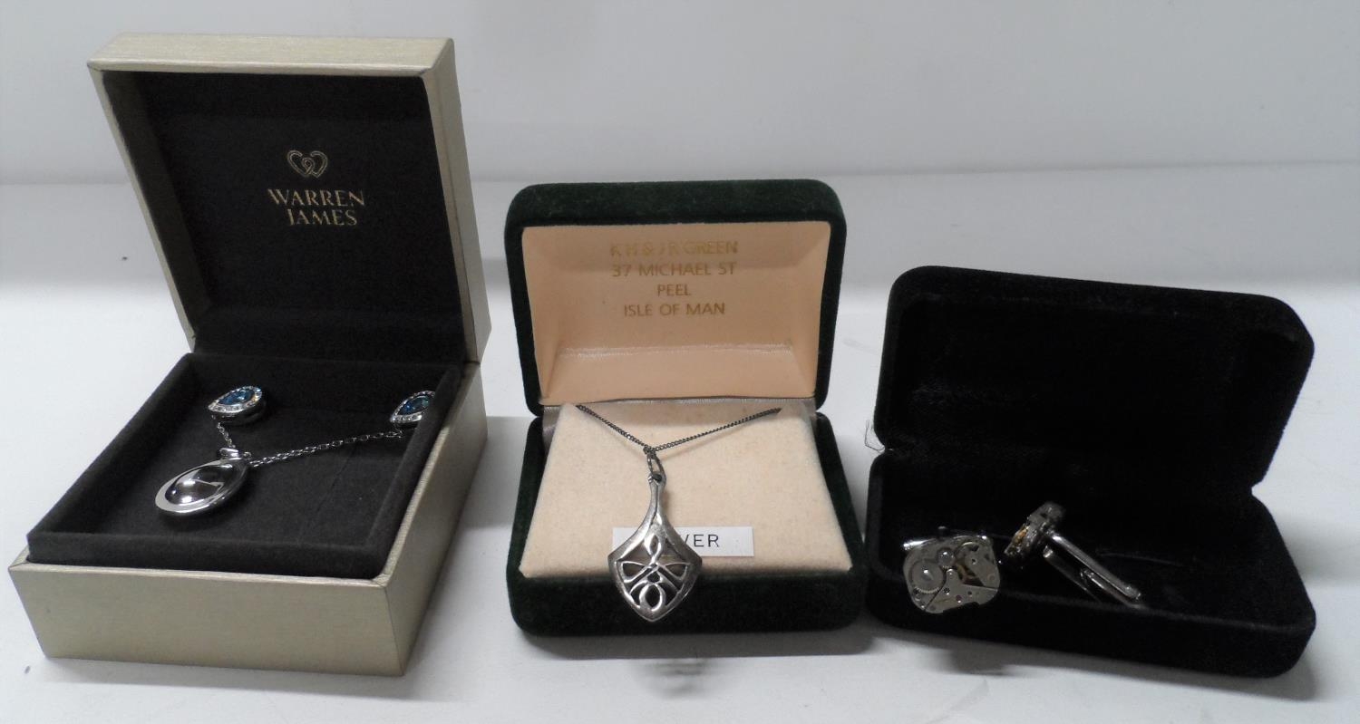 Boxed silver pendant and necklace together with a boxed necklace, pendant and earrings set from Warren James and a pair of gents modern cuff-links